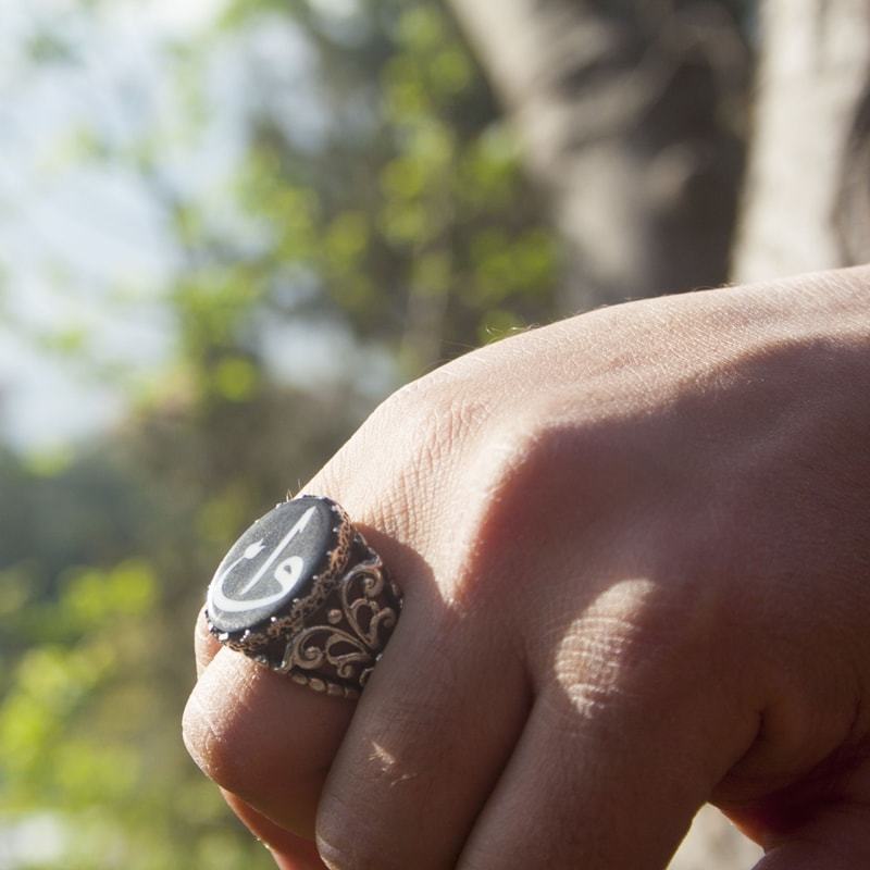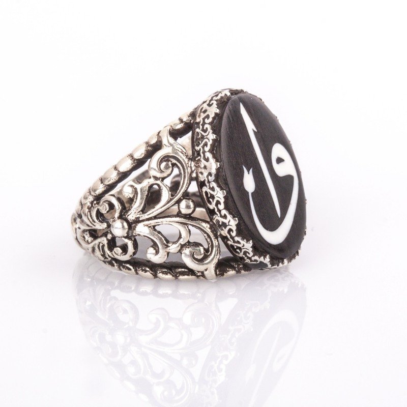 Yüzüğün merkezinde parıldayan doğal abanoz taşı, zengin tonları ve özgün deseni ile dikkat çekiyor. 925 ayar gümüş detaylar, abanoz taşını çevreleyerek yüzüğe modern ve şık bir hava katıyor. Usta el işçiliği ise vav ve elif harfi kakma detayları ile birleşerek bu yüzüğü benzersiz kılıyor.