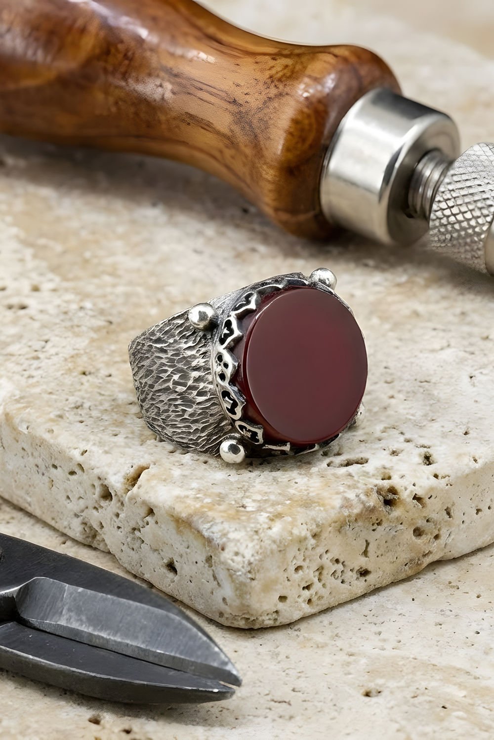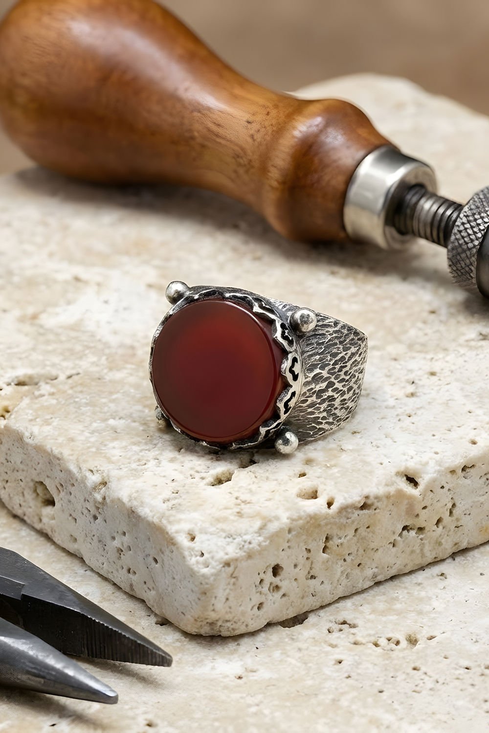 Ağaç Kabuğu Model El İşi Akik Taşlı Gümüş Yüzük |