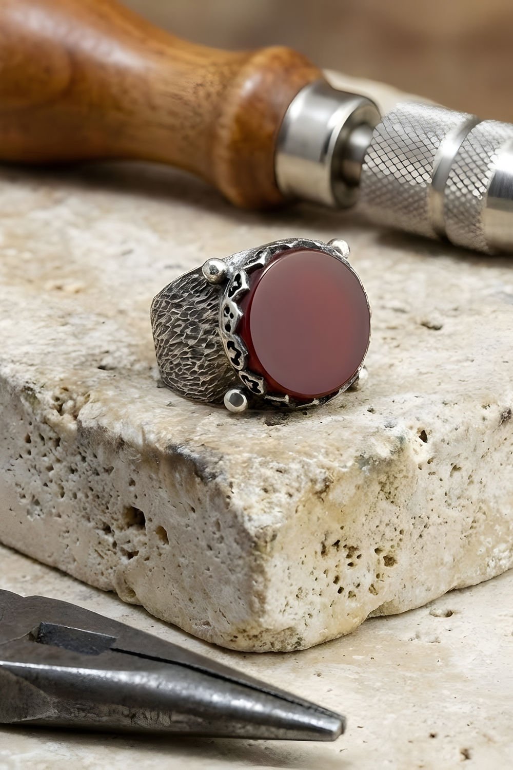 Ağaç Kabuğu Model El İşi Akik Taşlı Gümüş Yüzük