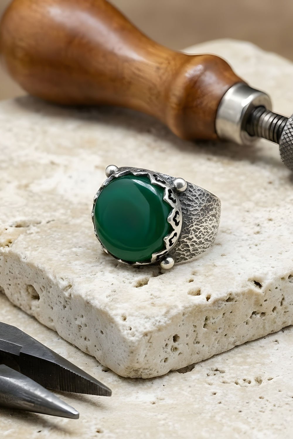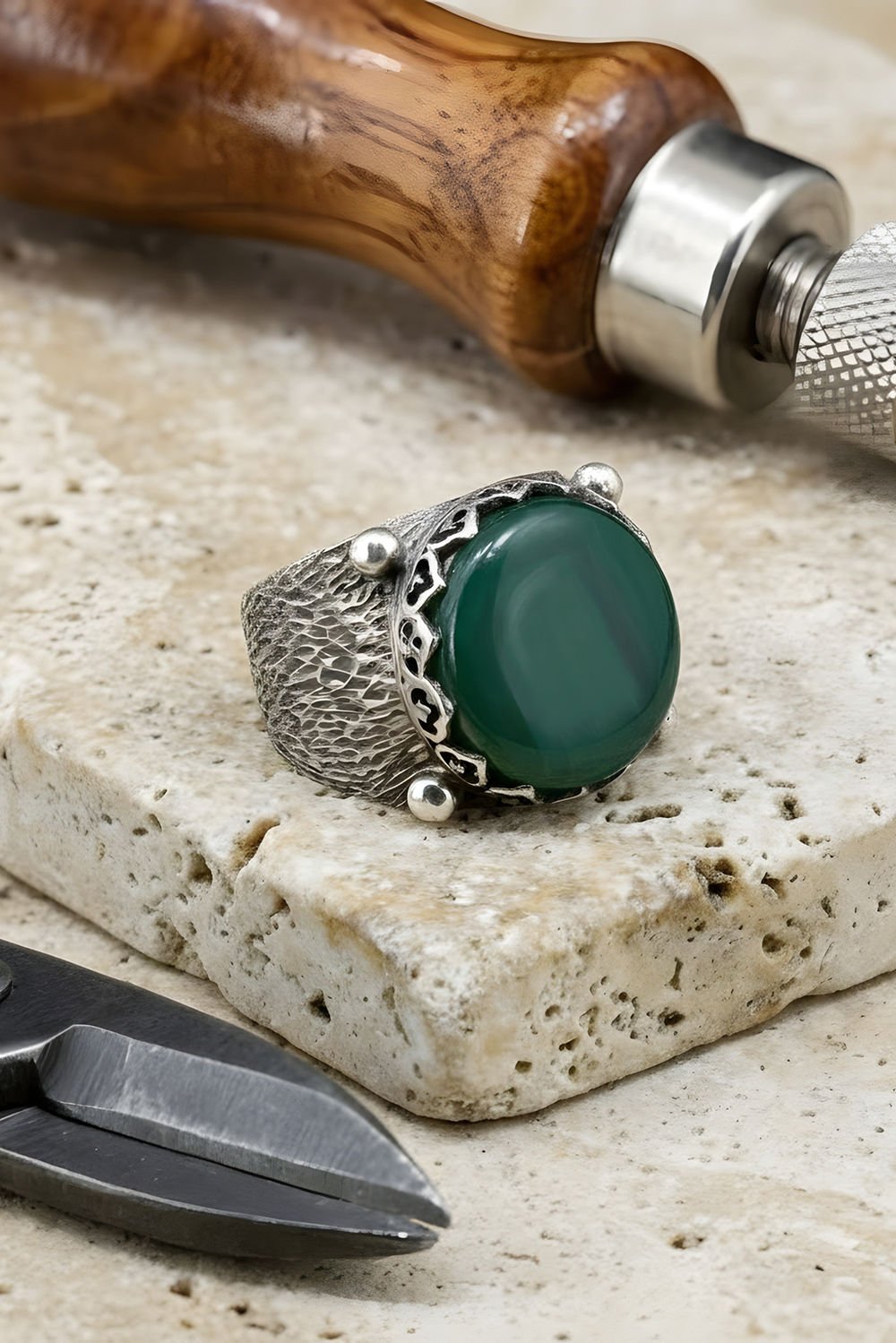 Ağaç Kabuğu Model El İşi Yeşil Akik Taşlı 925 Ayar Gümüş Yüzük