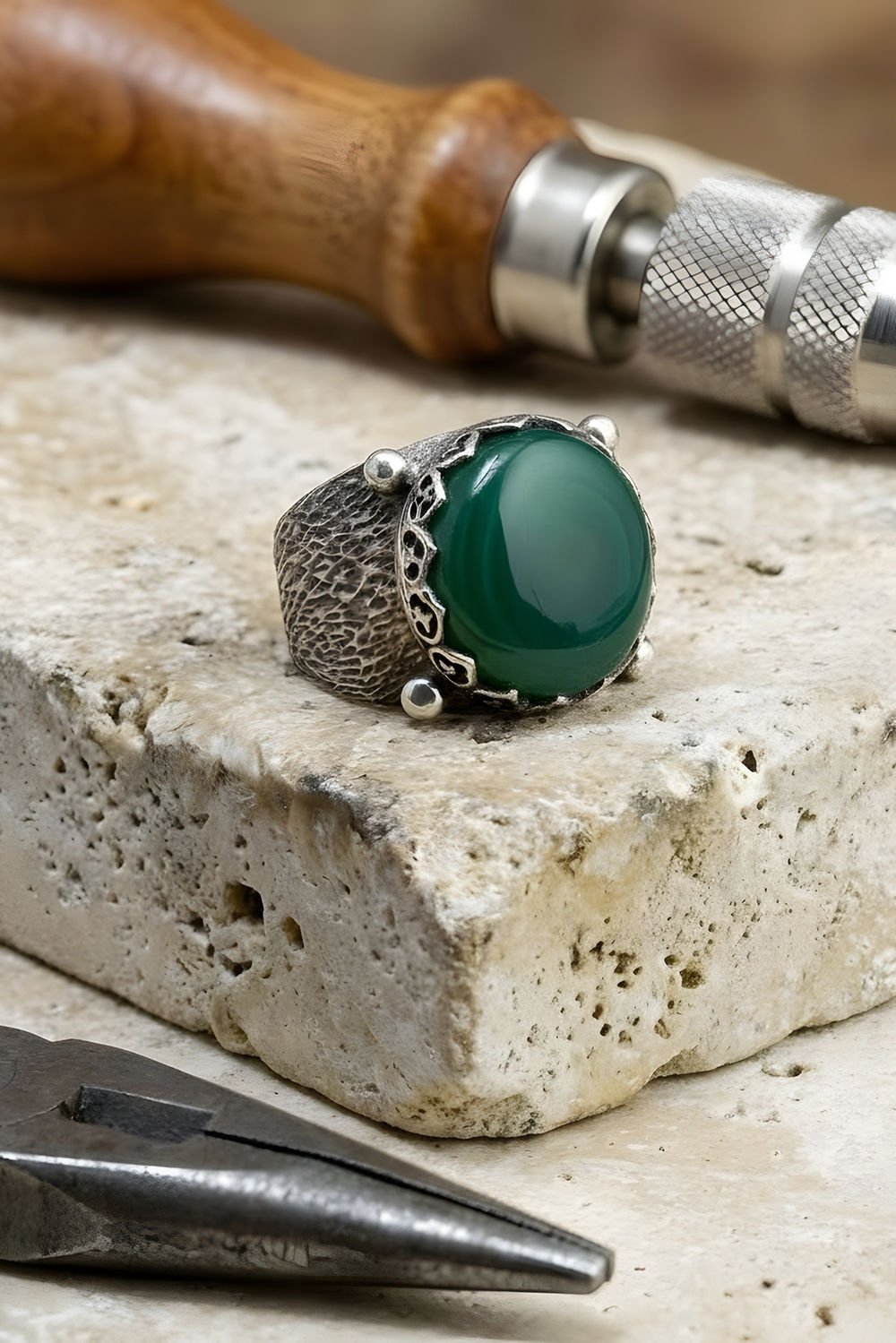 Ağaç Kabuğu Model El İşi Yeşil Akik Taşlı Gümüş Yüzük |