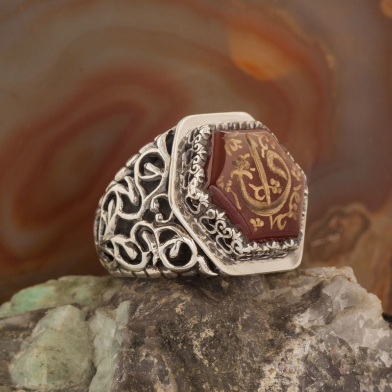 Altıgen Akik Taşı Vav Elif Kazıma El İşi Yüzük |