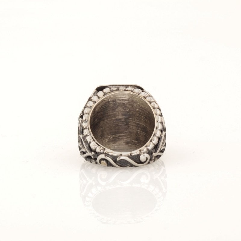 Gümüş erkek yüzük, natural akik taşı ile muazzam bir uyum içindedir. El işçiliği detayları, yüzüğünüzü diğerlerinden ayıran özel bir dokunuş ekler. Natural akik taşı, güç ve kararlılık sembolü olmasıyla bilinir, aynı zamanda estetik açıdan göz alıcıdır.