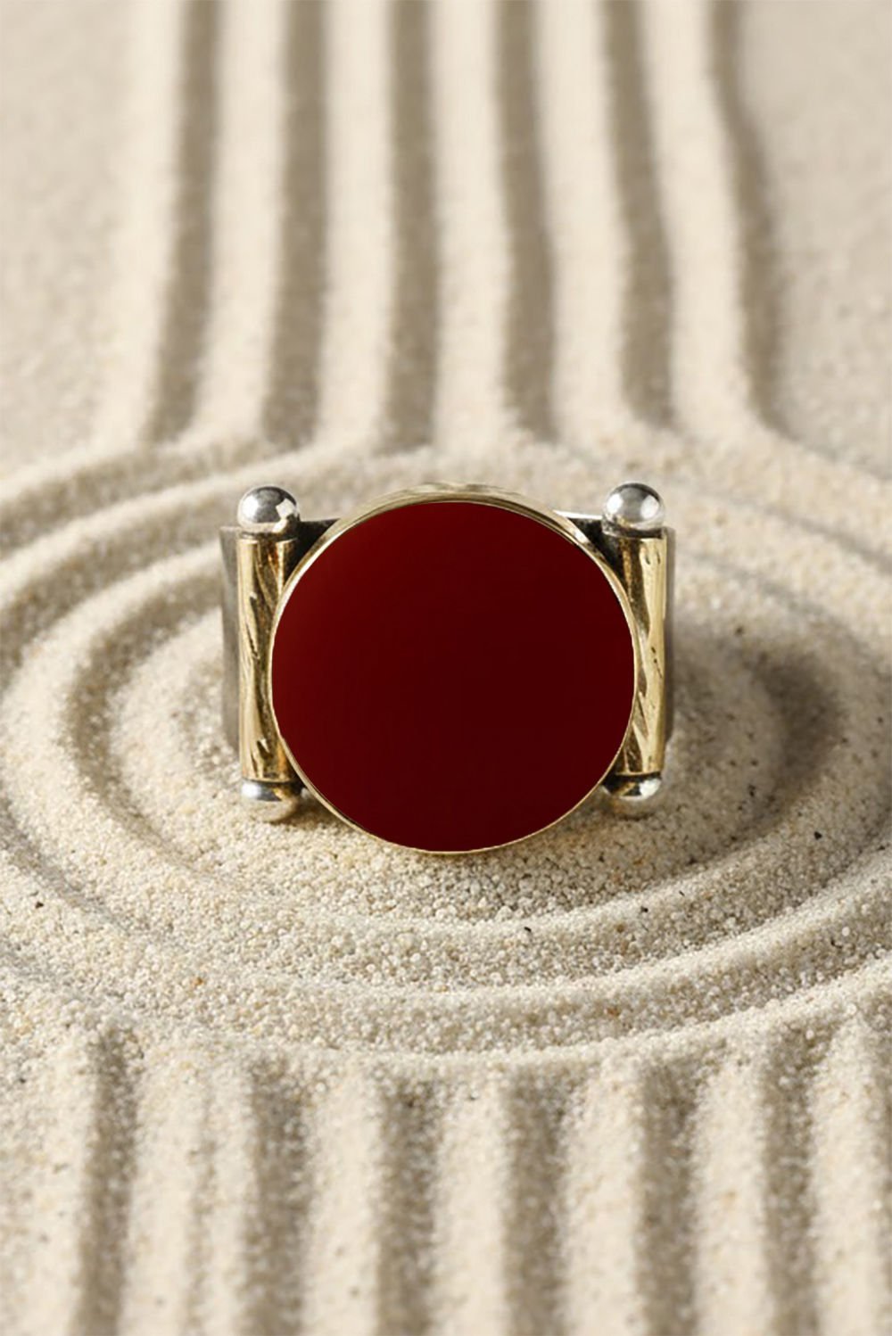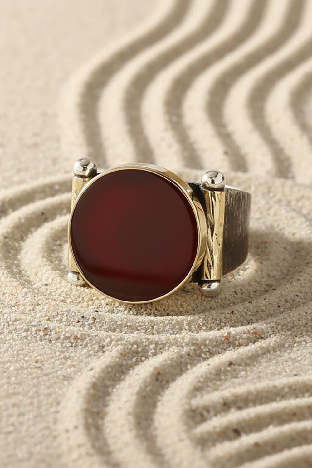 Hakiki ve orijinal doğal taşlar kullandığımız yüzüklerin bu modelinde klasik rengiyle Akik taşını kullanıyoruz.