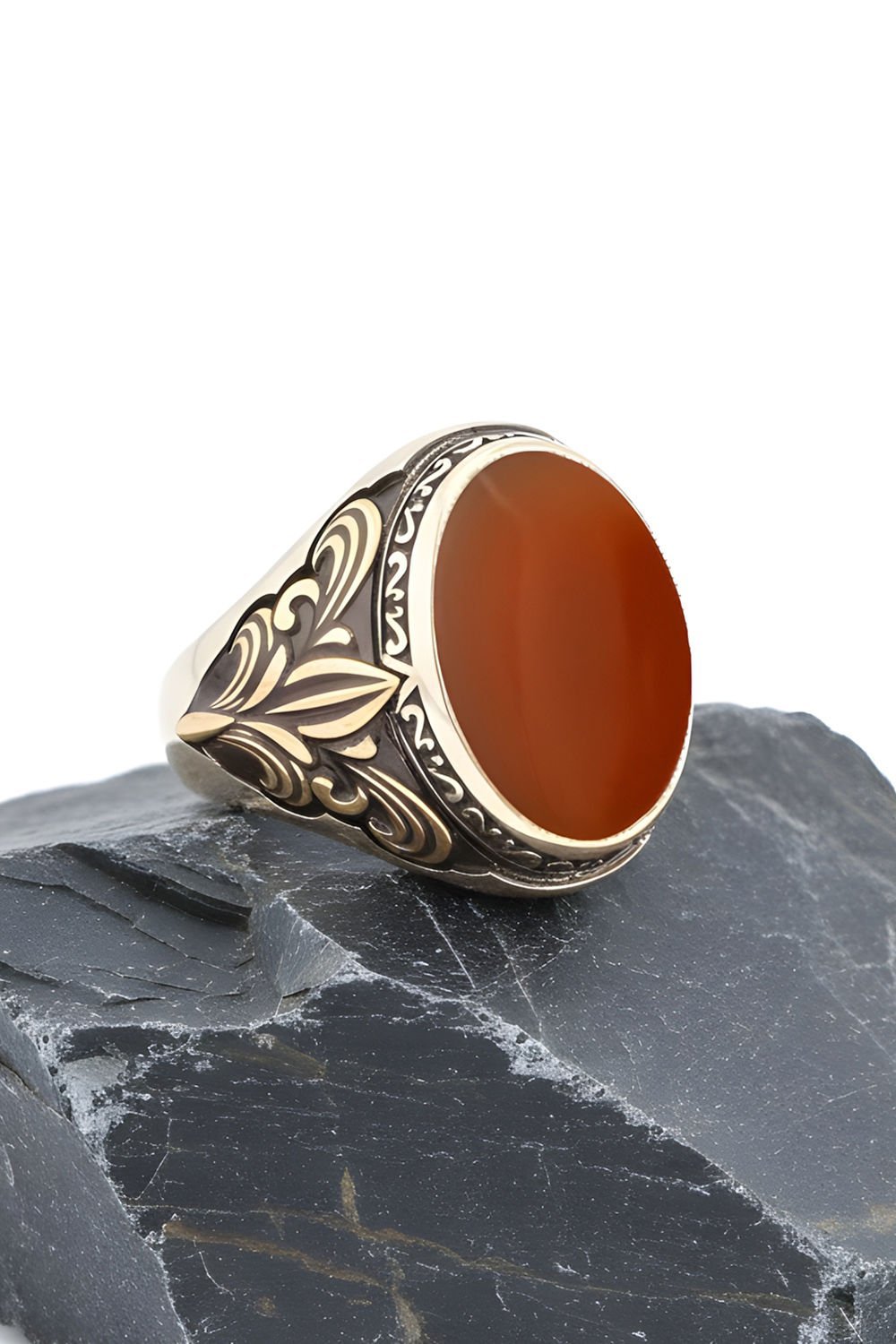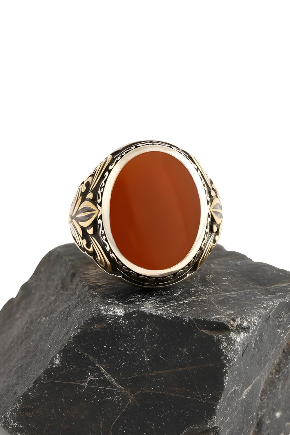 Hakiki ve orijinal doğal taşlar kullandığımız yüzüklerin bu modelinde klasik rengiyle Akik taşını kullanıyoruz.