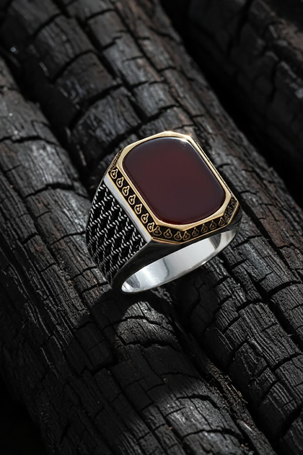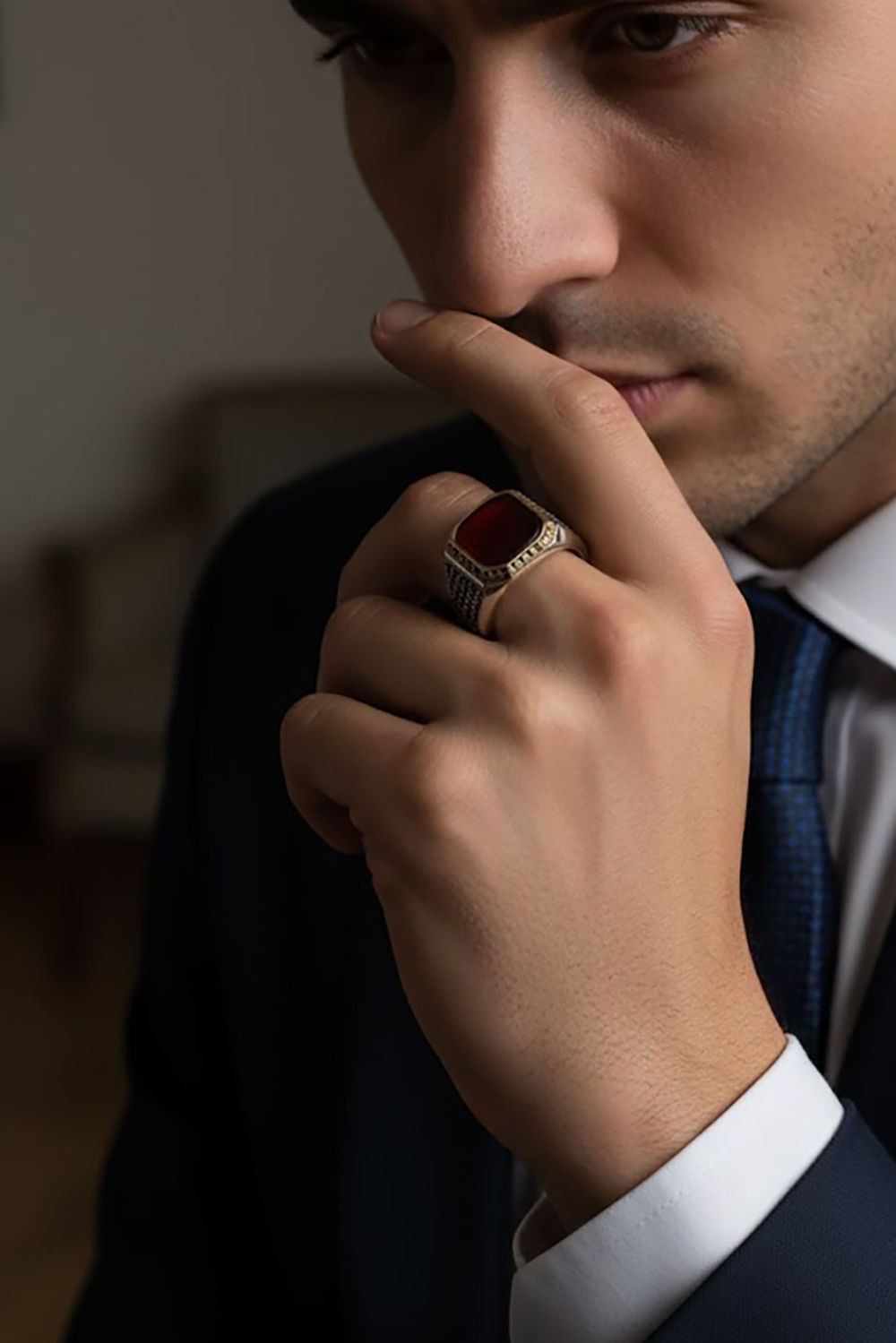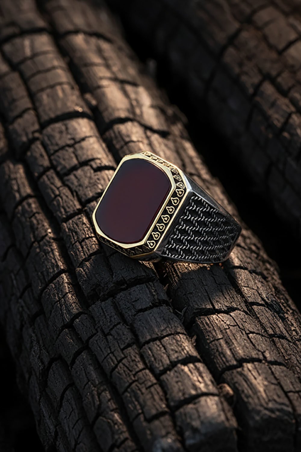 Bu özel erkek yüzüğü, doğal akik taşı ve 925 ayar gümüş ile ustaca işlenmiştir. El işçiliği ve özel tasarımıyla dikkat çekici bir parçadır.