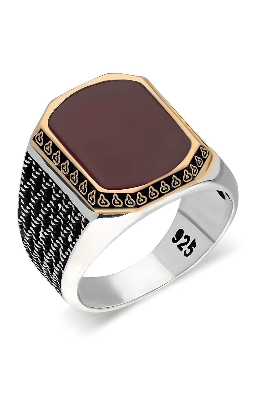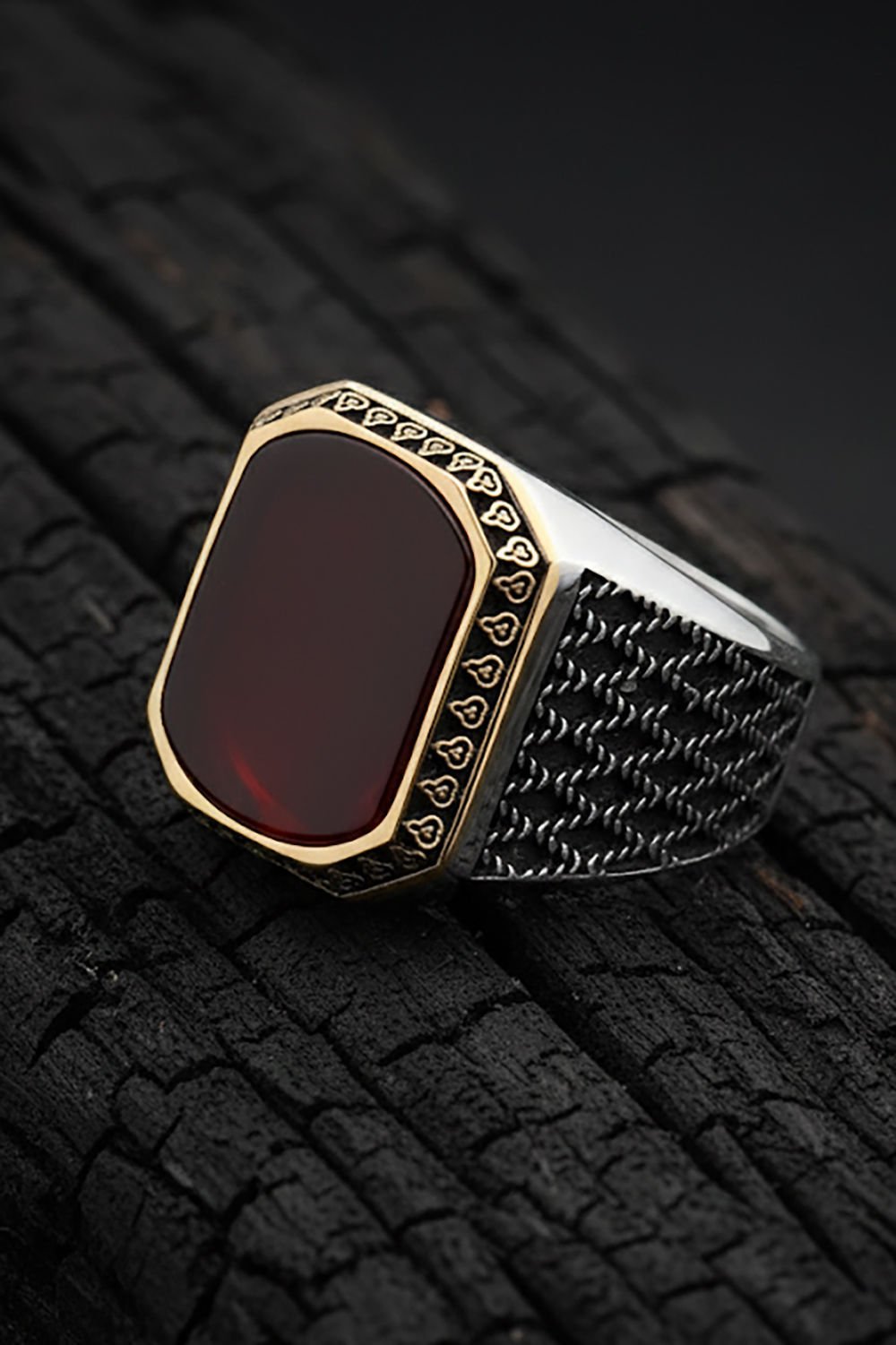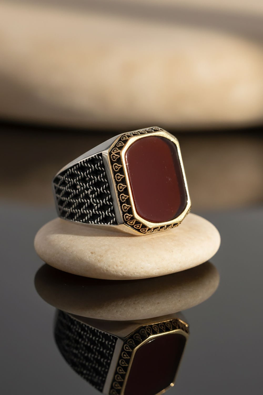 Bu özel erkek yüzüğü, doğal akik taşı ve 925 ayar gümüş ile ustaca işlenmiştir. El işçiliği ve özel tasarımıyla dikkat çekici bir parçadır.