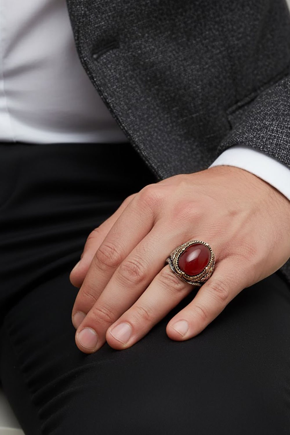 Bu özel erkek yüzüğü, doğal akik taşı ve 925 ayar gümüş ile özenle tasarlanmıştır. Sade ve zarif tasarımıyla öne çıkar.