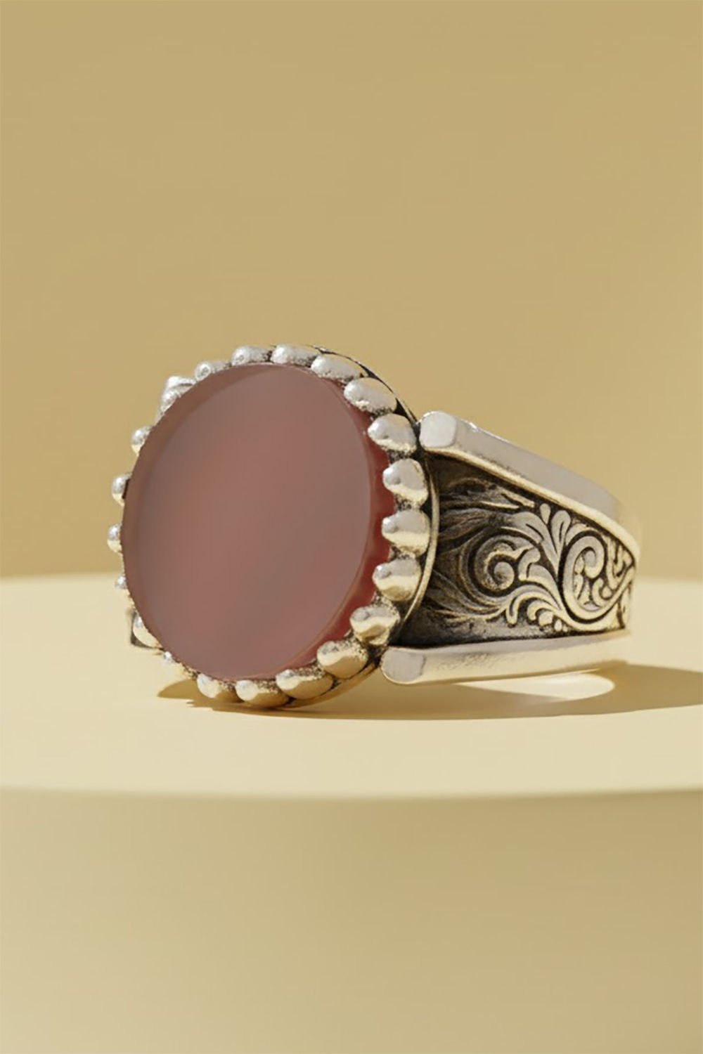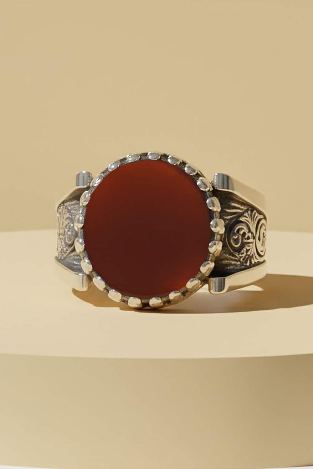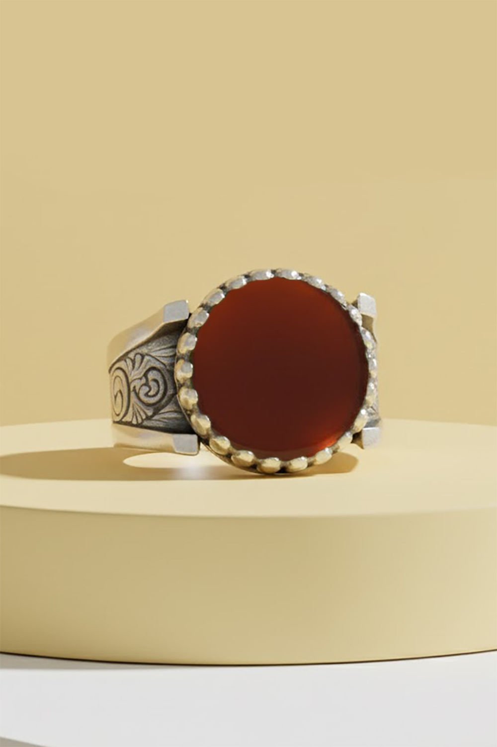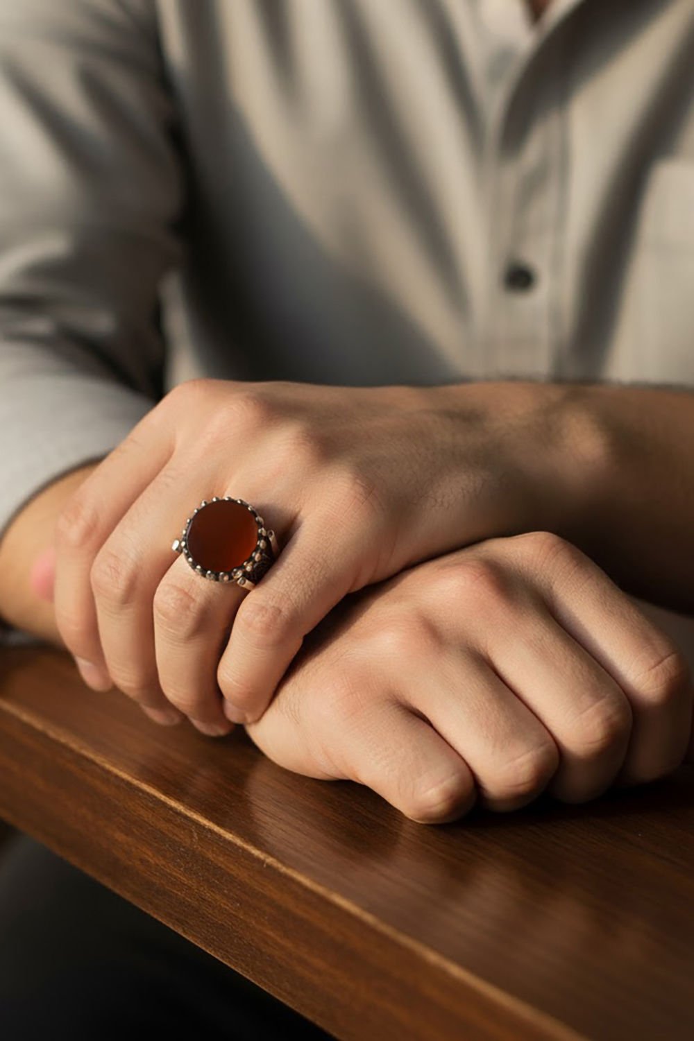 Hakiki ve orijinal doğal taşlar kullandığımız yüzüklerin bu modelinde klasik rengiyle Akik taşını kullanıyoruz.