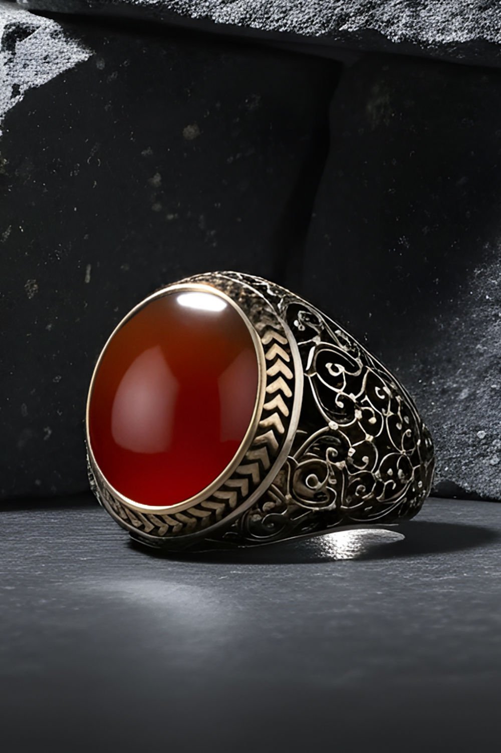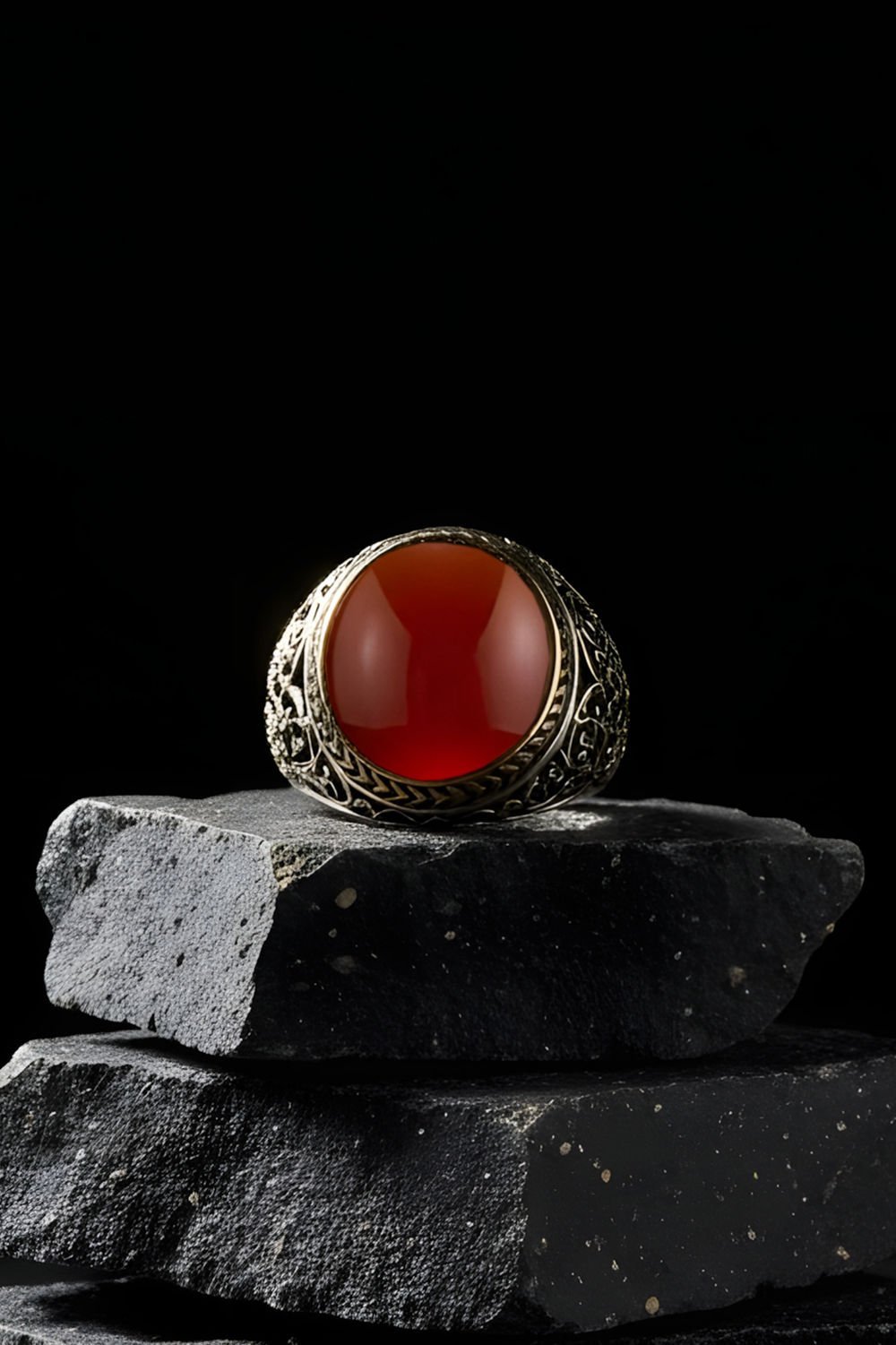 Hakiki ve orijinal doğal taşlar kullandığımız yüzüklerin bu modelinde klasik rengiyle Akik taşını kullanıyoruz.