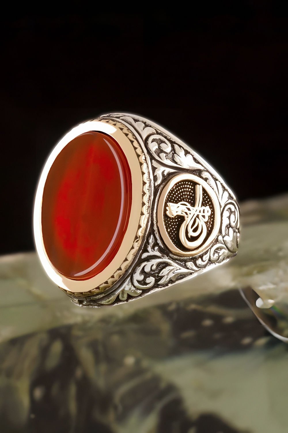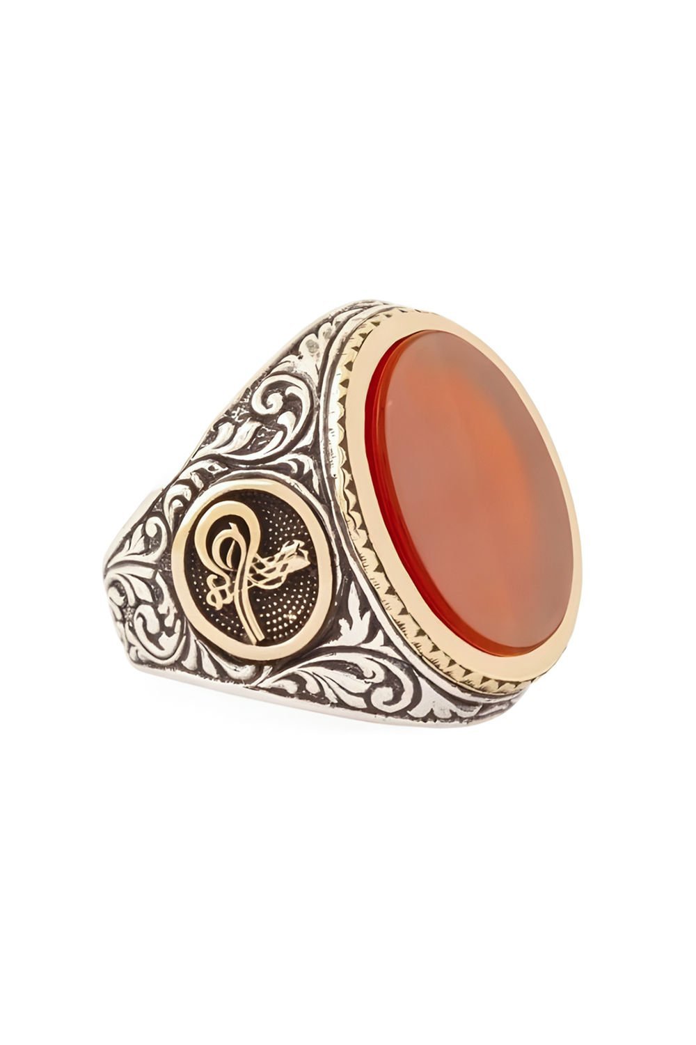 Akik Taşlı Tuğra Desenli Gümüş Yüzük |