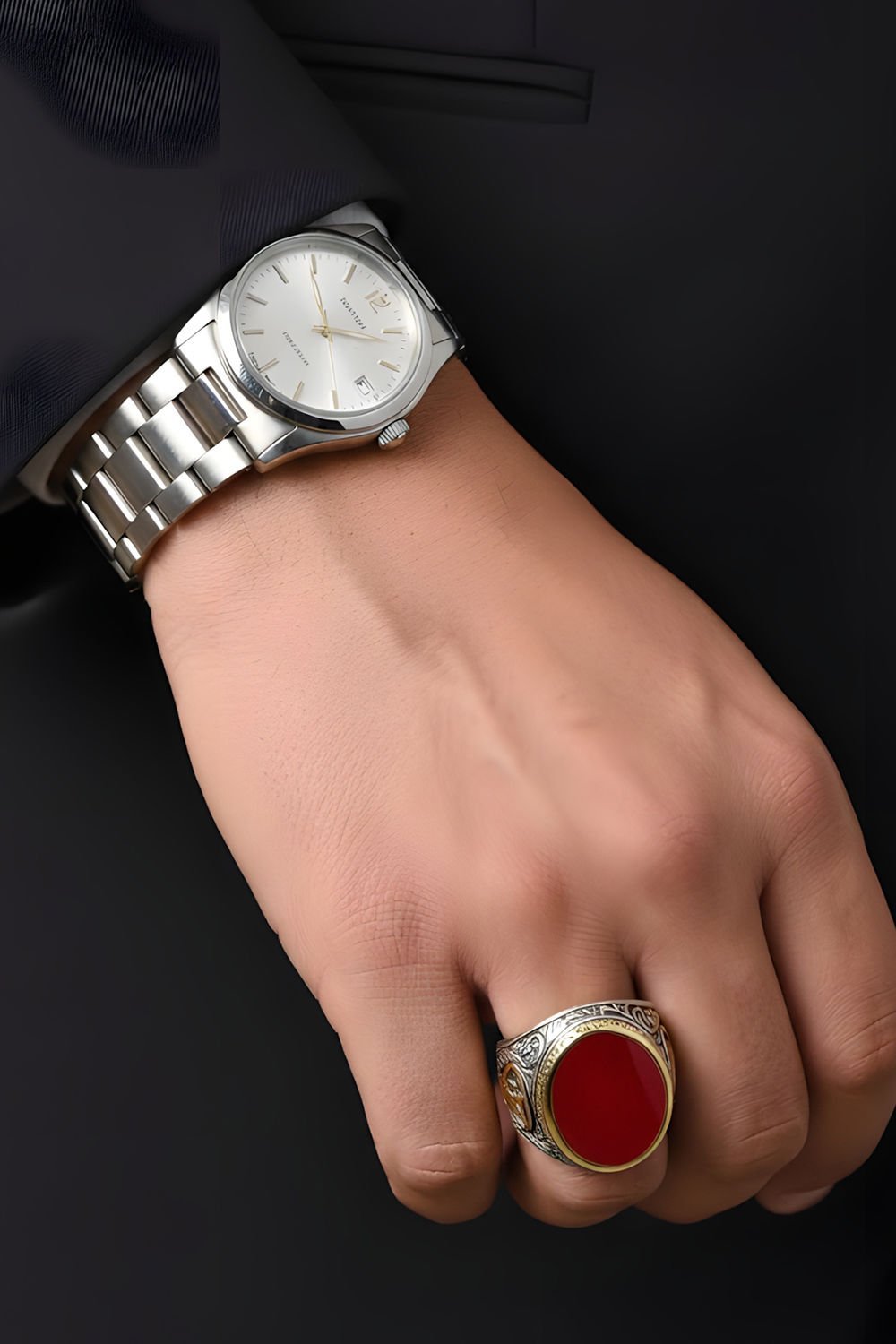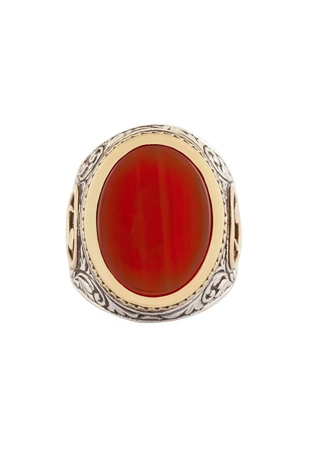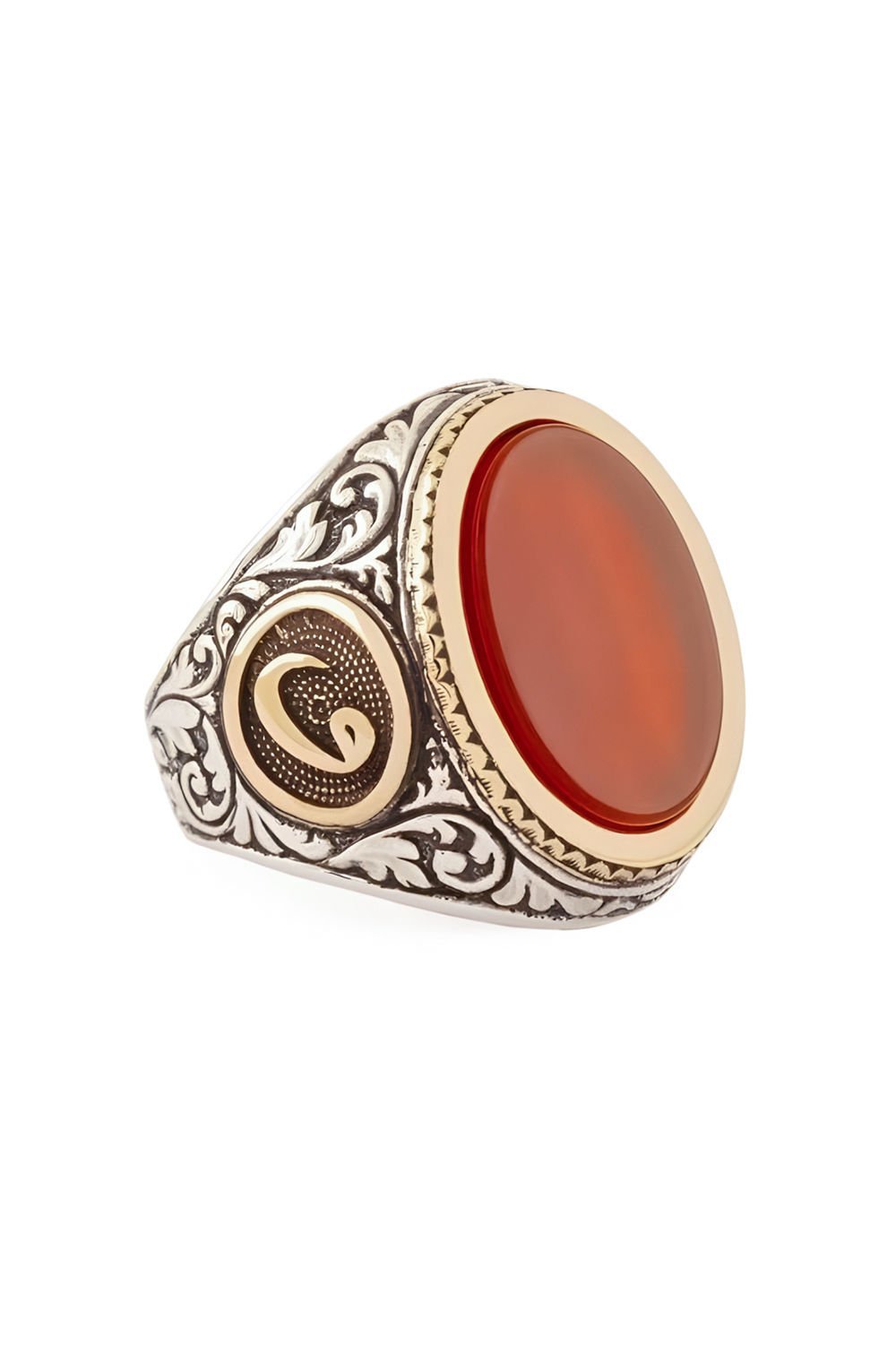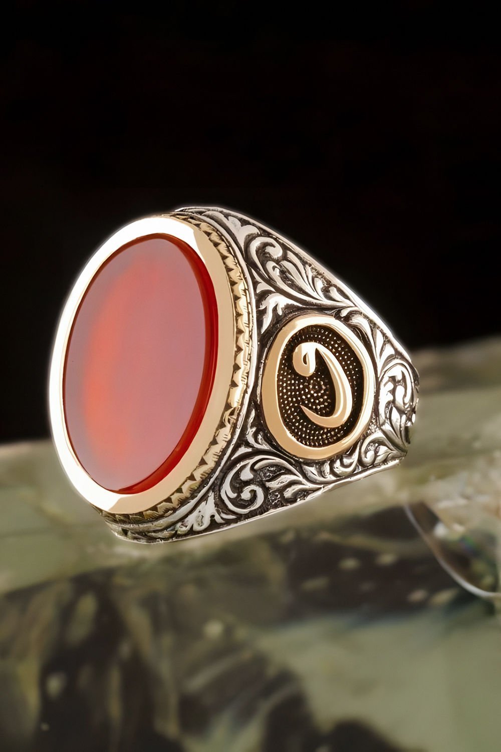 Hakiki ve orijinal doğal taşlar kullandığımız yüzüklerin bu modelinde klasik rengiyle Akik taşını kullanıyoruz.