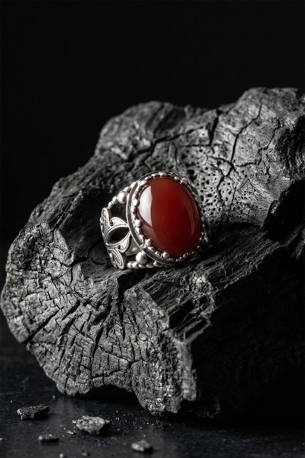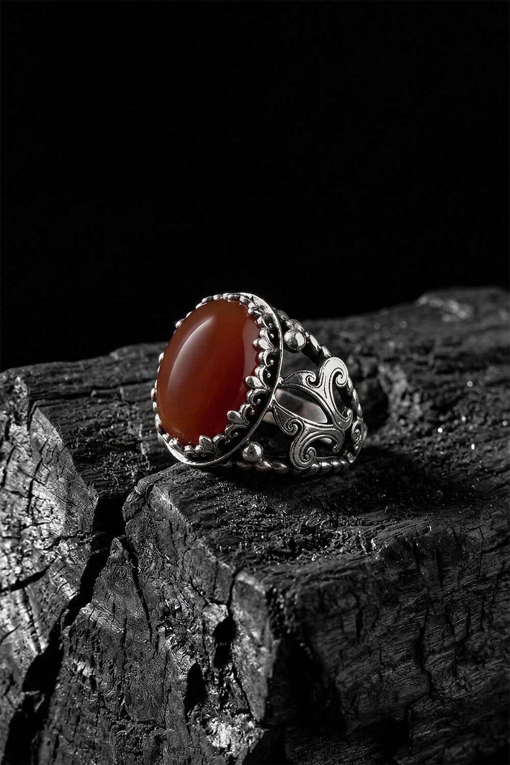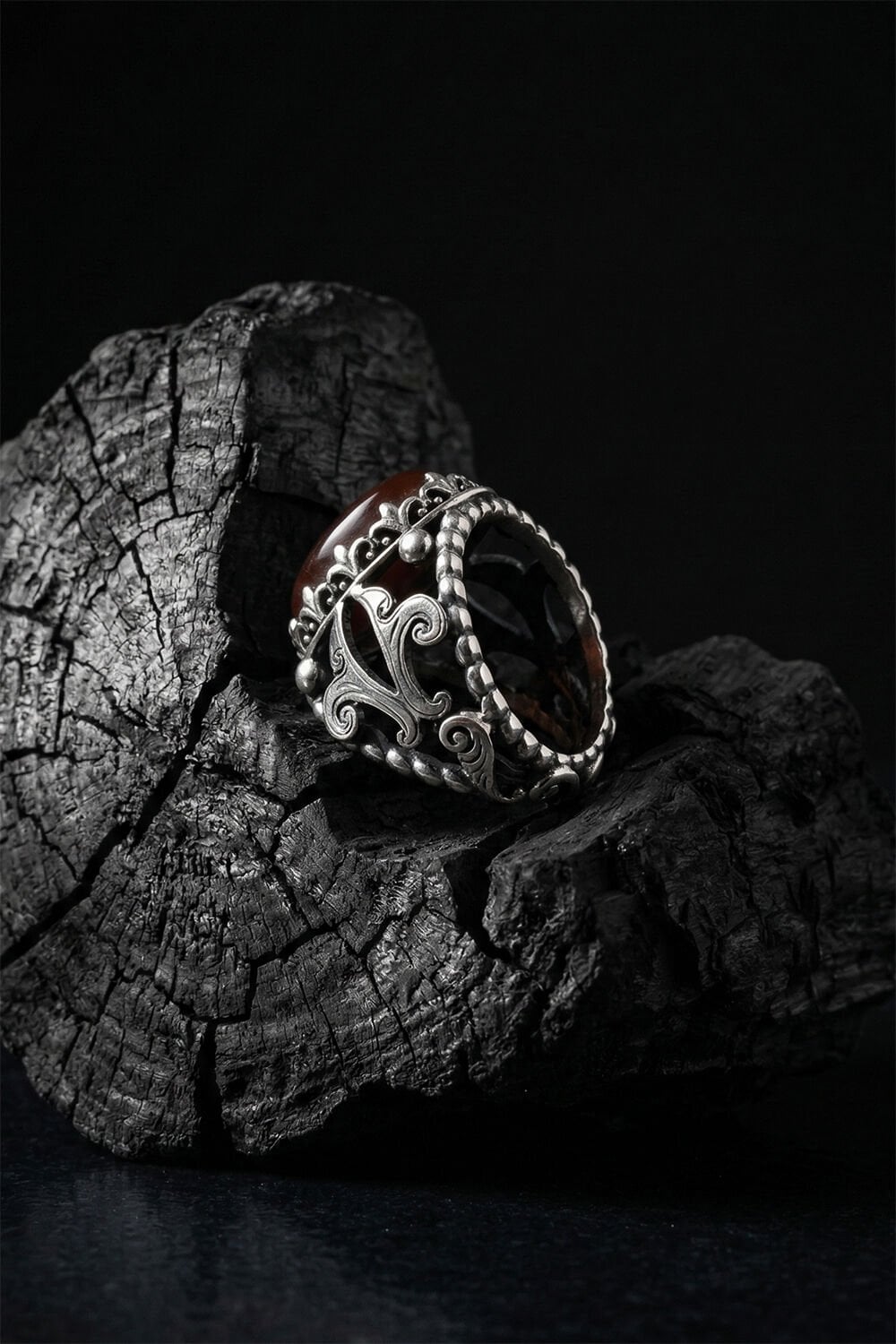 Akik Taşlı Zambak Desenli El İşçiliği 925 Ayar Gümüş Erkek Yüzük