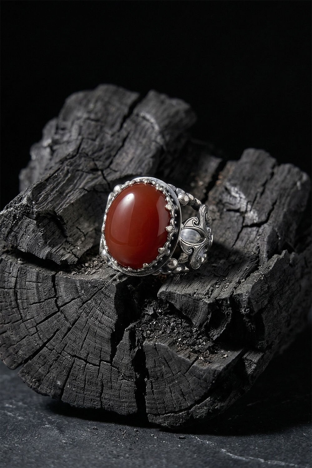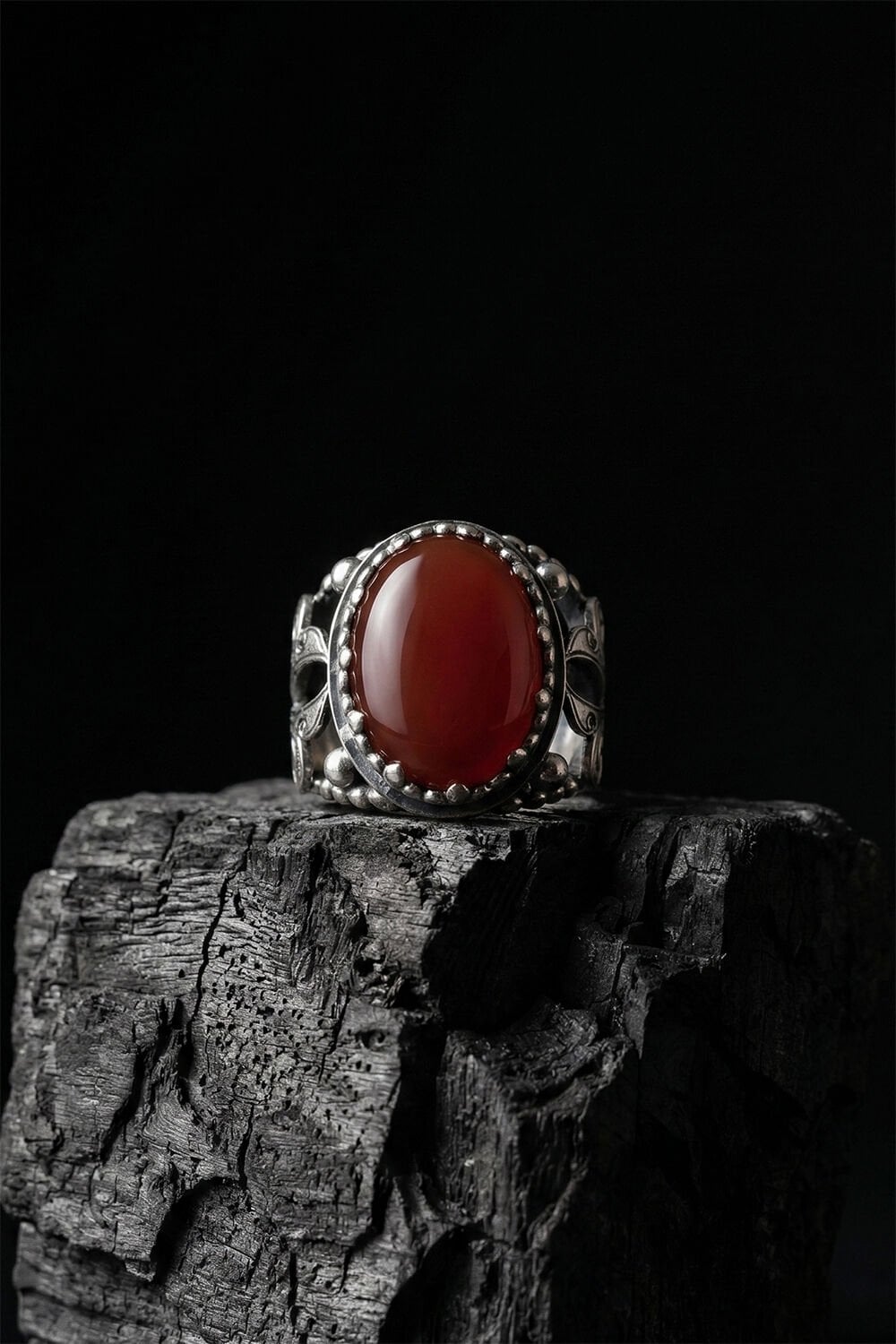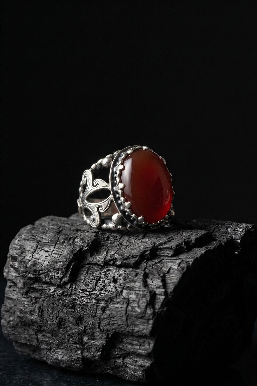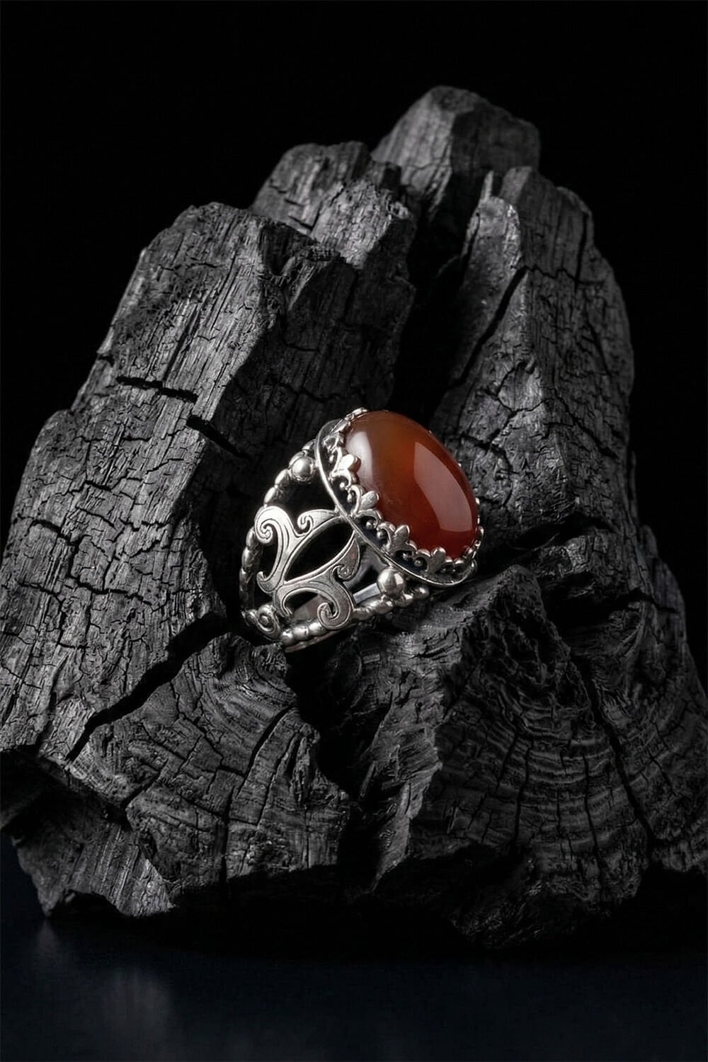 Akik Taşlı Zambak Desenli El İşçiliği 925 Ayar Gümüş Erkek Yüzük