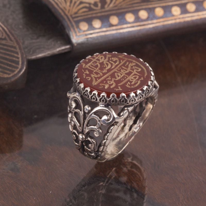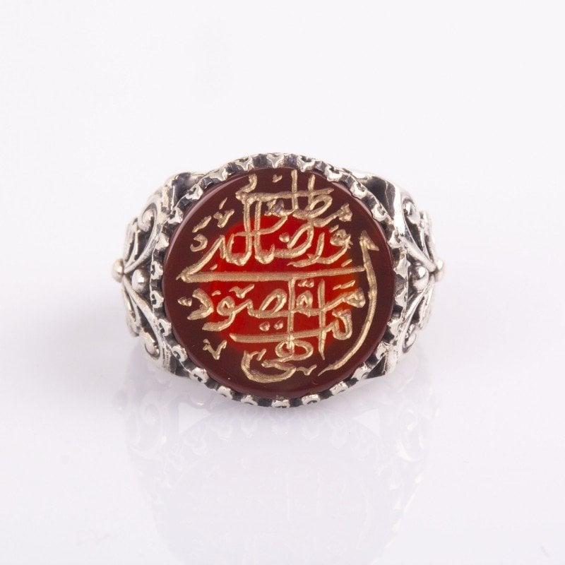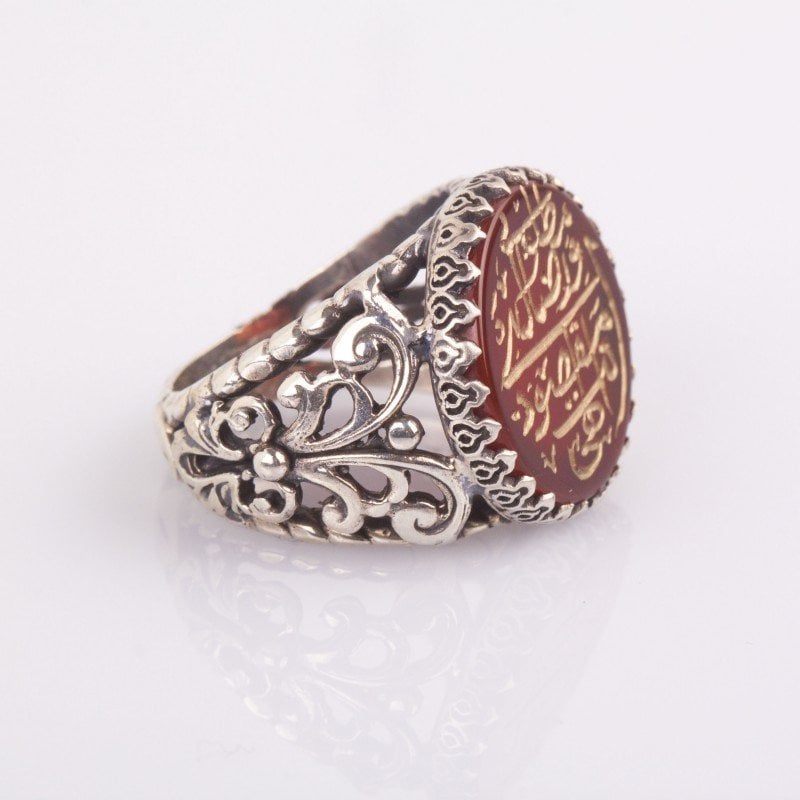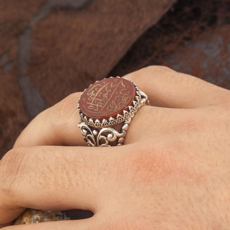 Her bir detayı özenle tasarlanmış olan bu yüzük, orijinal akik taşı ve 925 ayar gümüş ile güçlendirilmiştir. "İlahi Ente Maksudi" yazısı, kişinin manevi yolculuğunu hatırlatan anlamlı bir ifadedir, bu da yüzüğe özel bir dokunuş katar.