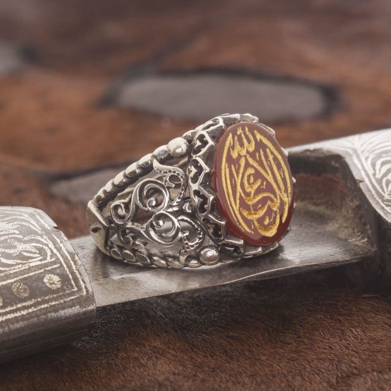Doğal Akik Taşlı El İşçiliği 925 Ayar Gümüş Yüzük Özel İşçilik "La Galibe illallah" Yazısı Kazıma ile stilinizi ifade edin. Bu benzersiz mücevher, güzellik ve anlamı bir araya getirerek sizi özel kılacaktır.