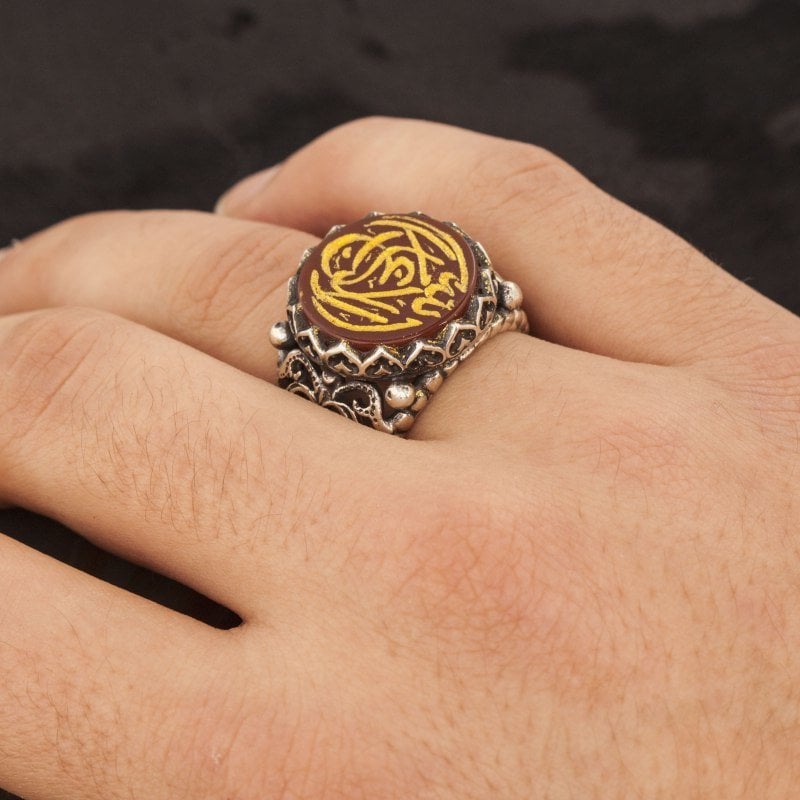 Her bir detayı titizlikle işlenmiş olan bu yüzük, doğal akik taşının zengin renkleri ve eşsiz desenleri ile dikkat çeker. Bu taşlar, gücü ve dengeyi simgeler, bu da yüzüğe özel bir anlam katar. 925 ayar gümüş ise yüzüğe dayanıklılık ve şıklık eklerken, "La Galibe illallah" yazısı kazıma, bu mücevheri manevi bir derinlikle donatır.
