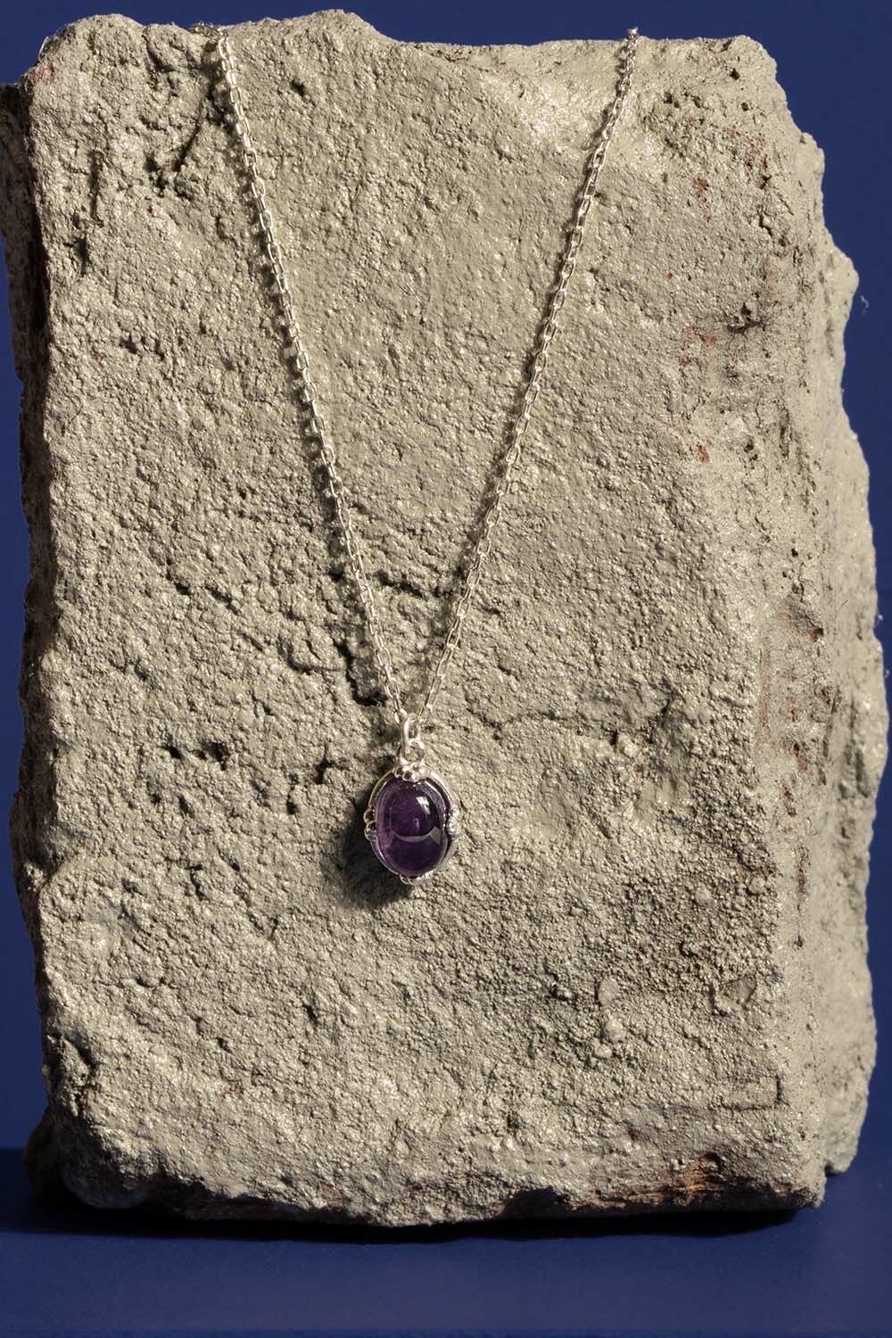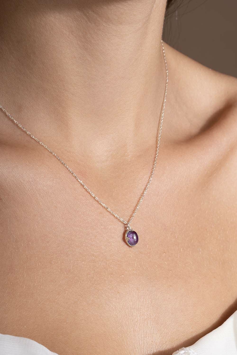 Gümüş kolyenin zarif duruşu, günlük kullanıma uygunluğuyla öne çıkarken, özel günlerde de şıklığınızı tamamlayacak bir parça haline gelir. Doğal ametist taşı, enerjisini her anınıza taşıyarak sizi ve tarzınızı özel kılar.
