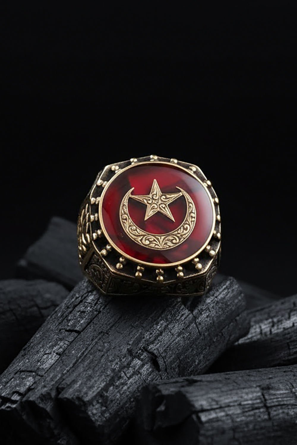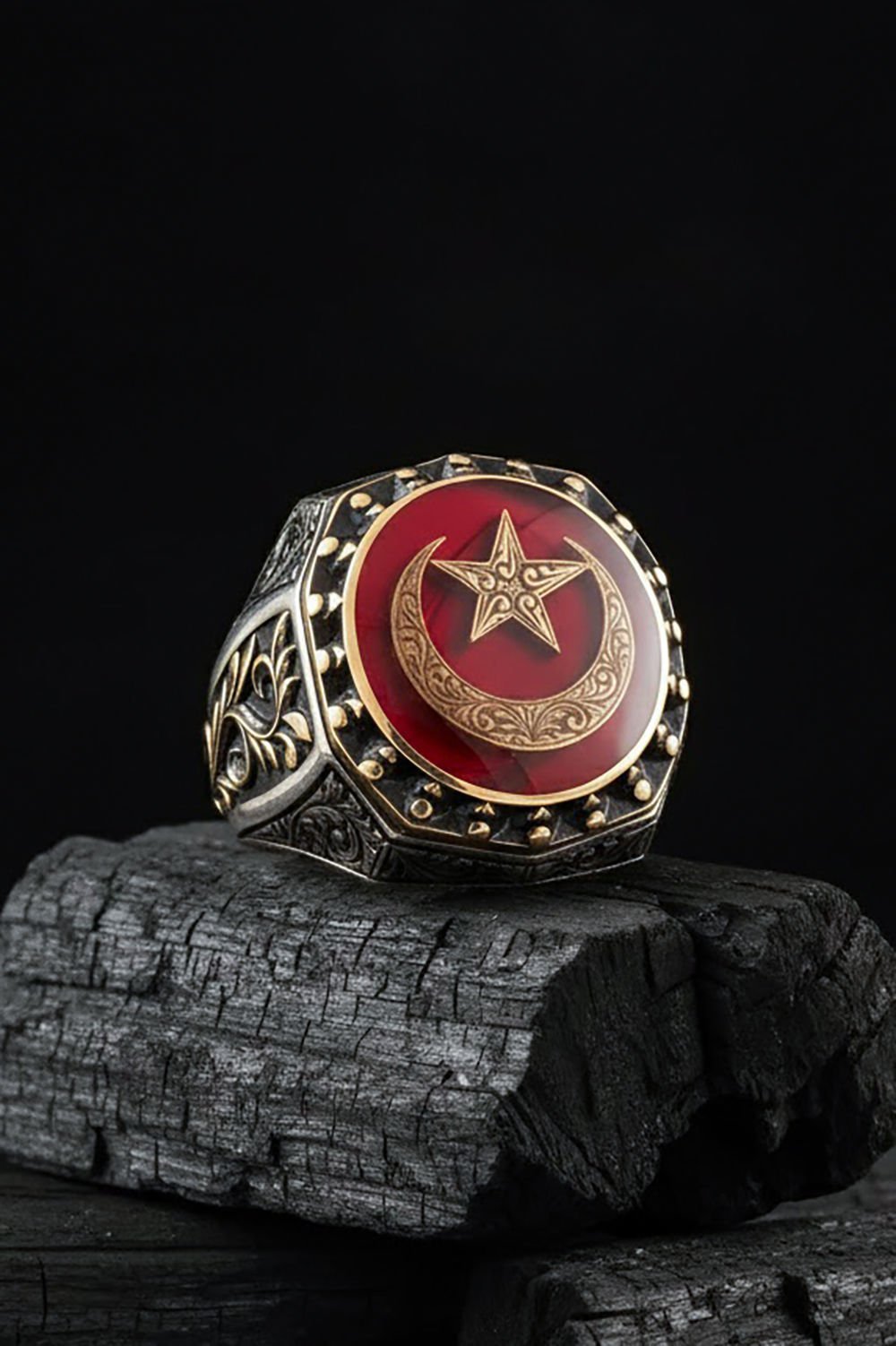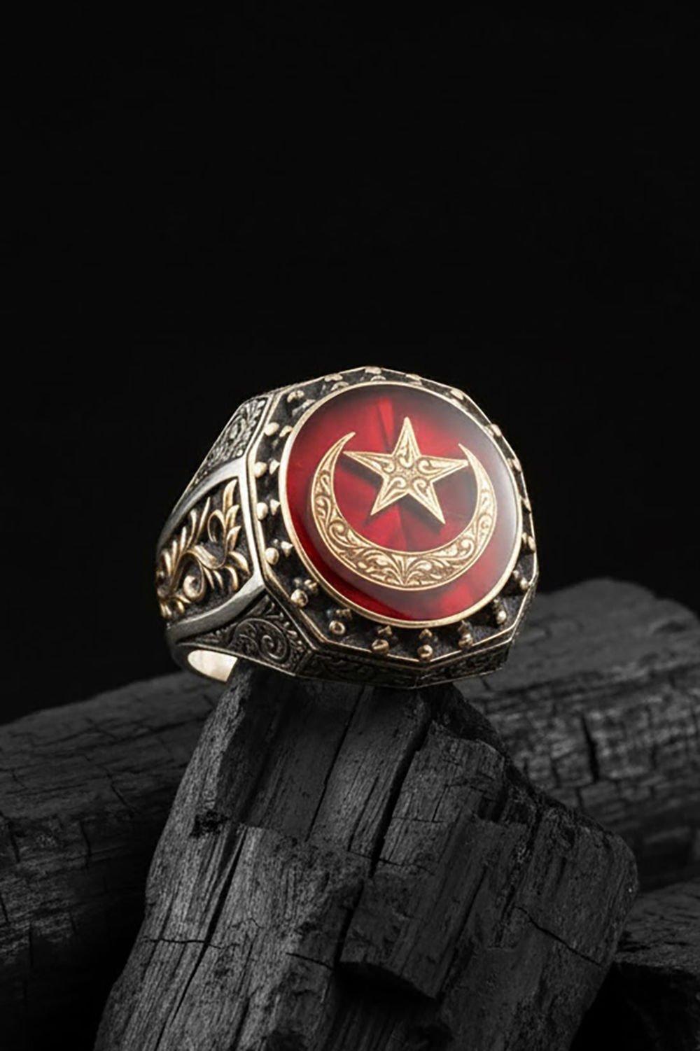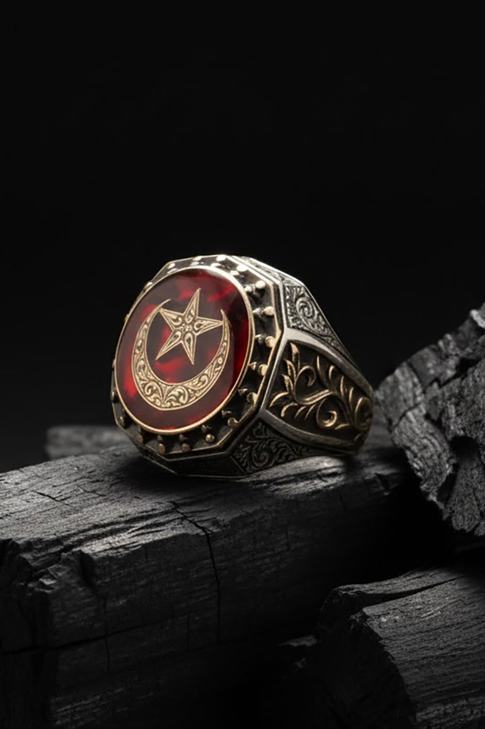 Ay Yıldız Mineli Gravür Sarmaşık Model Yüzük
