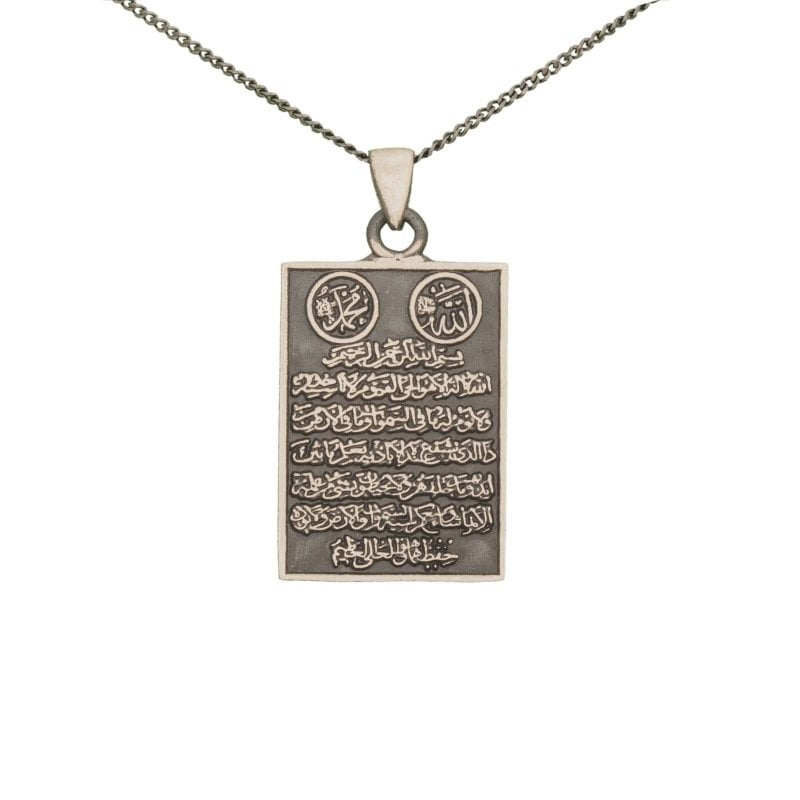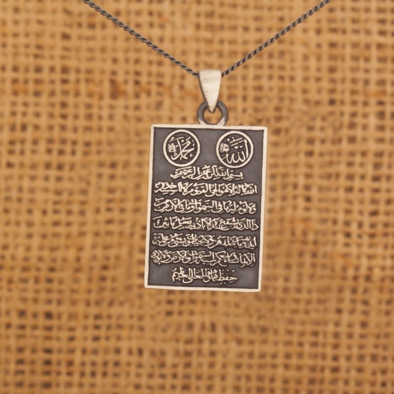 Ayet-el Kürsi, Kur'an'da Bakara Suresi'nin 255. ayetidir. Medine'de indirildiğine ve birçok faziletinin olduğuna inanılır. Koruyucu özelliklere sahip olduğuna inanılan ayet-i kerime, farz namazlardan sonra okunduğu gibi, diğer zamanlarda da Allah'a sığınmak için, şerden korunmak adına okunur. Kolye, 925 ayar gümüş ve kendi atölyemizin işçiliği ile hazırlanmıştır. Sipariş verildikten sonra 1-2 iş günü içerisinde kargoya verilir.