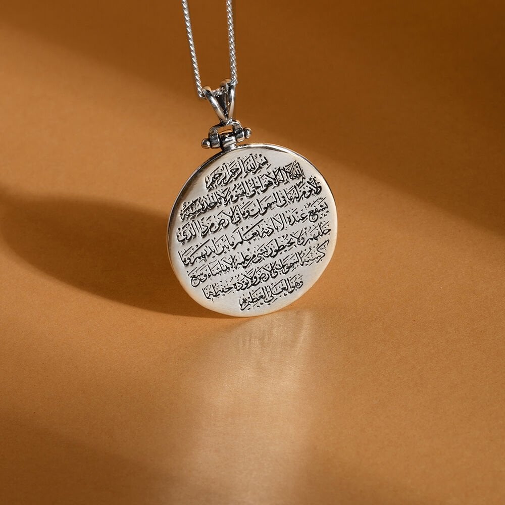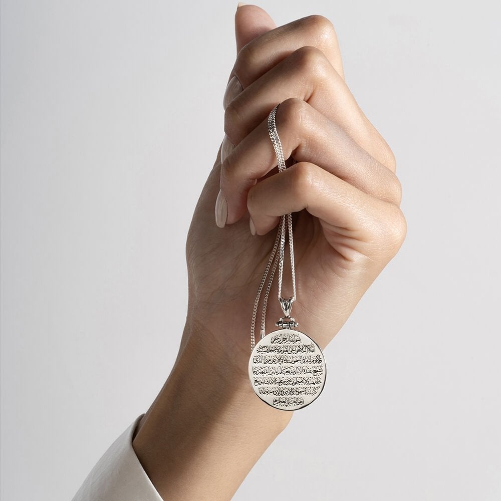 Bakara Suresinin 255. ayeti olan Ayet-el Kürsi, koruyucu özelliklere sahip olduğuna inanılan, farz namazlardan sonra okunduğu gibi, diğer zamanlarda da Allah'a sığınmak için, şerden korunmak adına okunur. 925 ayar gümüş ve kendi atölyemizin işçiliği ile üretilmiştir. Sipariş verildikten sonra 1-2 iş günü içerisinde kargoya verilir.