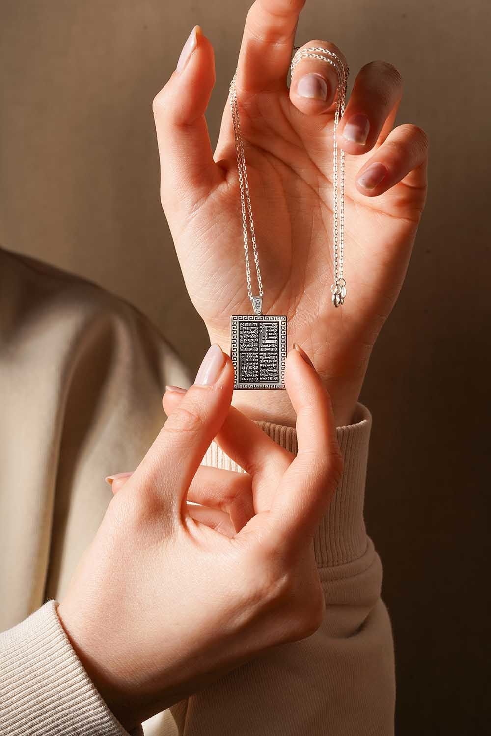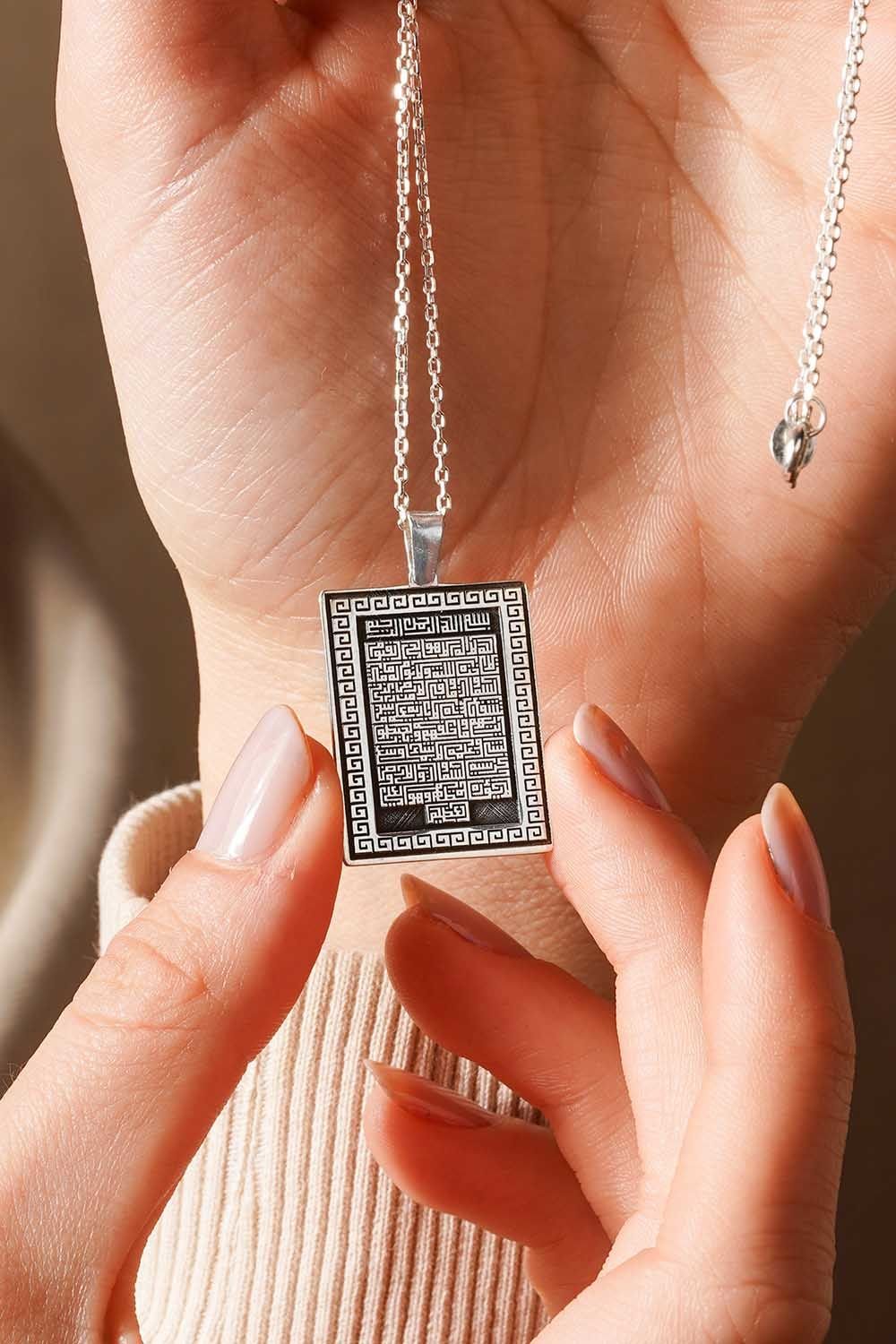 Bu kolye, içerisinde barındırdığı dualarla manevi huzur sağlarken, çift taraflı tasarımıyla kullanıcılarına esneklik sunar. 925 ayar gümüşün kalitesi ve dayanıklılığı ile uzun ömürlü bir kullanım vaat eder.