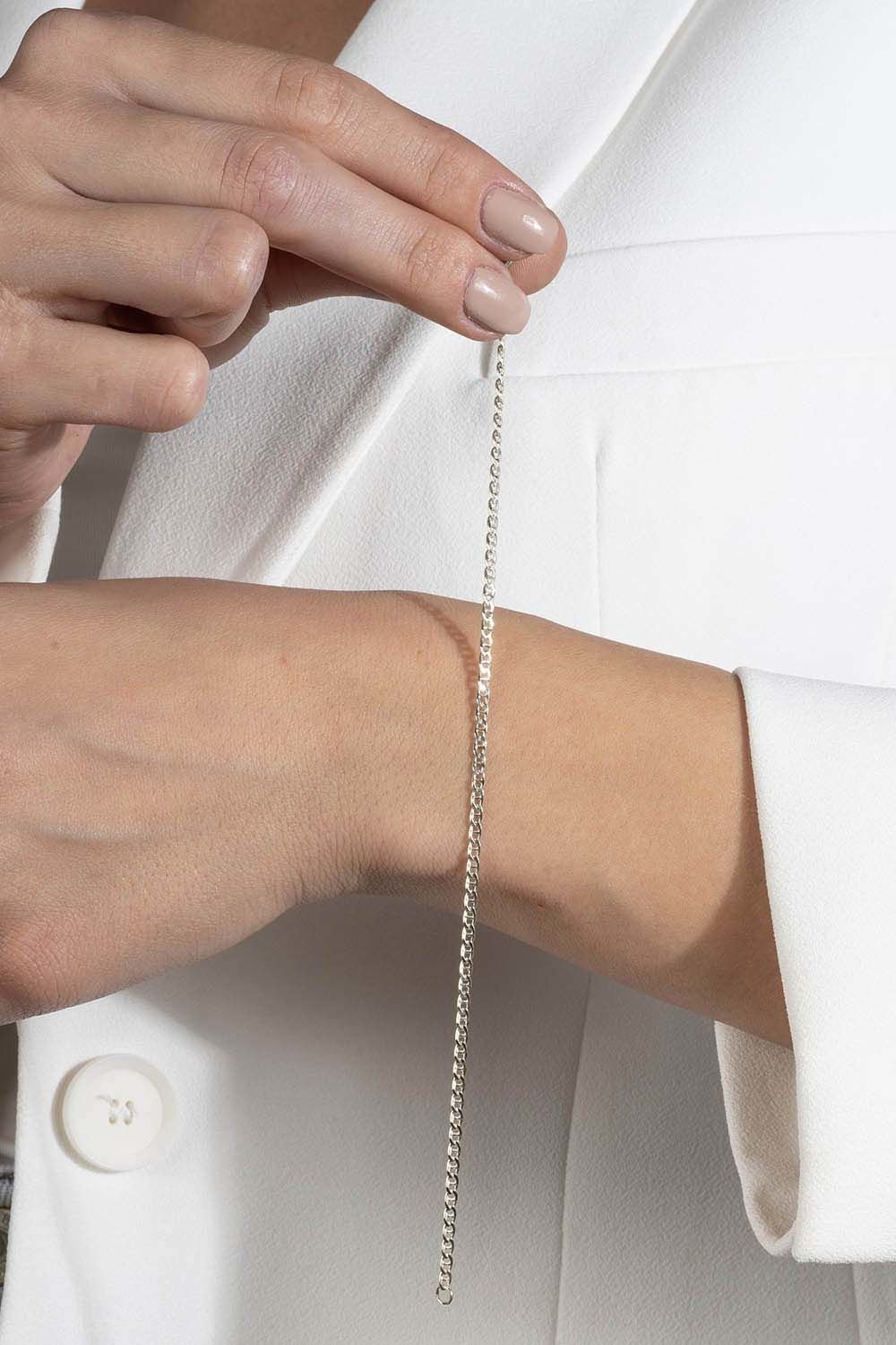 Farklı renklerde (silver, gold, rose) hazırlayabildiğimiz, klasik desenlere sahip gümüş zincir bileklik modelimiz. Bileklik, 925 ayar gümüş ile imal edilmiştir. Sipariş verildikten sonra 1-2 iş günü içerisinde kargoya verilir.