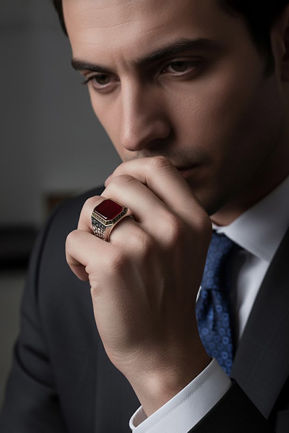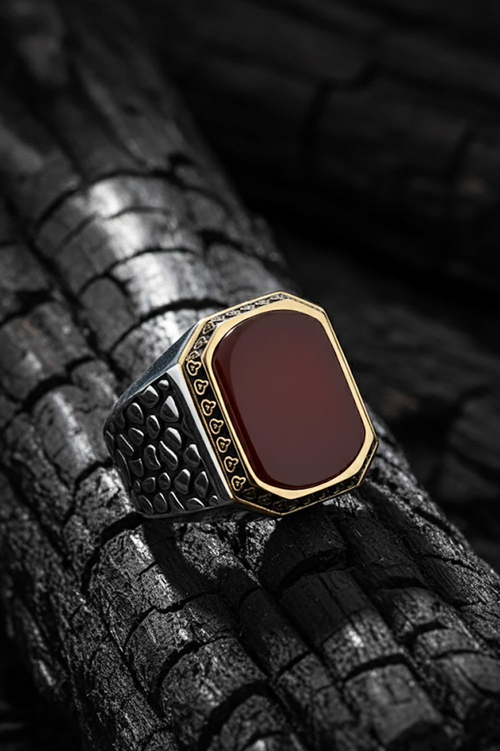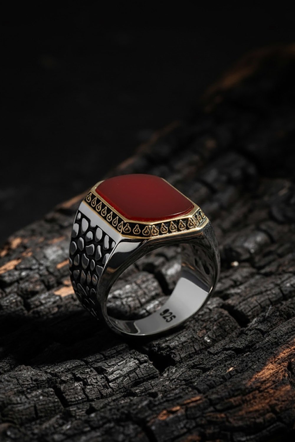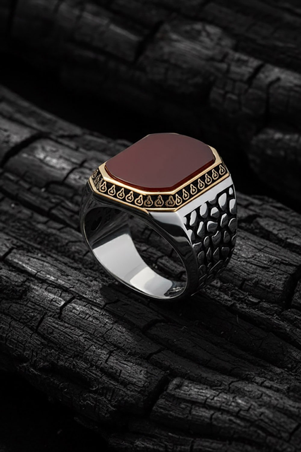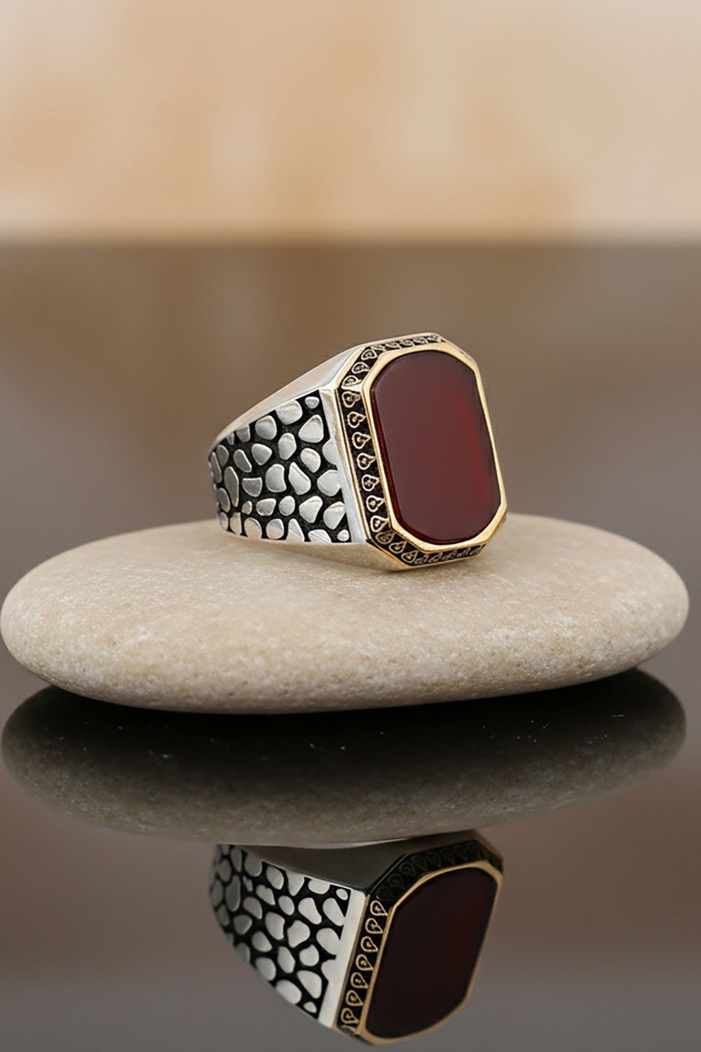 Bu özel erkek yüzüğü, doğal akik taşı ve 925 ayar gümüş ile özenle tasarlanmıştır. Benekli modeli ve el işçiliği ile dikkat çekici bir parçadır.