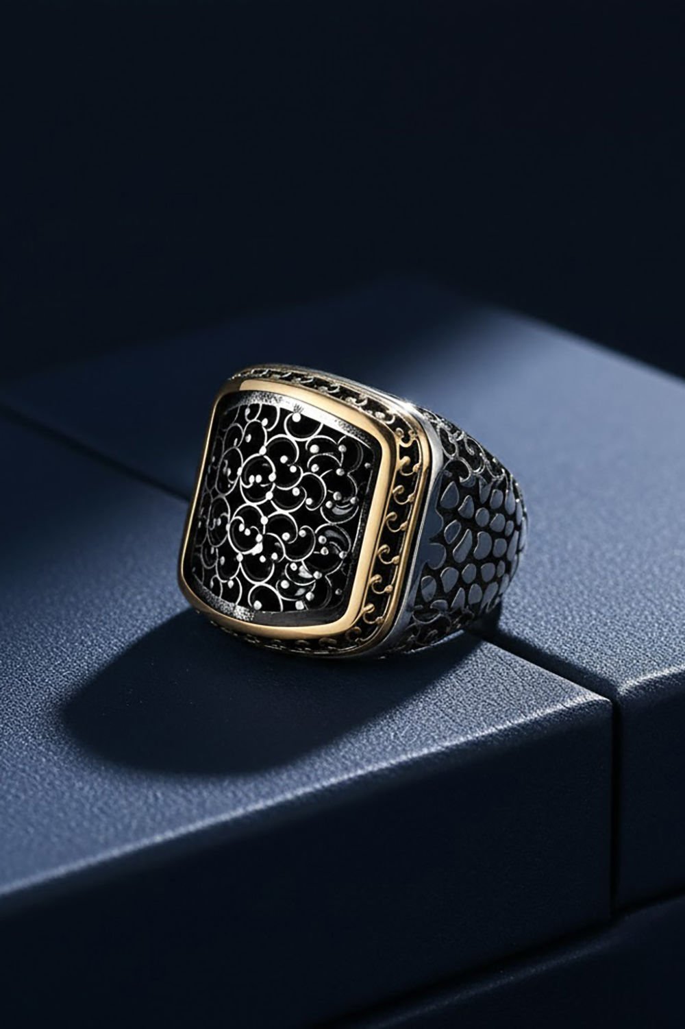 Yüzük, kenar kısımlarındaki işlemeleri ve minimal tasarımı ile dikkat çekmektedir.