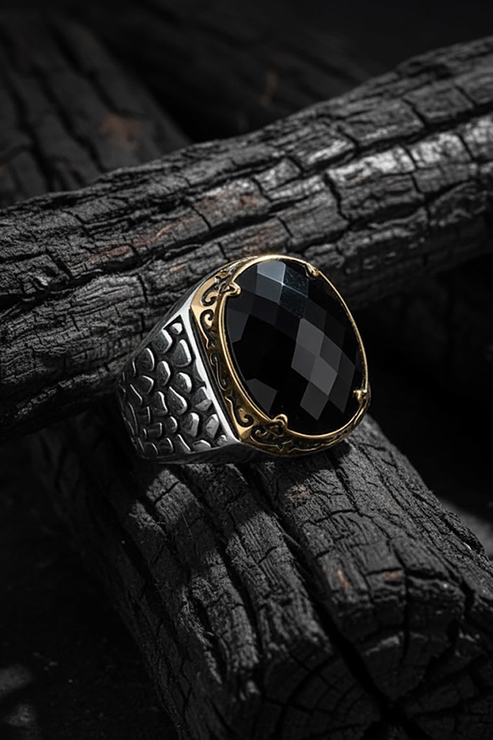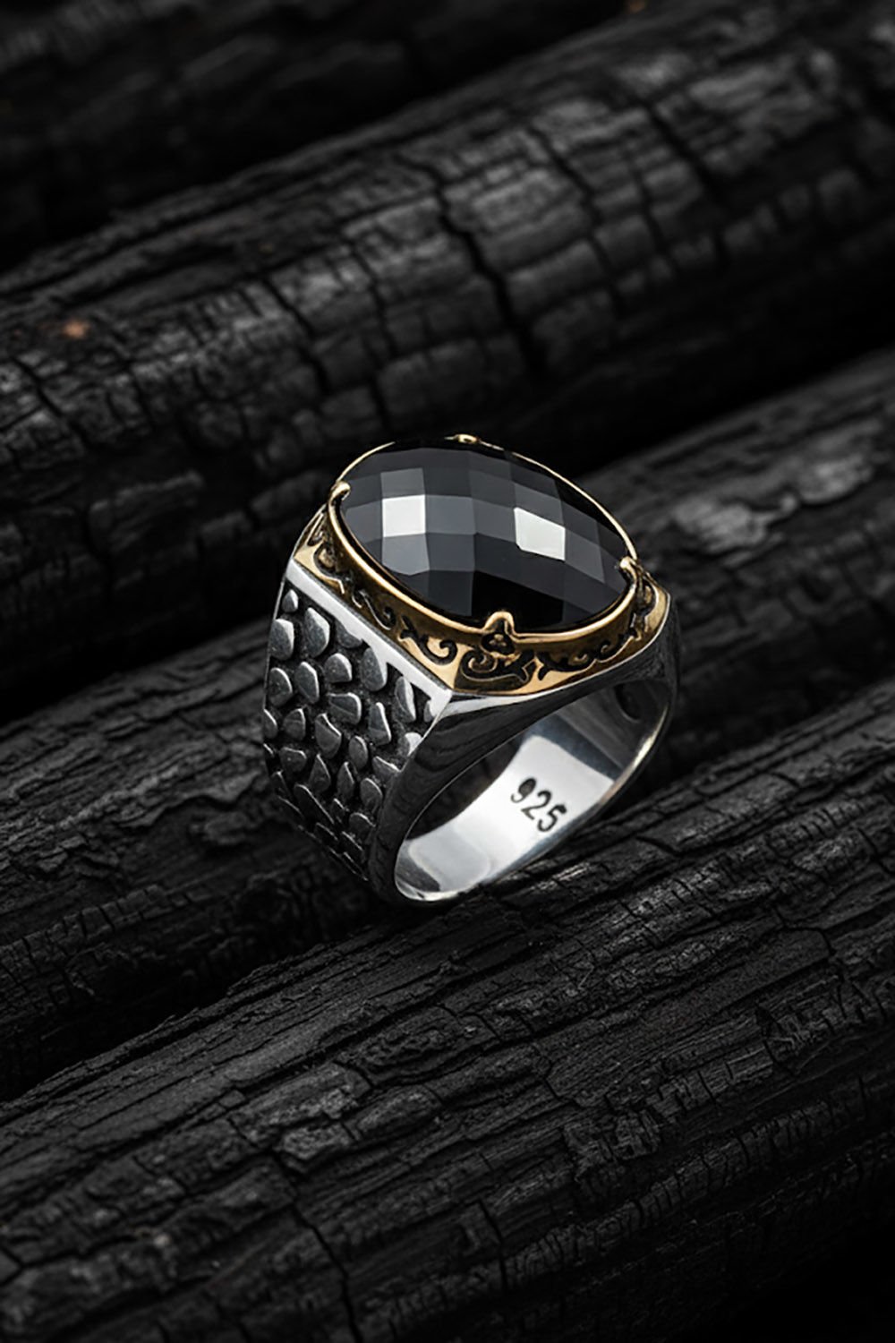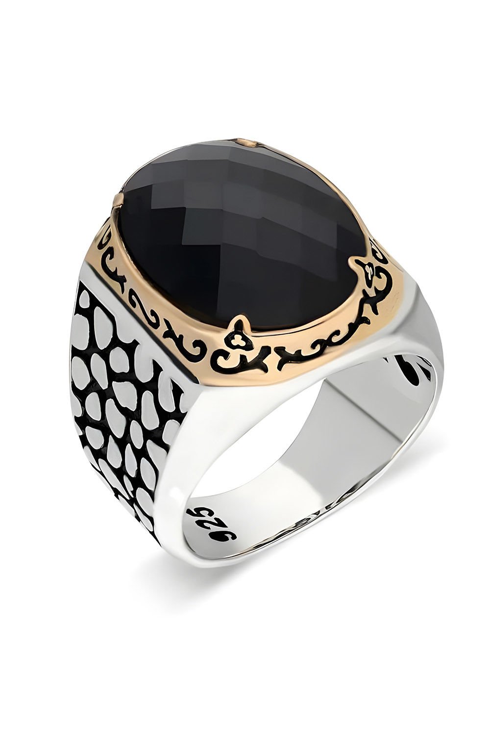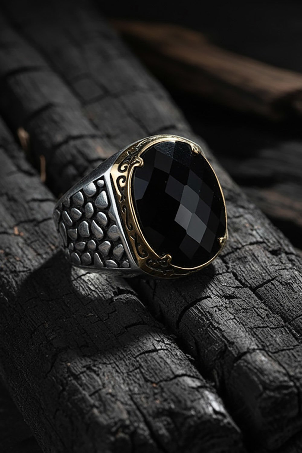 Bu özel erkek yüzüğü, doğal siyah zirkon taşı ve 925 ayar gümüş ile özenle tasarlanmıştır. Benekli modeli ve özel işçilik detaylarıyla dikkat çeker.