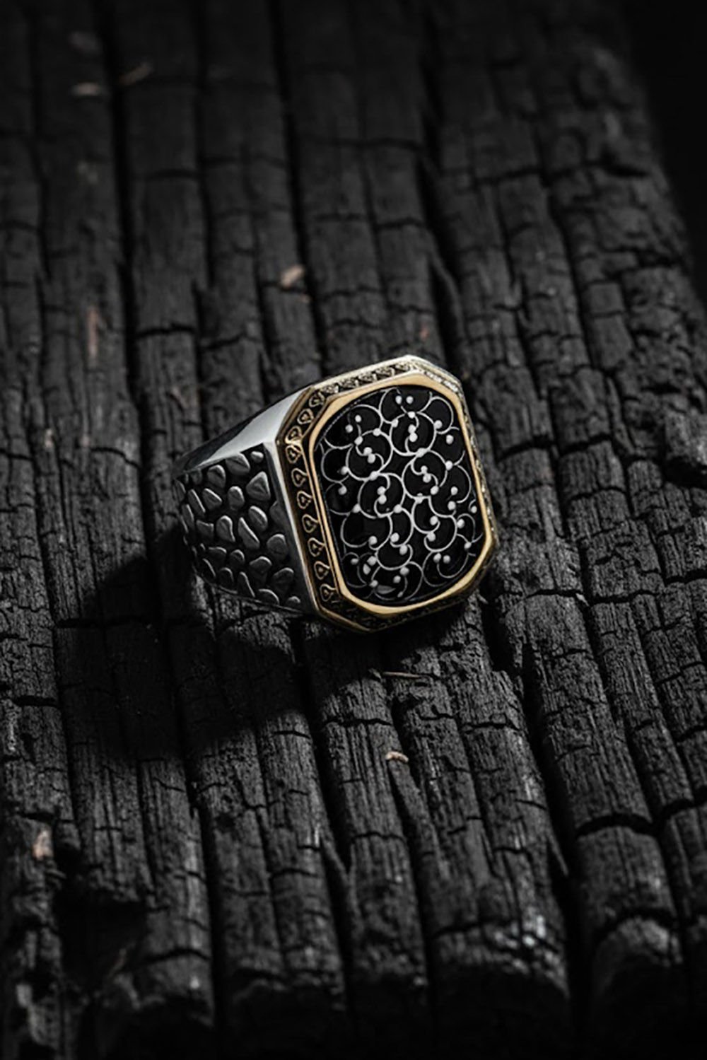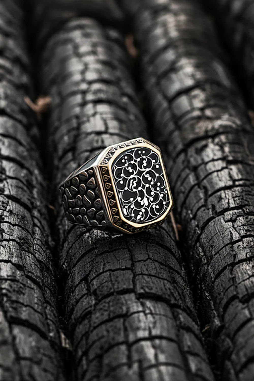 Yüzük, kenar kısımlarındaki işlemeleri ve minimal tasarımı ile dikkat çekmektedir.