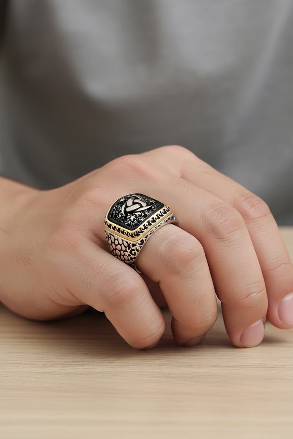Yüzük, kenar kısımlarındaki işlemeleri ve minimal tasarımı ile dikkat çekmektedir.