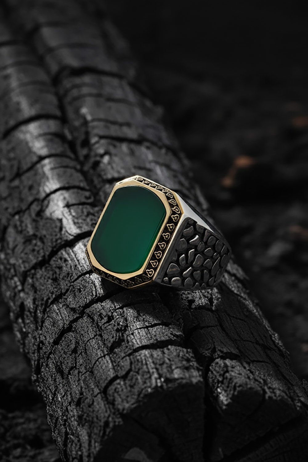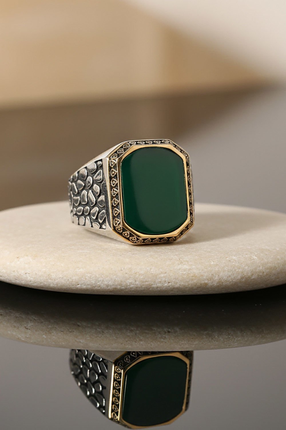 Benekli Model Yeşil Akik Taşlı Gümüş Erkek Yüzük