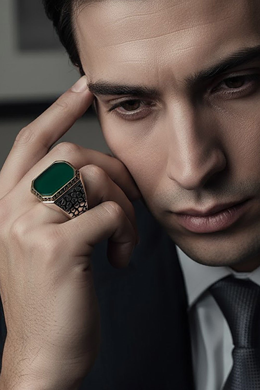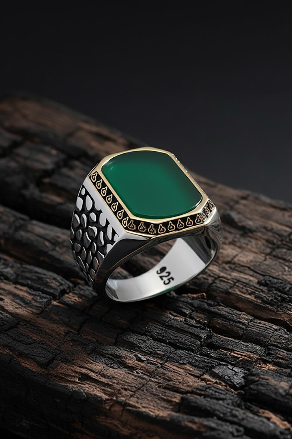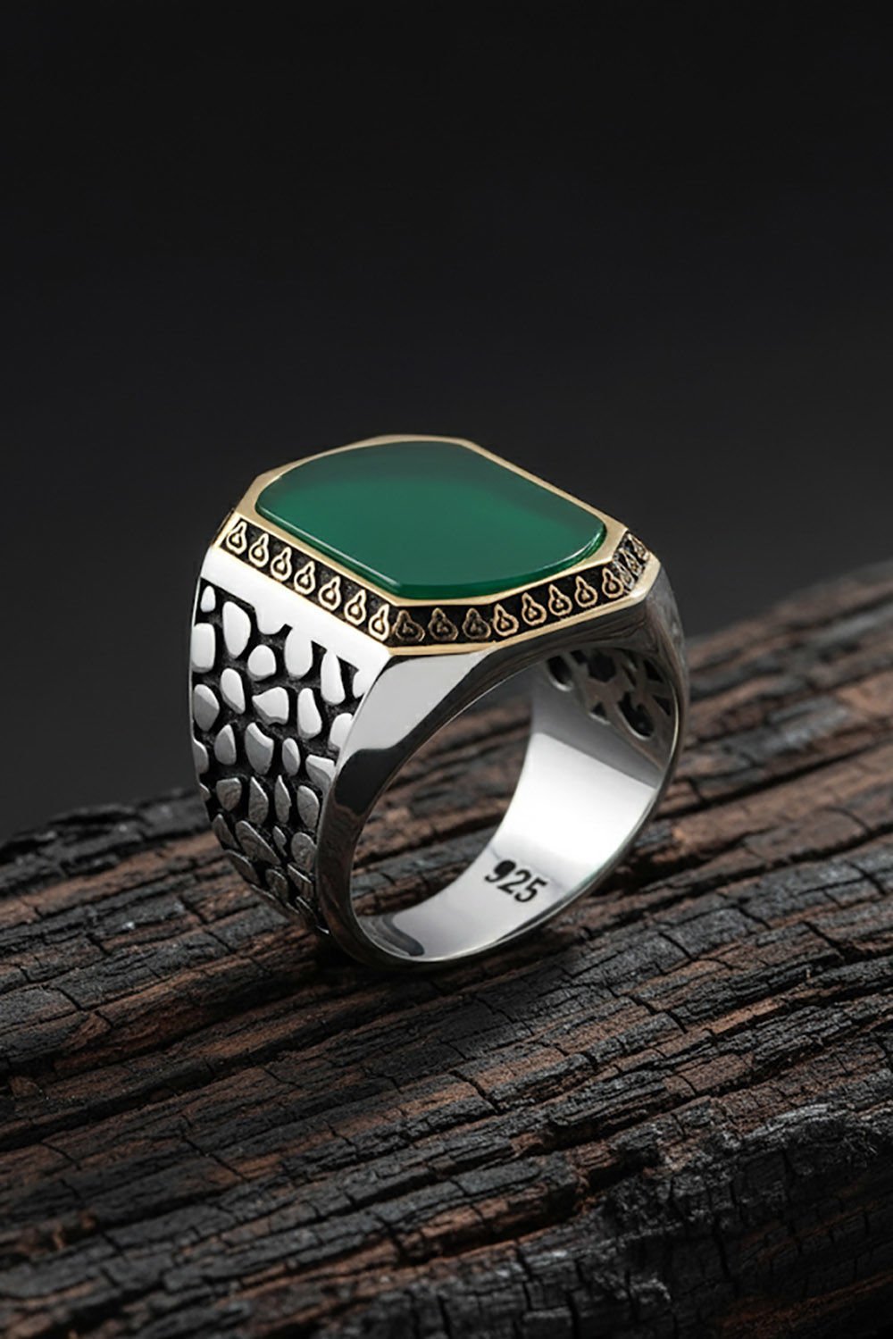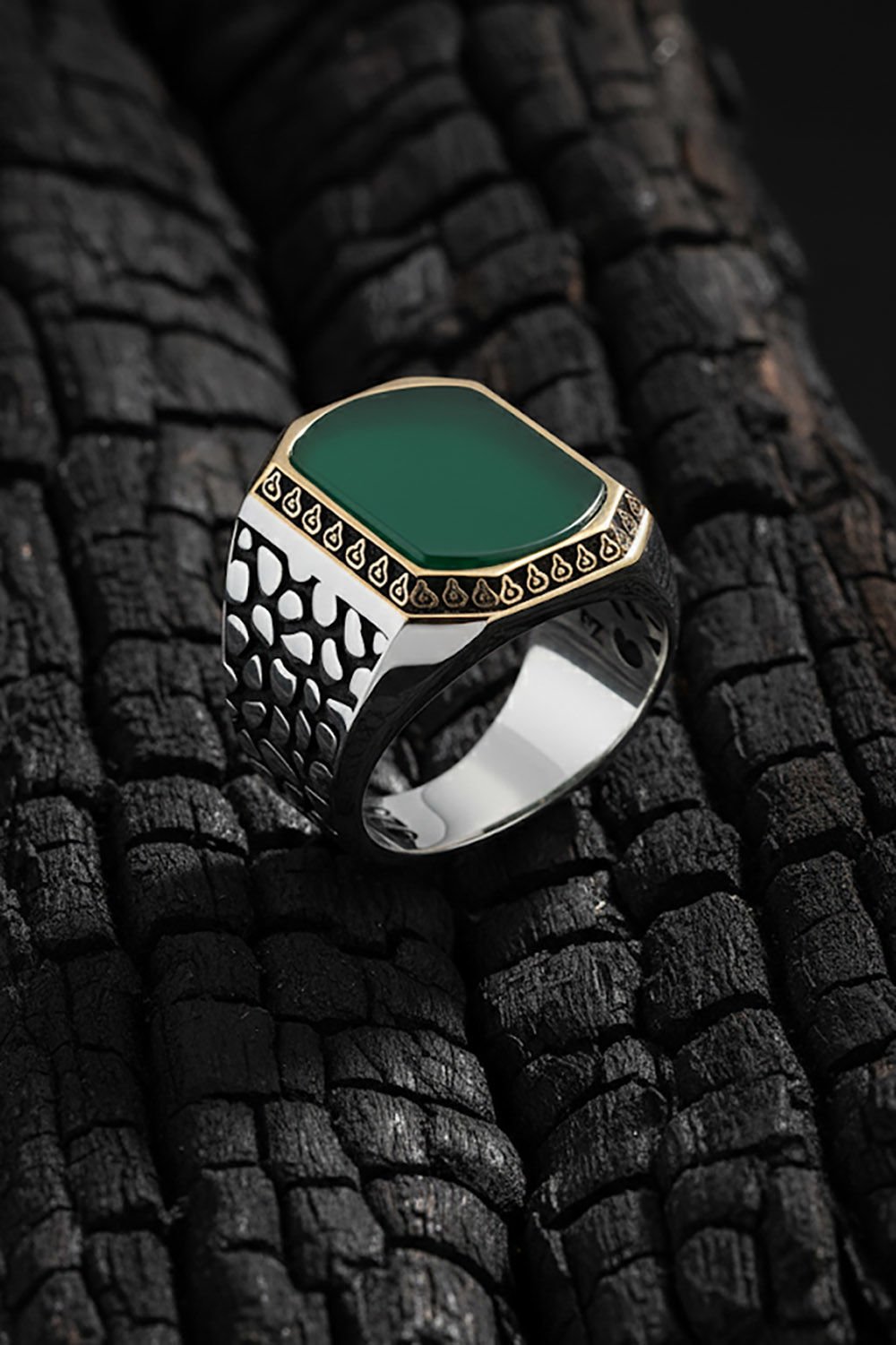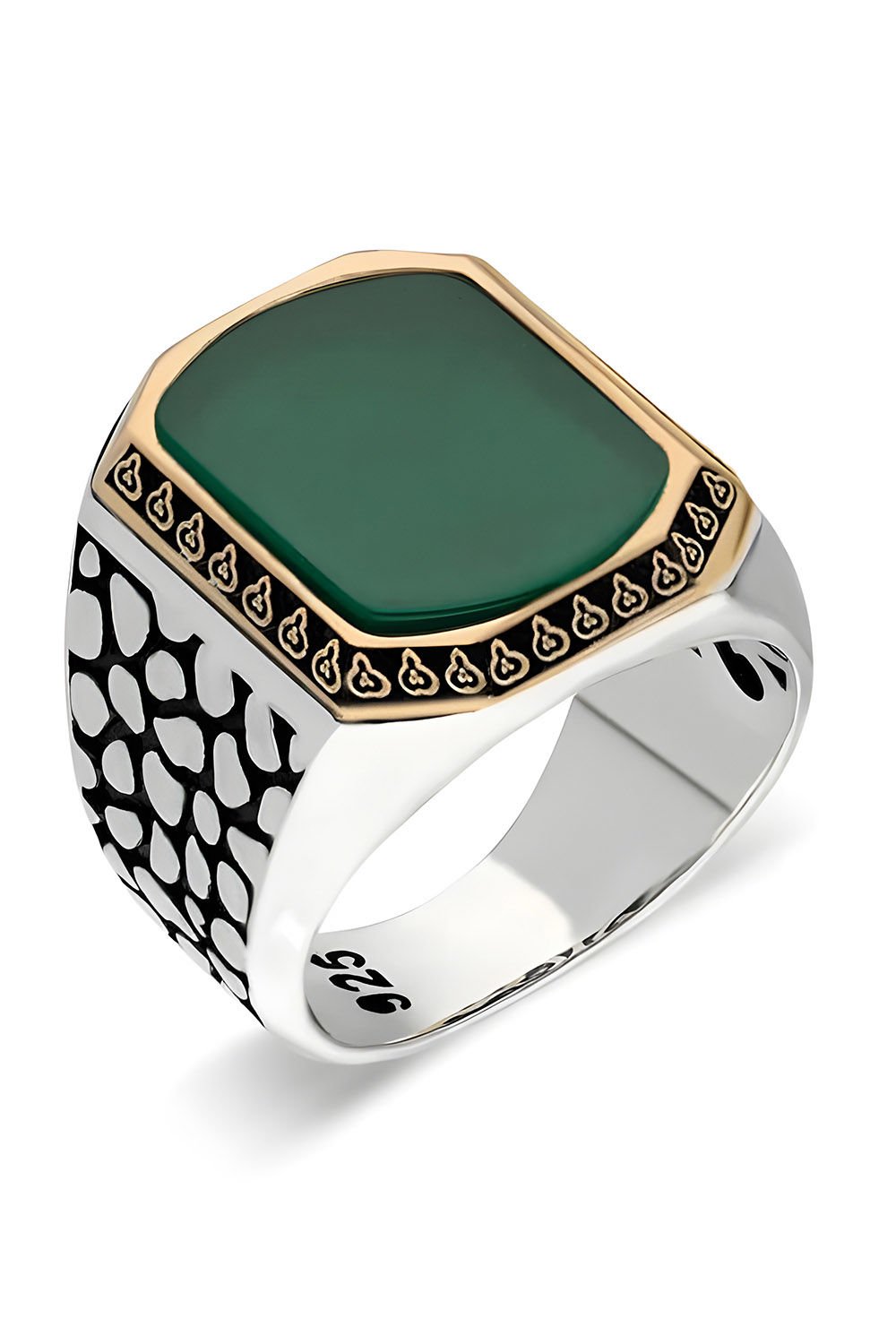 Benekli Model Yeşil Akik Taşlı Gümüş Erkek Yüzük |