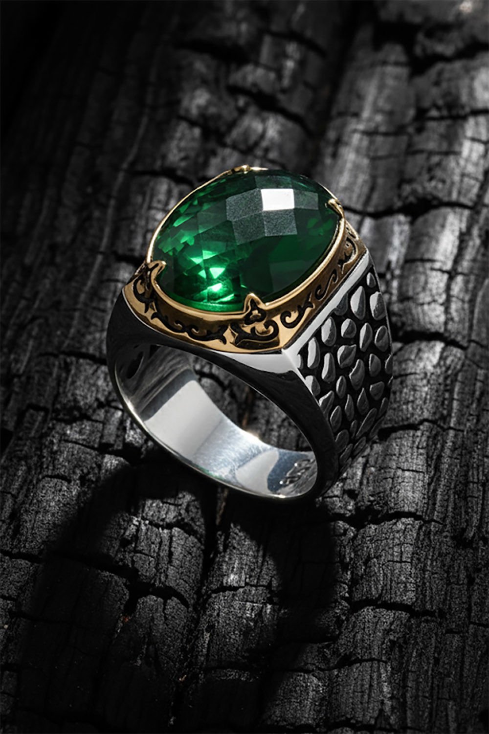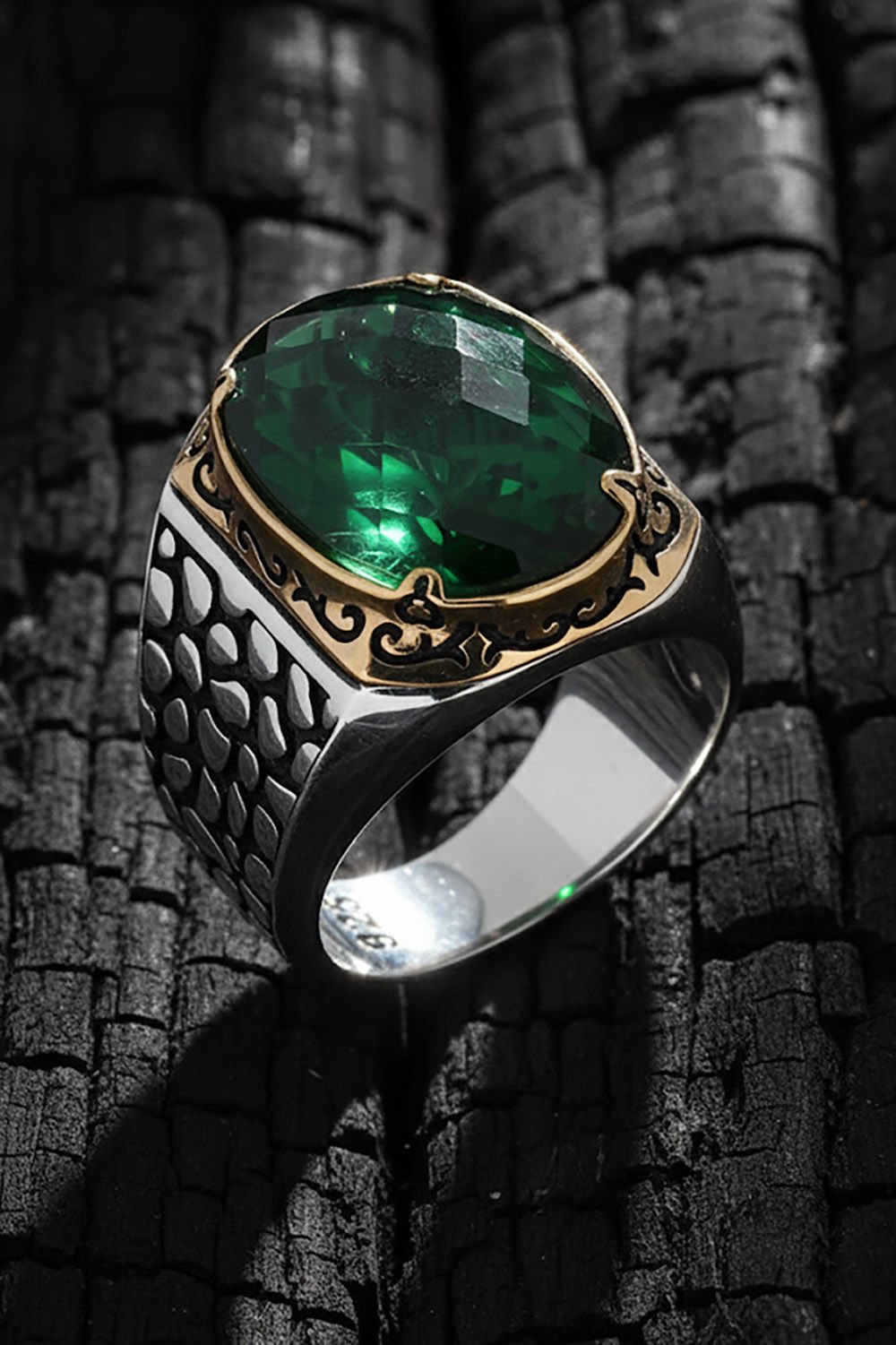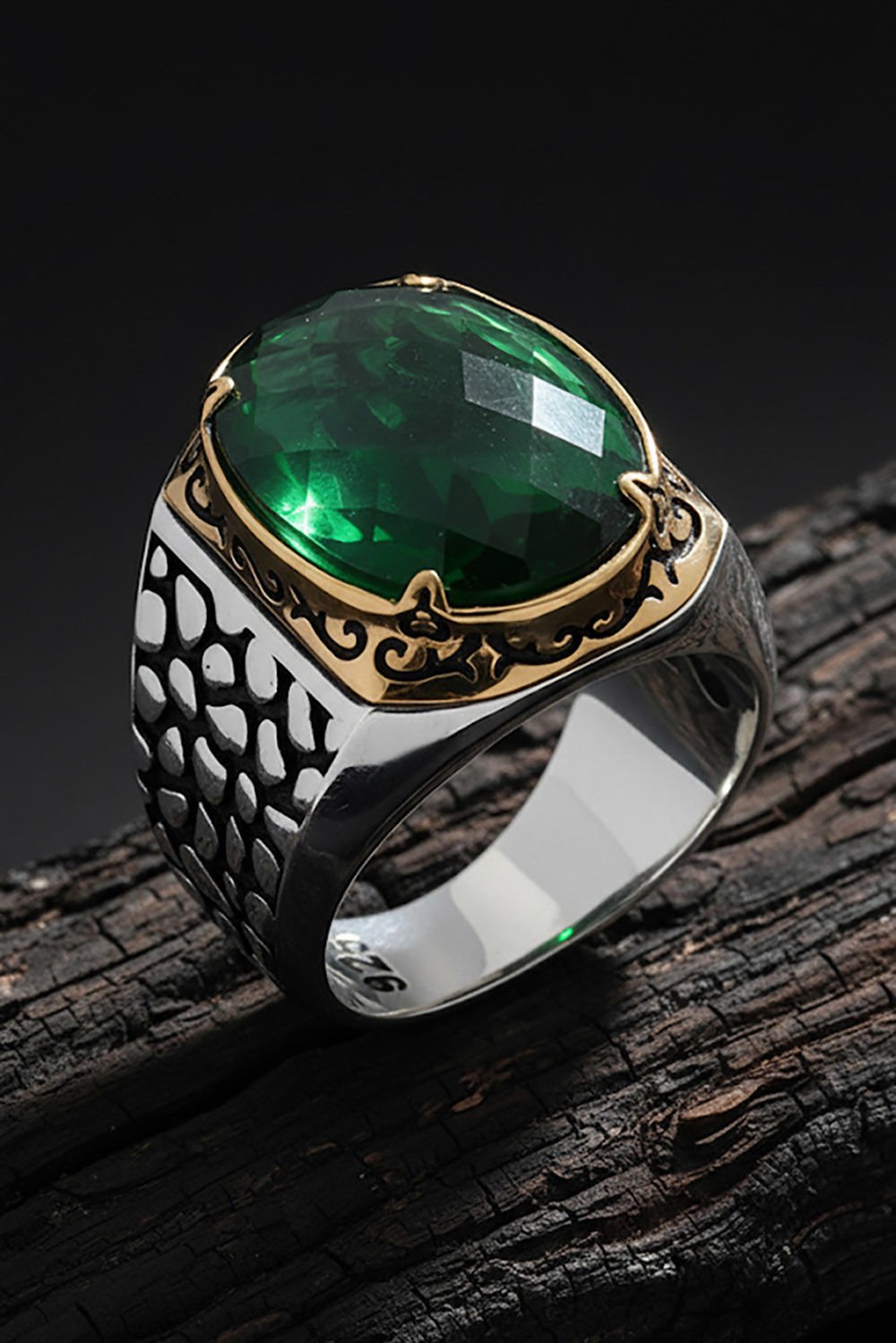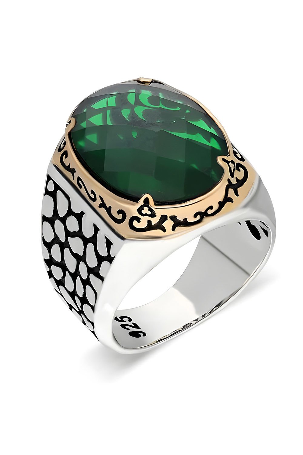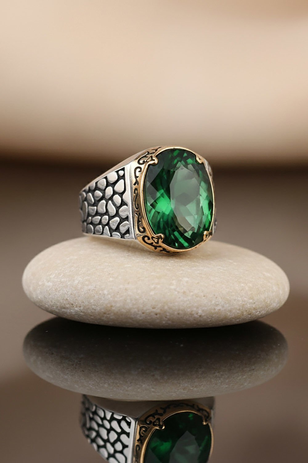 Bu özel erkek yüzüğü, doğal yeşil zirkon taşı ve 925 ayar gümüş ile özenle tasarlanmıştır. Benekli modeli ve özel işçilik detaylarıyla dikkat çeker.