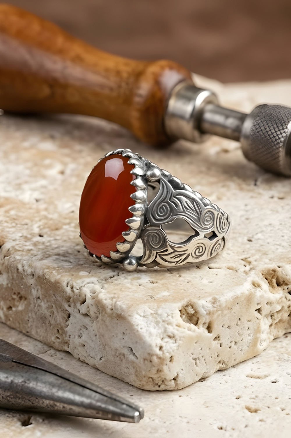 Bora Model El İşi Akik Taşlı Gümüş Yüzük |
