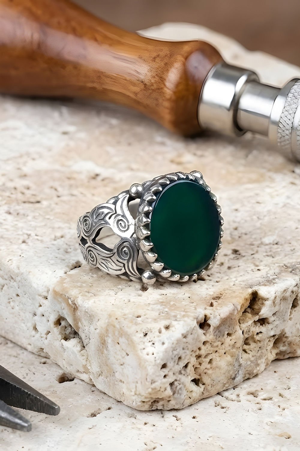 Bora Model El İşi Yeşil Akik Taşlı Gümüş Yüzük |