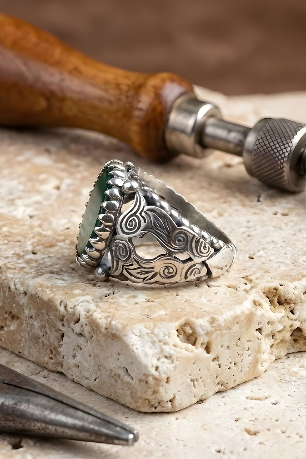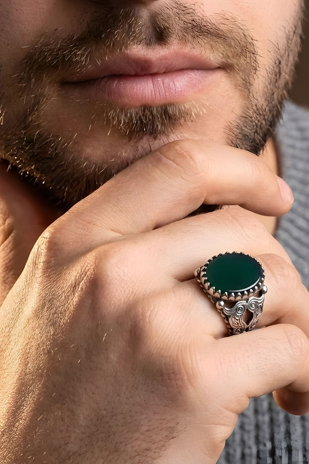 Modern hatların geleneksel el işçiliğiyle mükemmel uyumu: Bora Model El İşi Yeşil Akik Taşlı Gümüş Yüzük. Dinamik tasarımı ve 18x18 mm boyutundaki geniş taş yüzeyi ile dikkat çeken bu özel tasarım, tarzında hem güç hem de ferahlık arayan erkekler için üretildi. Tamamen el işçiliği ile hayat bulan Bora model, parmağınızda bir aksesuardan çok daha fazlasını, bir karakteri temsil eder.
