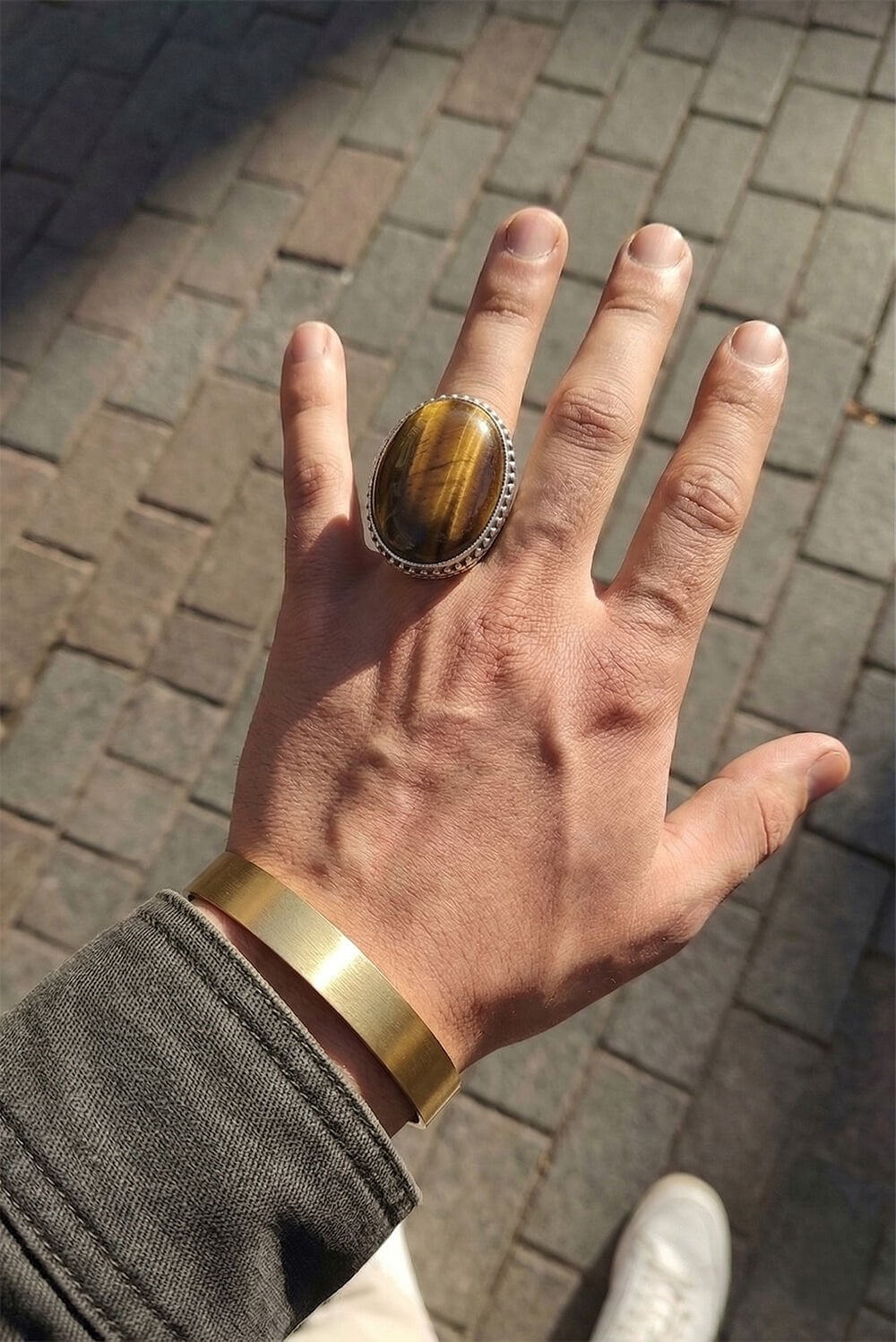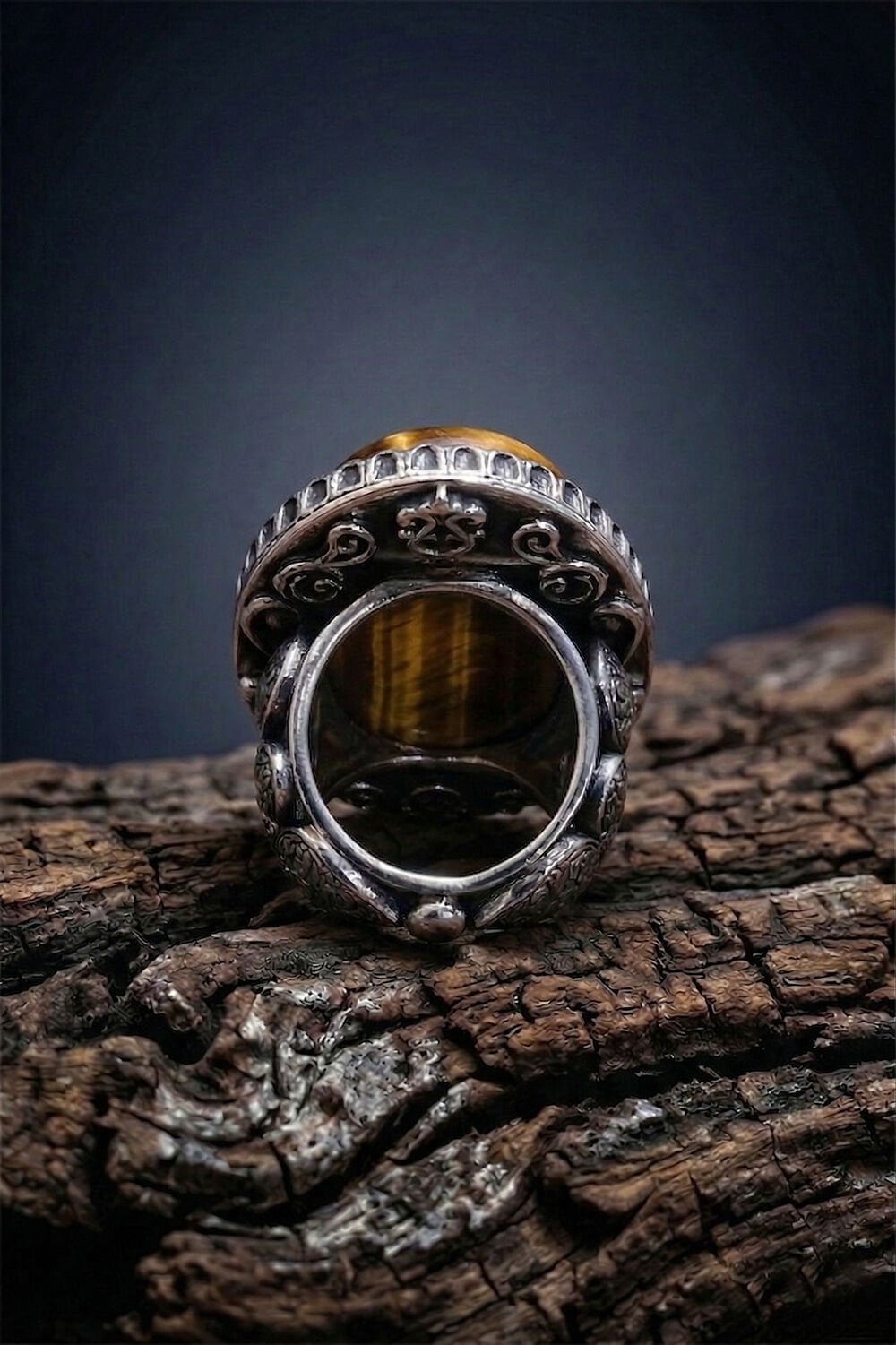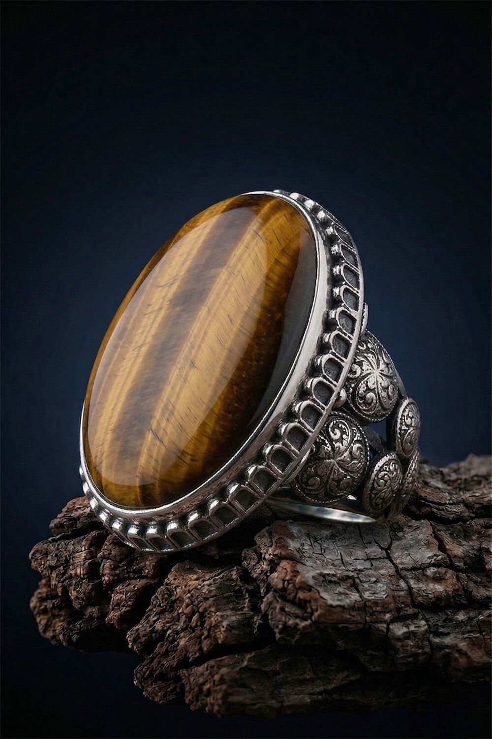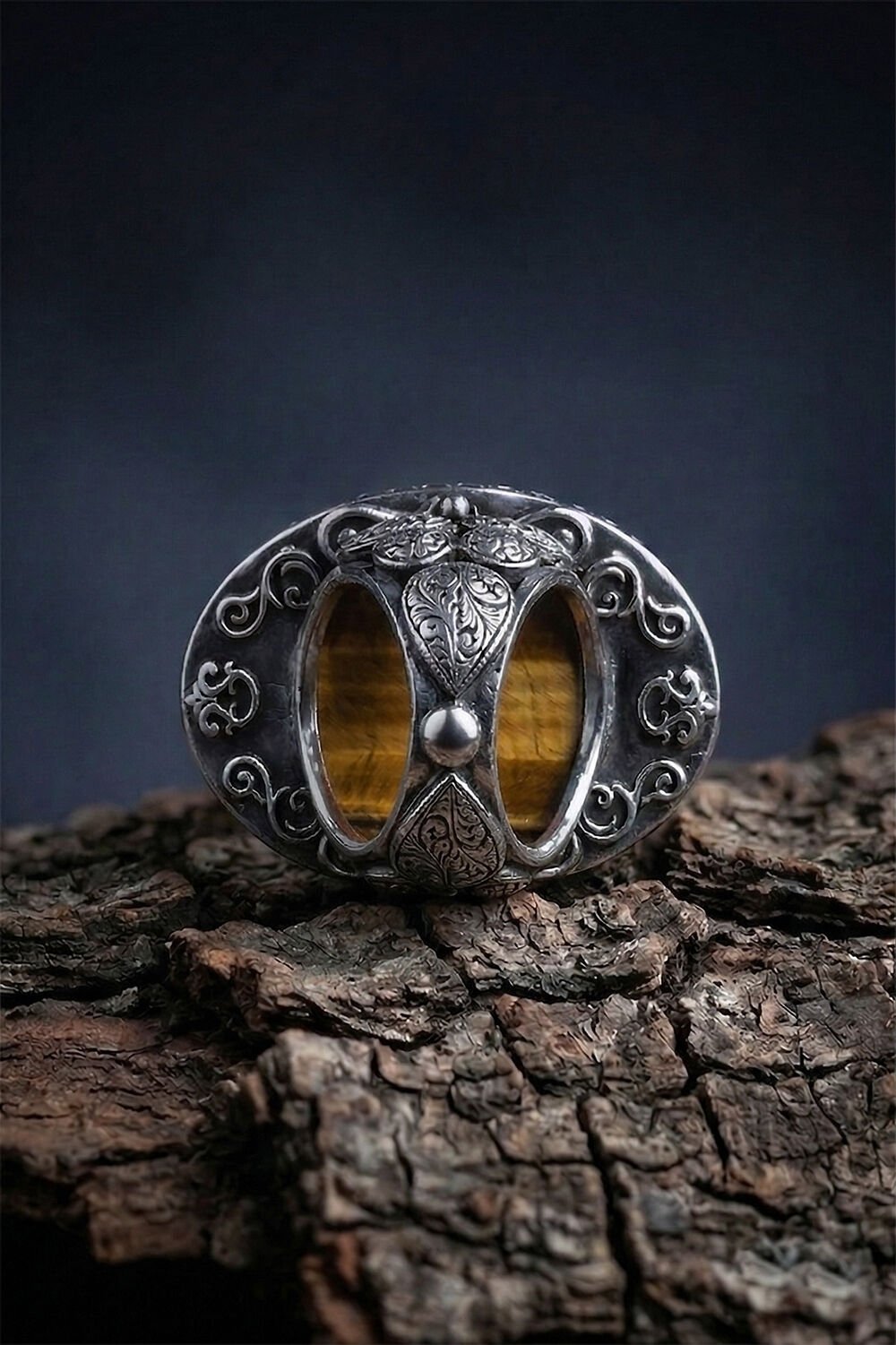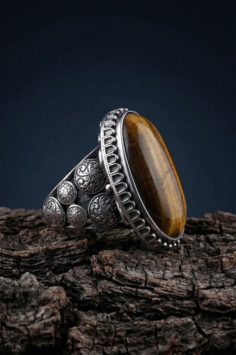 Yüzüğün yan kısımlarında yer alan ince kalem işçiliği ve geleneksel motifler, modern erkeğin tarzına otantik bir dokunuş katıyor. Kaplangözü taşının odaklanmayı artıran ve cesaret veren enerjisi, bu özel tasarımın ruhuyla birleşti.