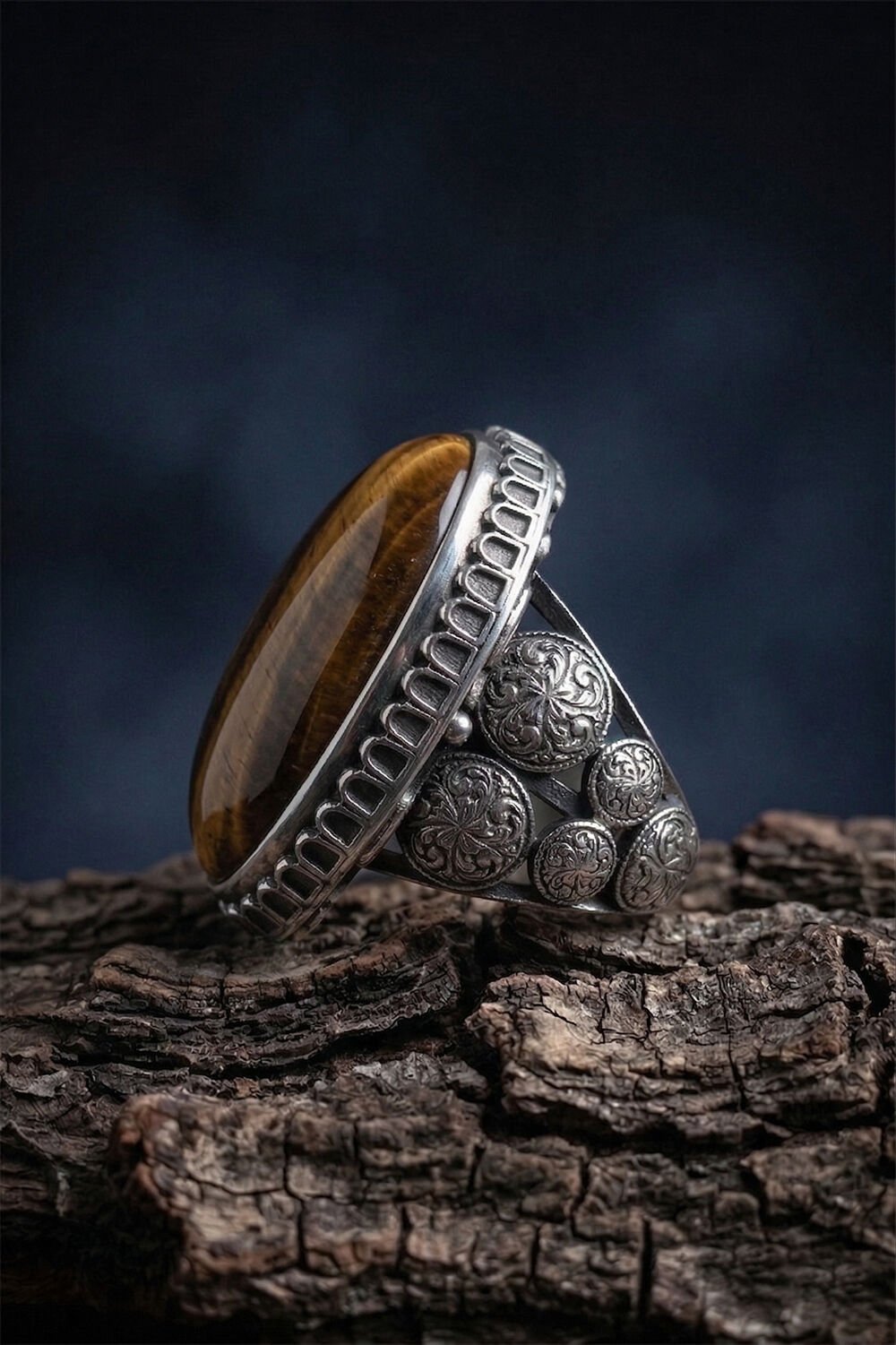 925 Ayar Gümüş Büyük Boy Kaplangözü Taşlı El İşçiliği Özel Tasarım Erkek Yüzük