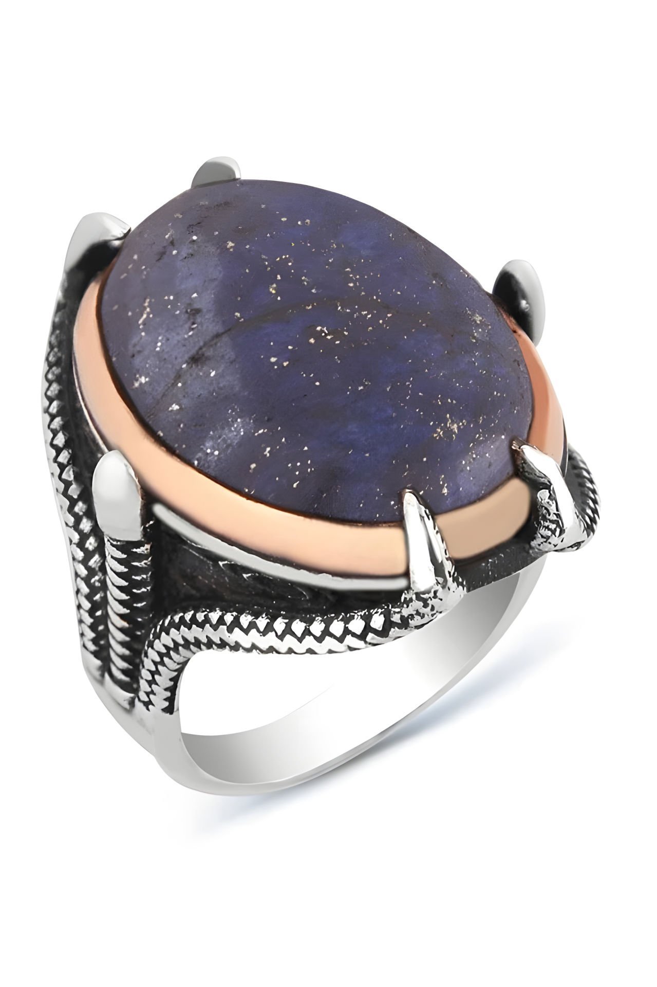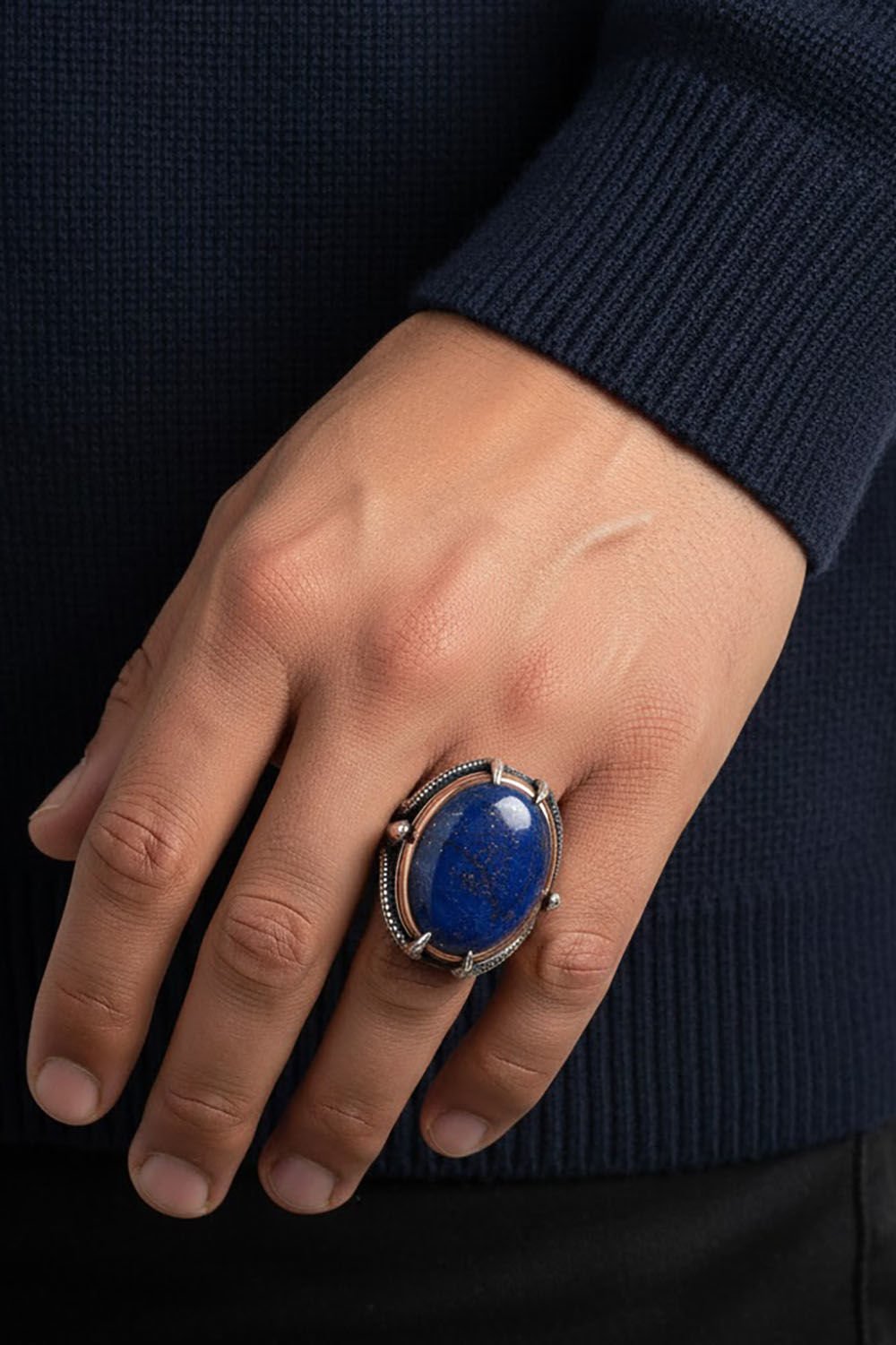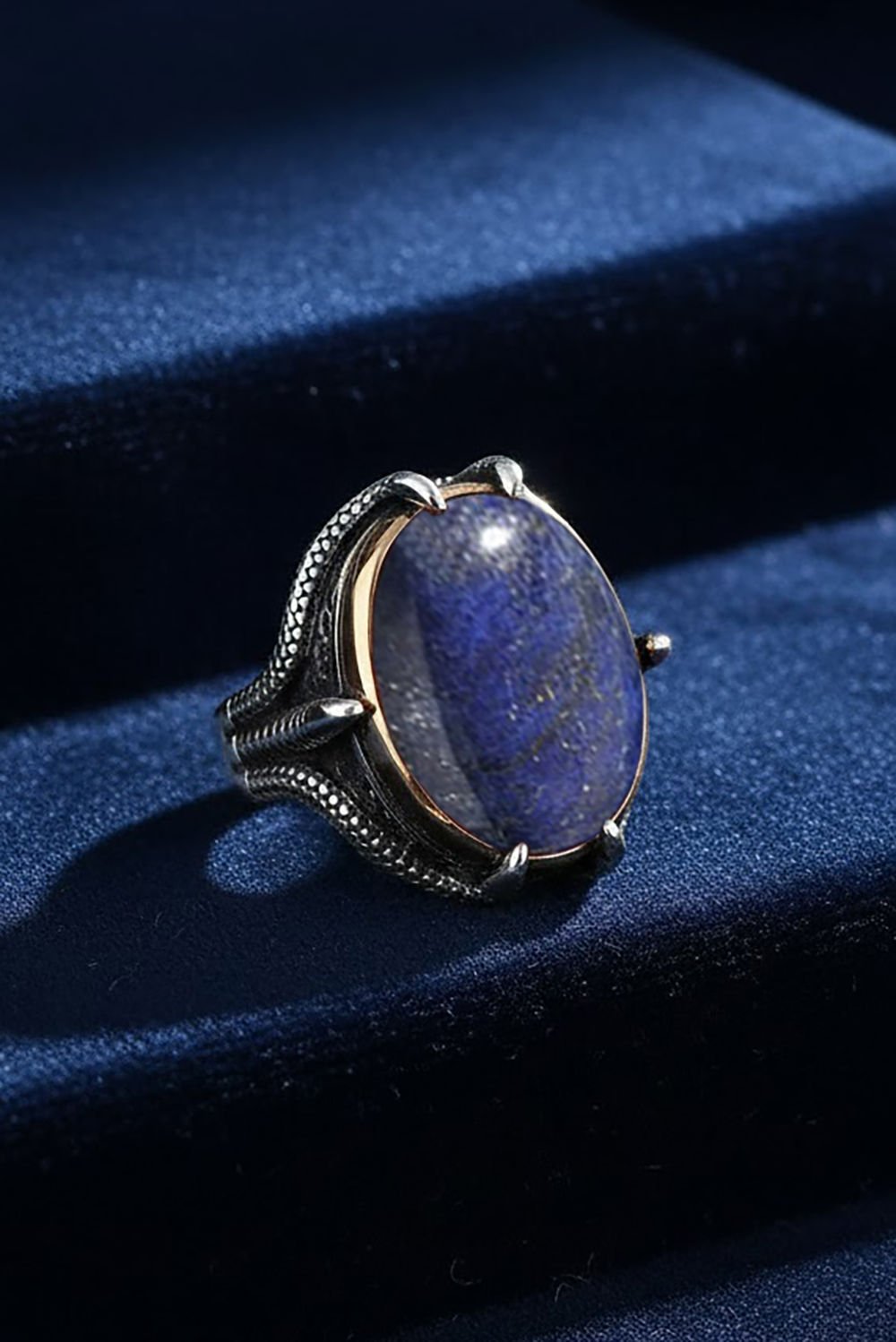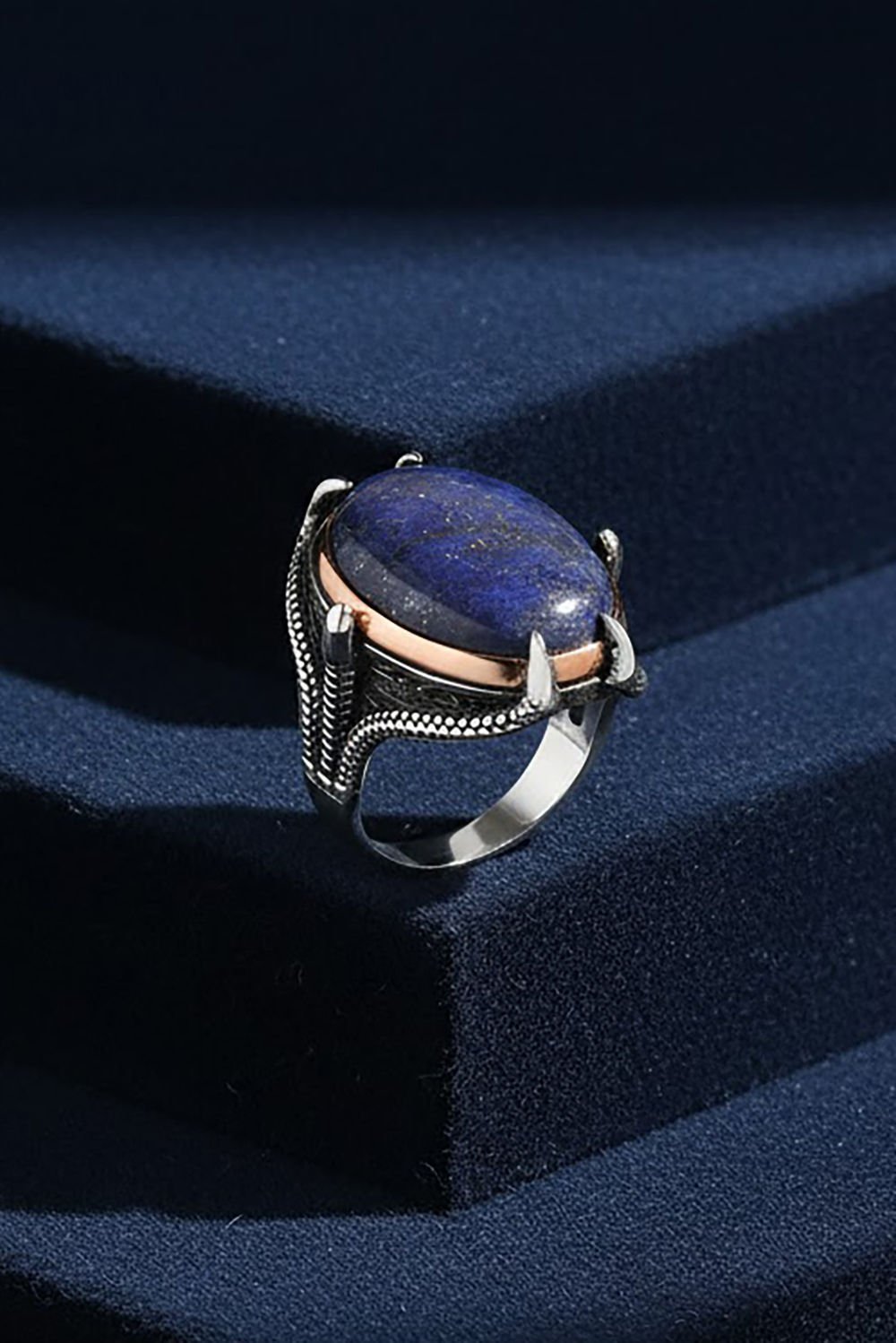 Bu göz alıcı yüzük, doğal lapis lazuli taşıyla işlenmiş ve usta el işçiliği ile özenle tasarlanmıştır. Özel işçilik ve büyük boyuyla dikkat çeken bu yüzük, pençe modeliyle benzersiz bir görünüm sunar.