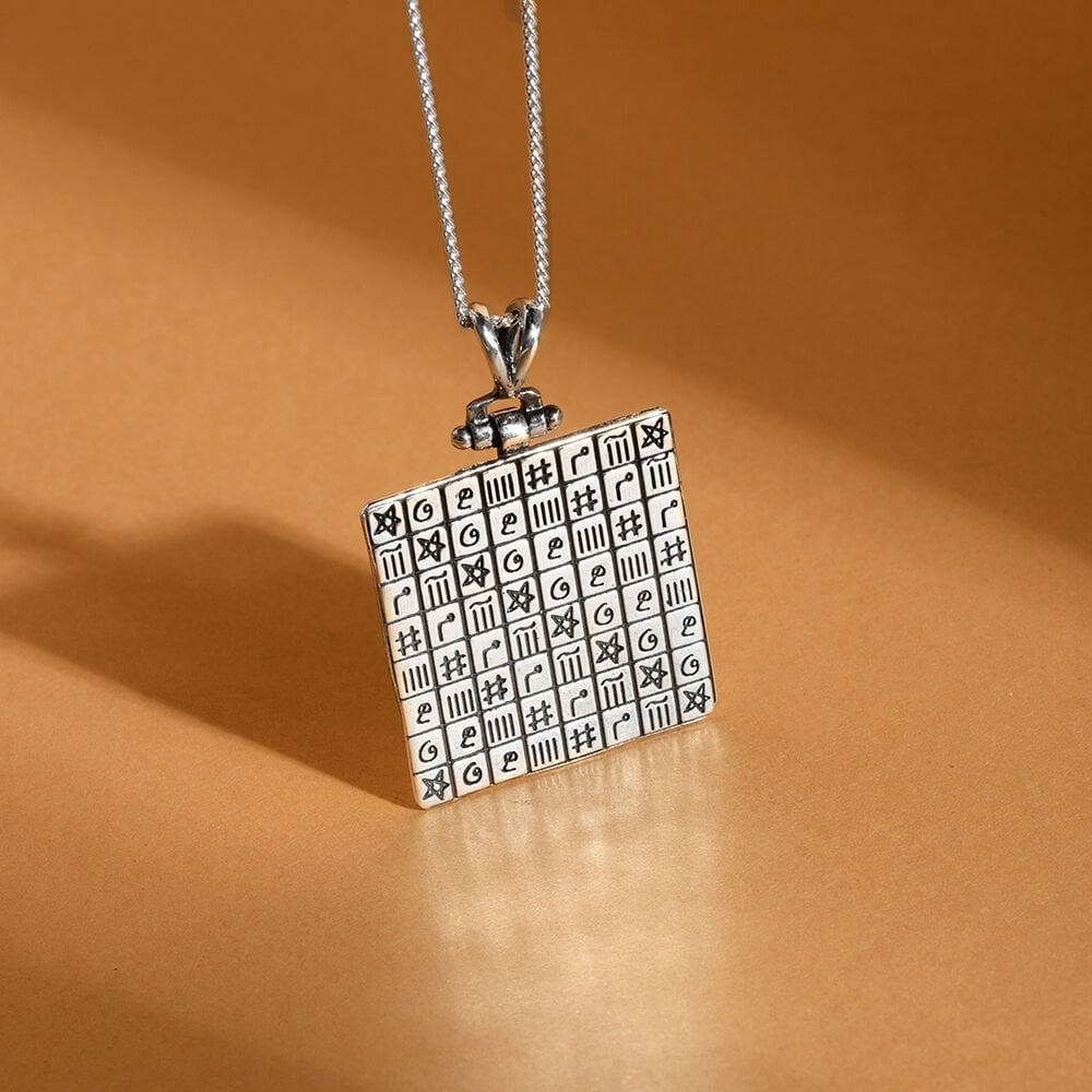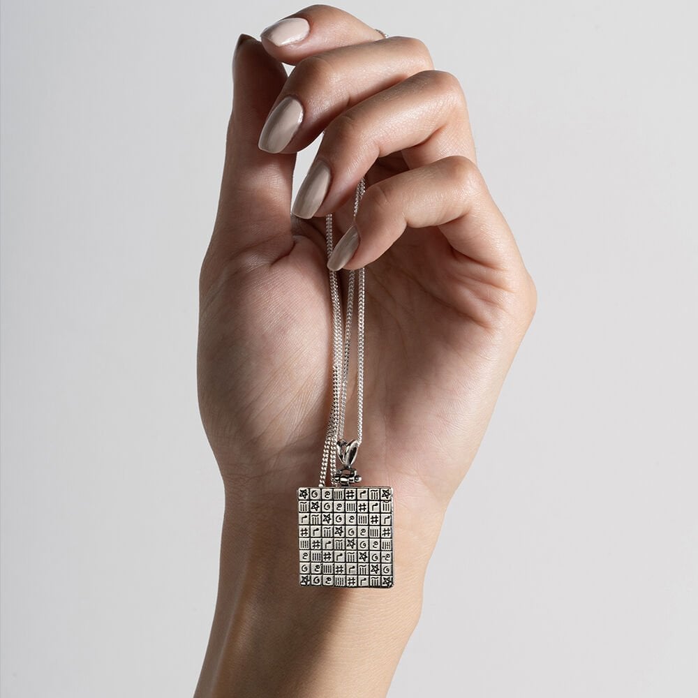 Minimal tasarım ve el işçiliğinin eşsiz uyumuyla öne çıkan bu celcelüti-ye vefki kazımalı kolye, zarafetin ve mistisizmin birleşimini temsil ediyor. 925 ayar gümüşten özenle işlenmiş ve özel bir işçilikle tasarlanmıştır.