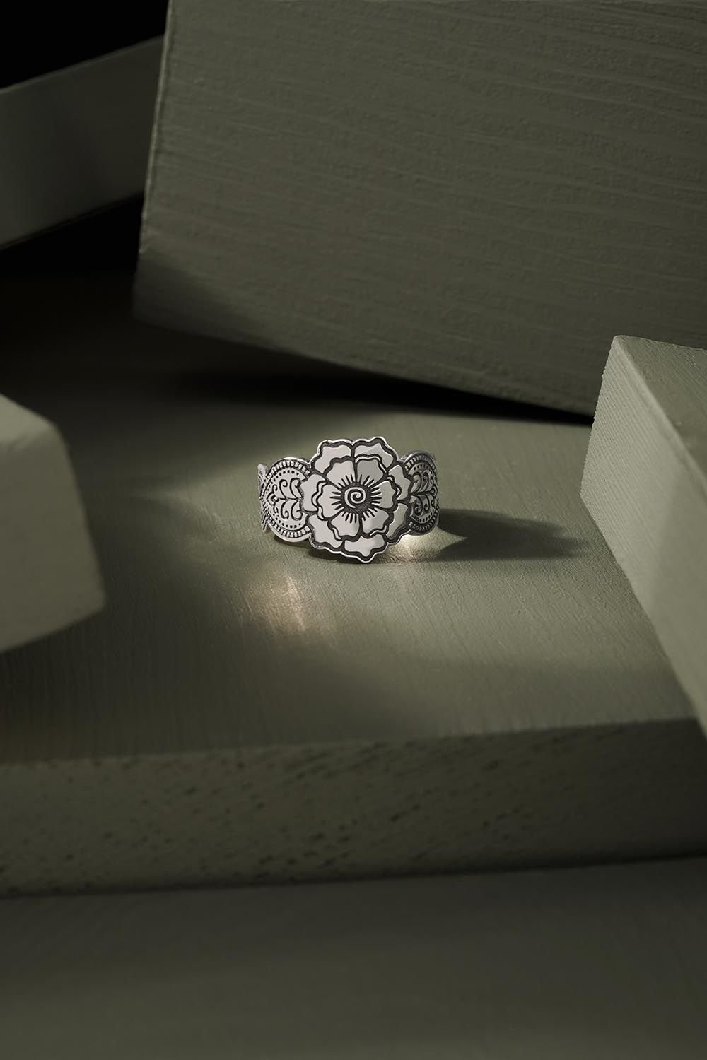 Çiçek Desenli Ayarlanabilir Gümüş Yüzük