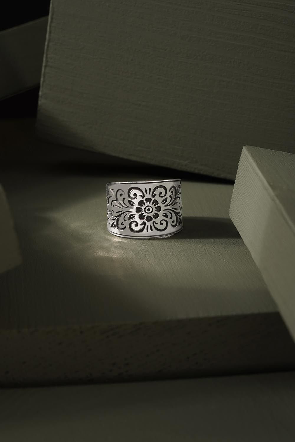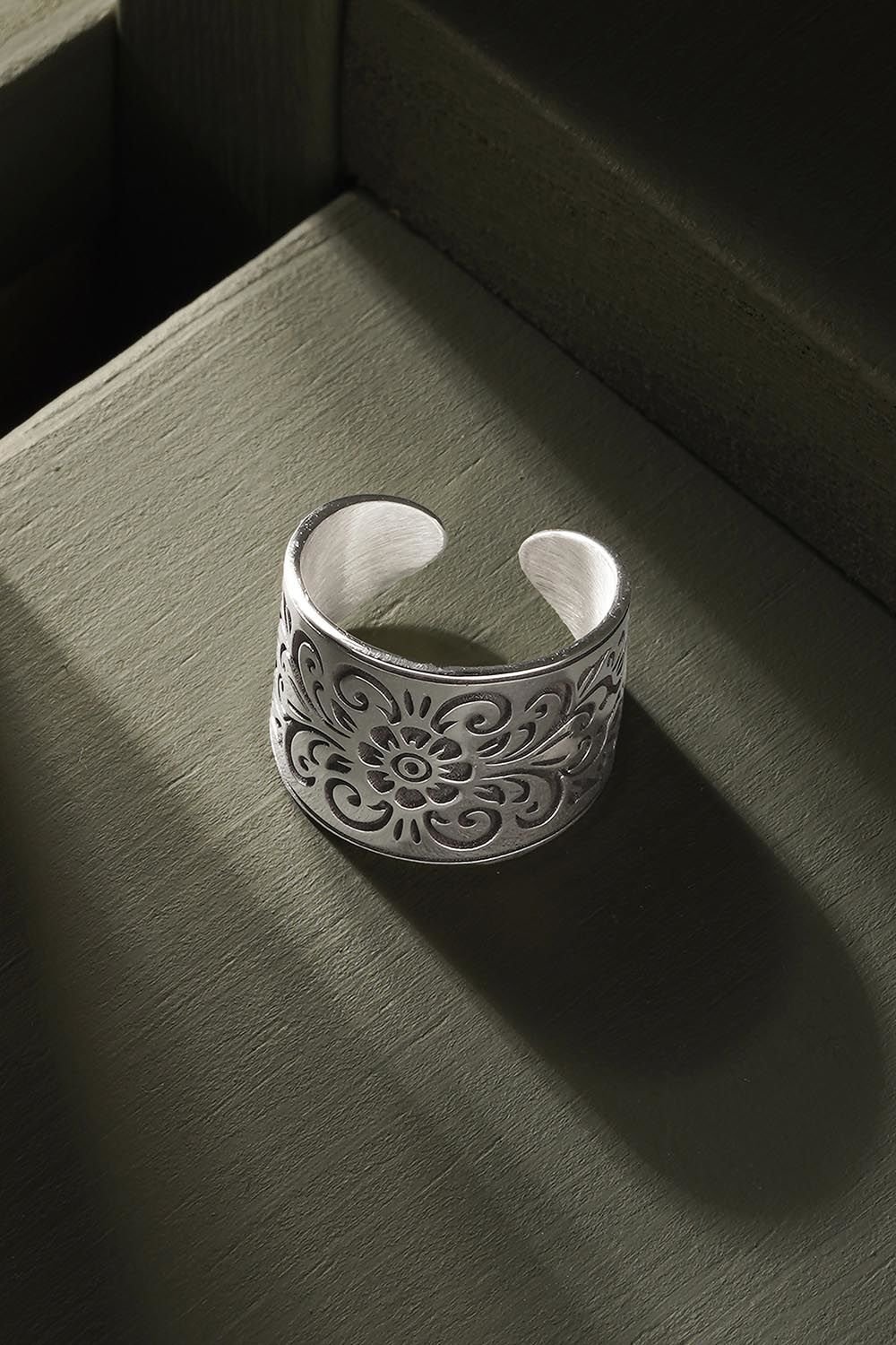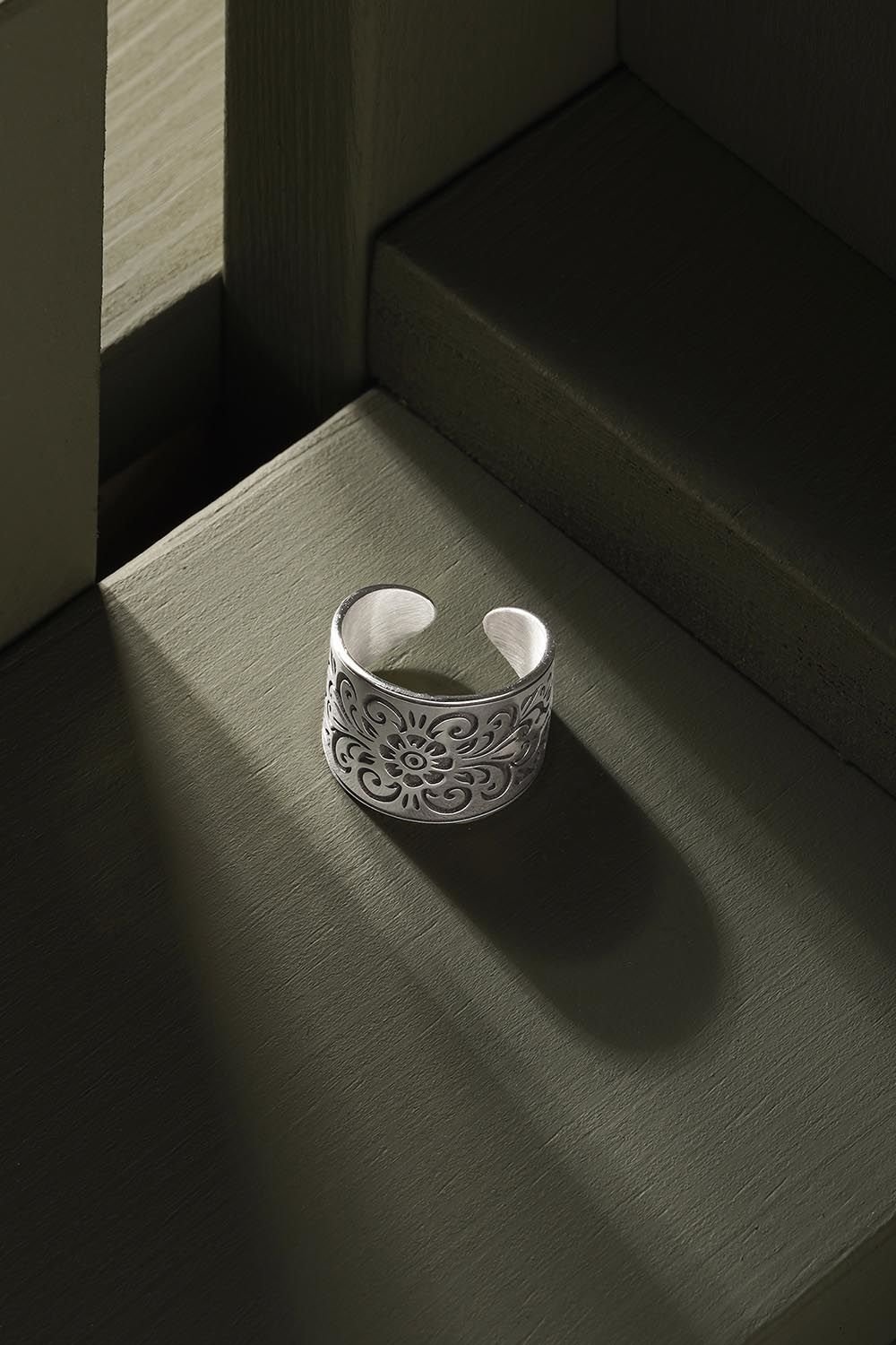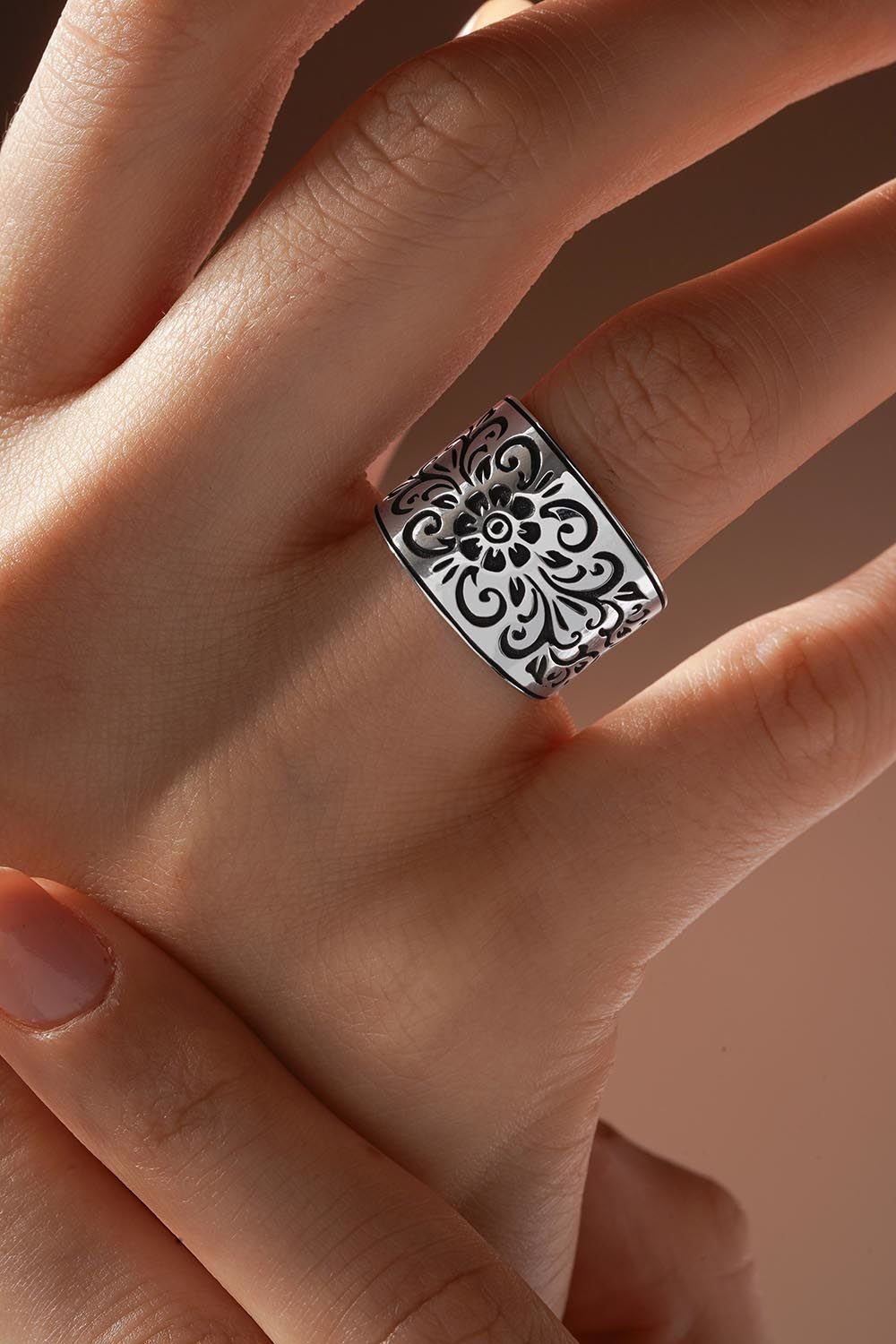 Kalem İşçiliği Zarafeti: Çiçek motiflerinin ince işçiliği, yüzüğe antik bir mücevher havası katar. Hem etnik hem de modern kombinlerle eşsiz bir uyum sağlar.