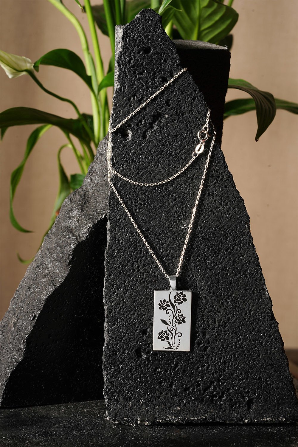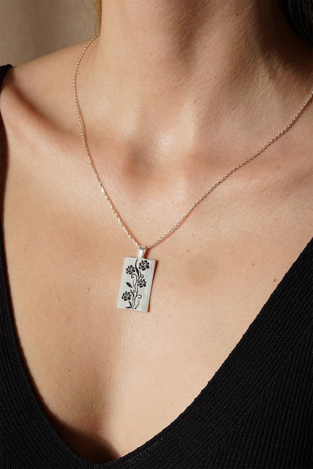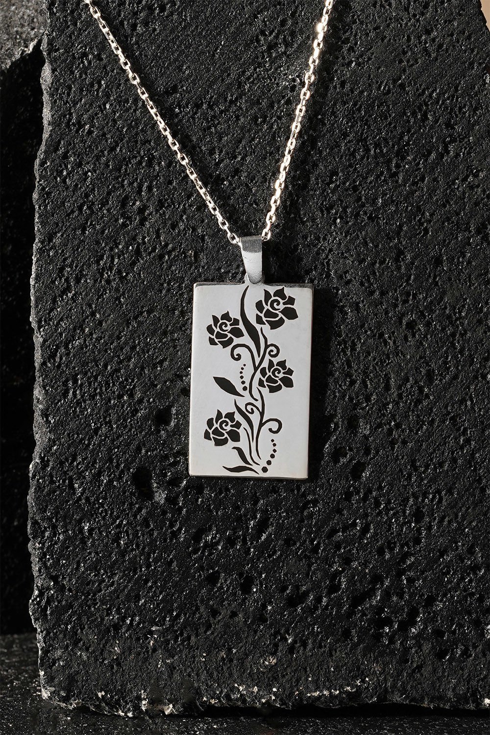 Bu siyah mineli çiçek desenli kadın kolye, zarifliği ve şıklığı ile dikkat çekiyor. 925 ayar gümüşten yapılmış olan bu özel kolye, özenle işlenmiş çiçek motifleriyle süslenmiştir. Her detayıyla özgünlük taşıyan bu tasarım, kadınların günlük şıklıklarını tamamlamak için ideal bir seçenektir. Gündüzleri sade ve zarif bir görünüm sağlarken, geceleyin romantik bir hava katmak için mükemmel bir tercihtir. Siyah mine detaylarıyla zenginleştirilen bu kolye, hem kişisel kullanım hem de sevdikleriniz için özel bir hediye seçeneği sunar.