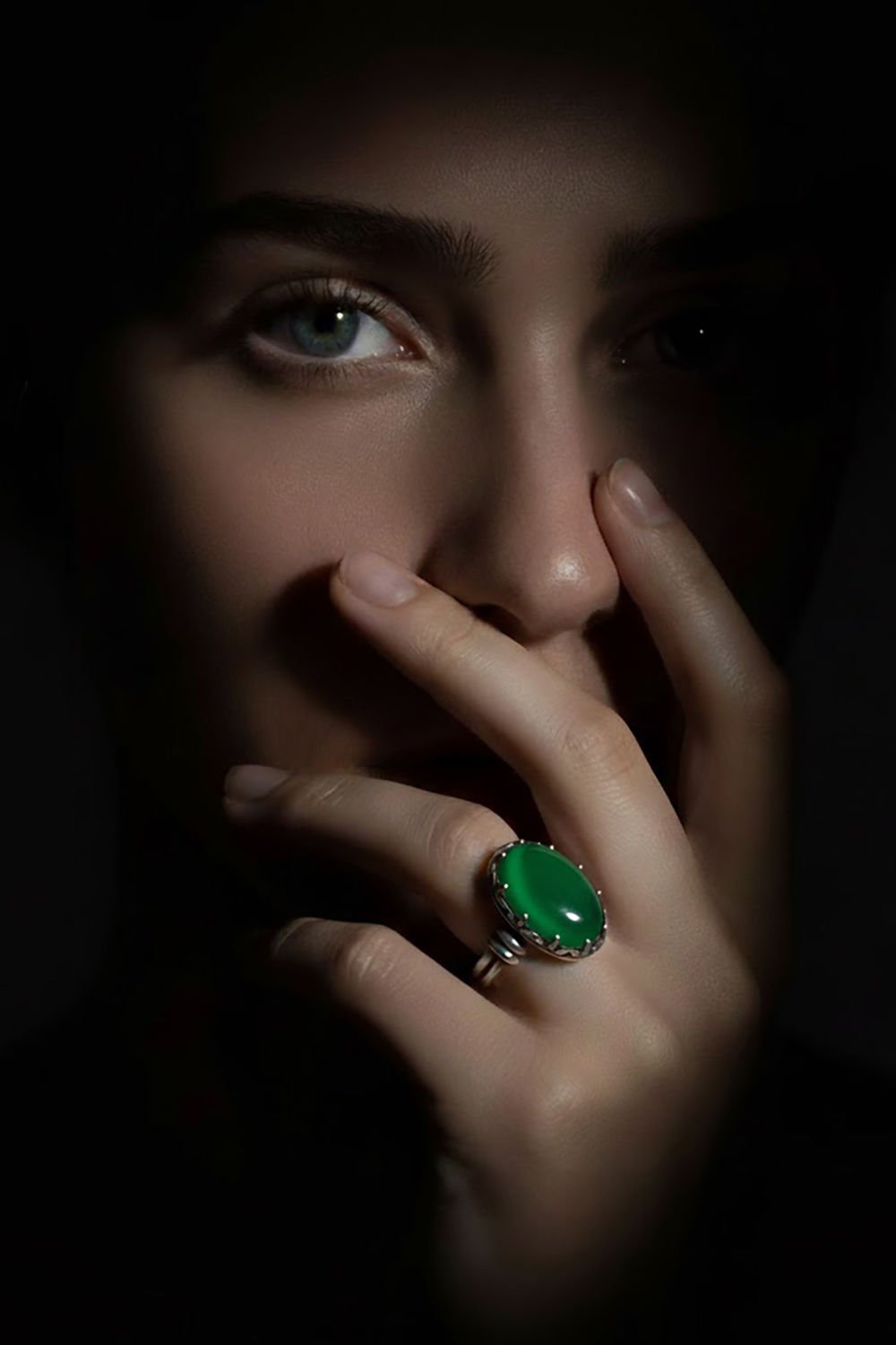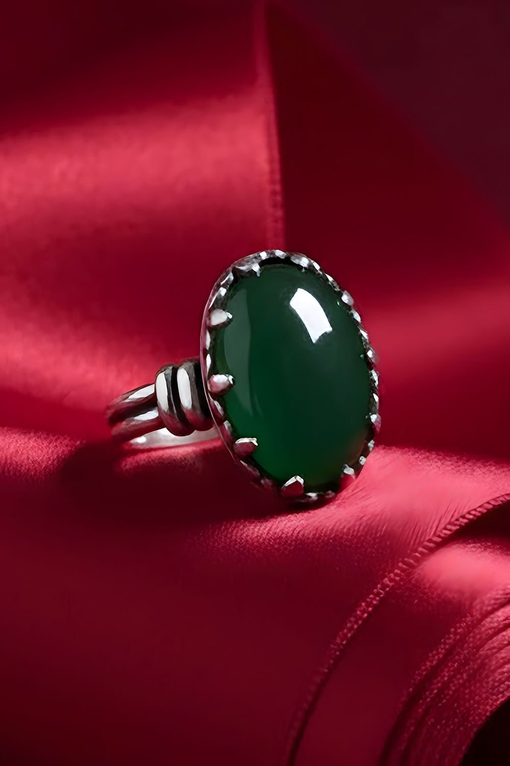 Orijinal yeşil akik taşının taze tonları, yüzüğe doğallık ve enerji katarken, 925 ayar gümüş yüzük, el işçiliği detaylarıyla özel bir atmosfer yaratıyor. Çift kol modeli, modern tasarımı ve gümüşün ışıltısıyla birleşerek bu yüzüğü benzersiz kılıyor.