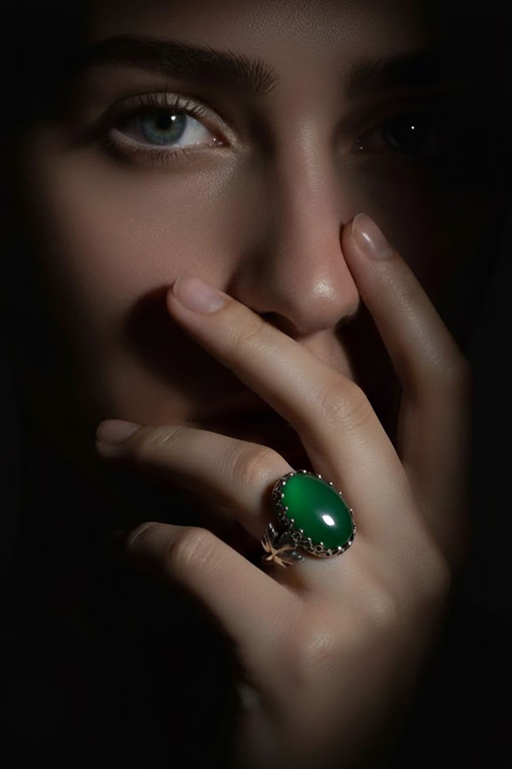 Natural yeşil akik taşının canlı tonları, yüzüğe özel bir karakter ve doğanın enerjisini katarken, gümüş yüzük, usta el işçiliği detaylarıyla özel bir atmosfer yaratıyor. Zarif kurdele modeli, modern tasarımı ve gümüşün zarafetiyle birleşerek bu yüzüğü benzersiz kılıyor.