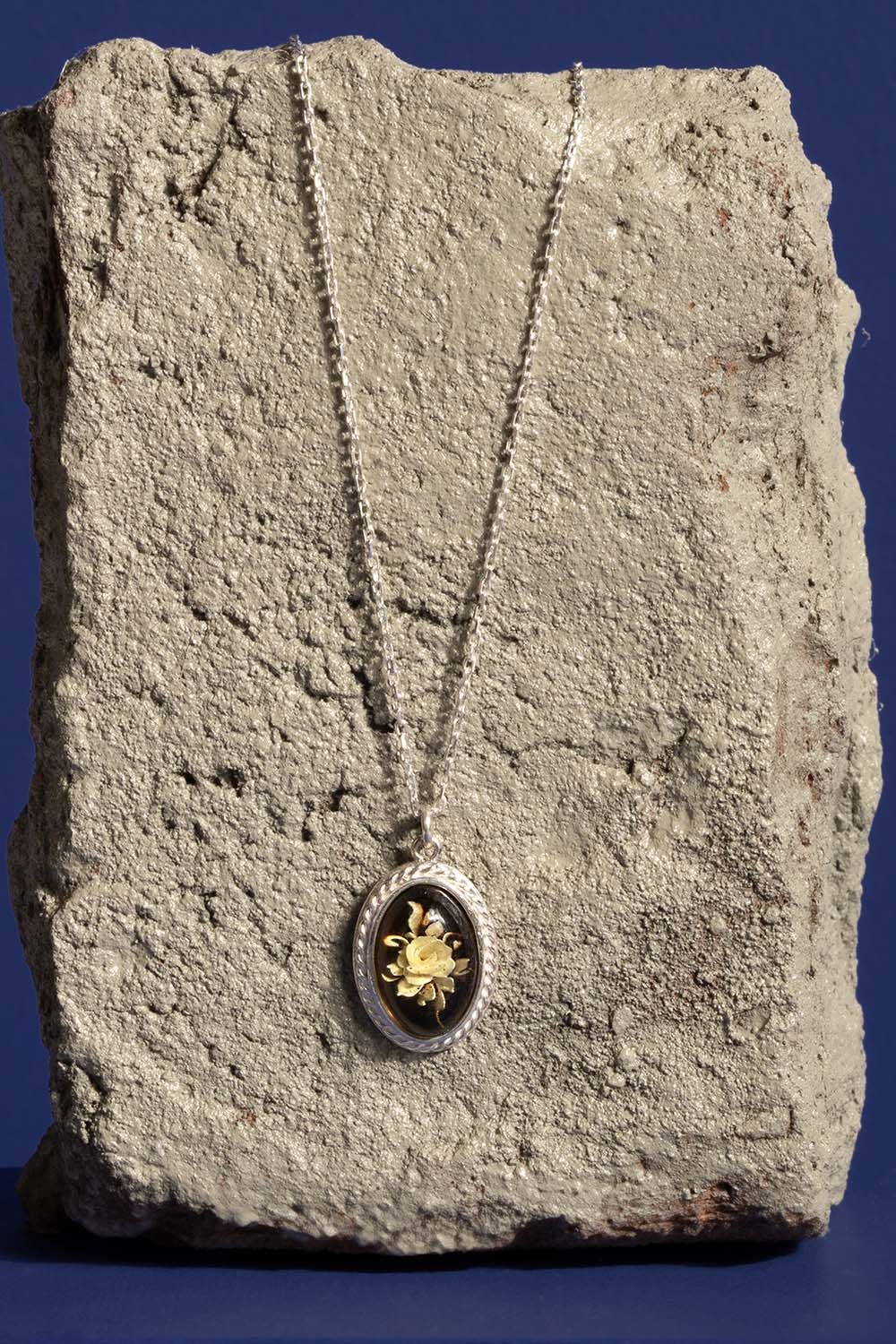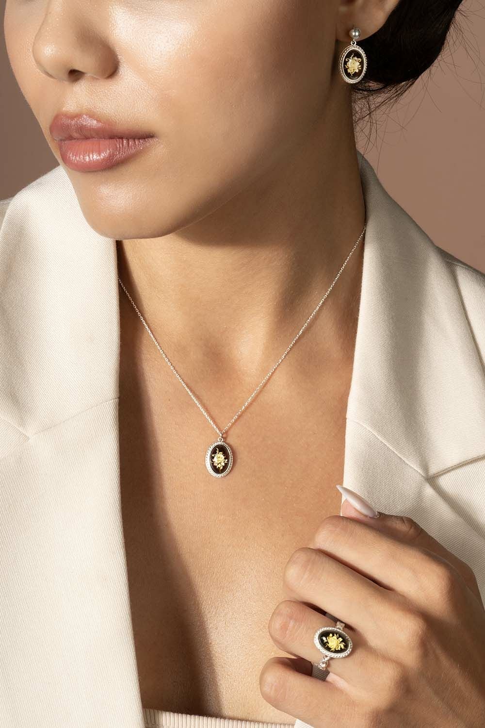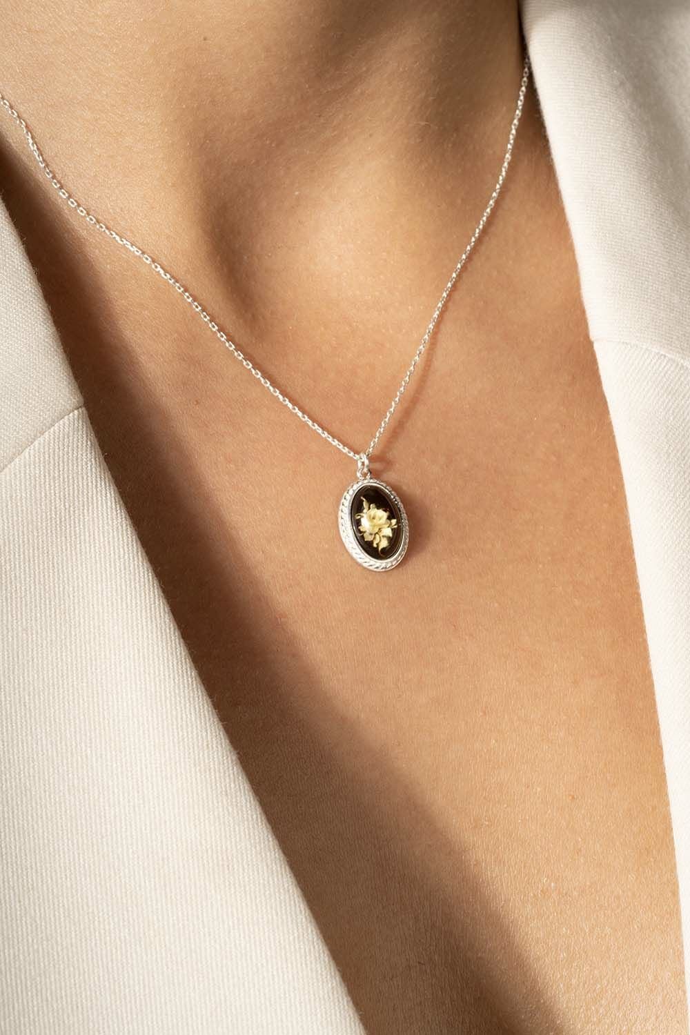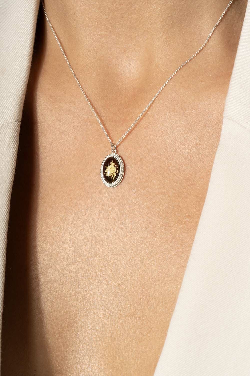 Damla Kehribar İçine Gül Desenli Minimal Gümüş Kolye |