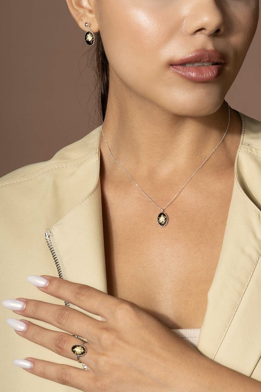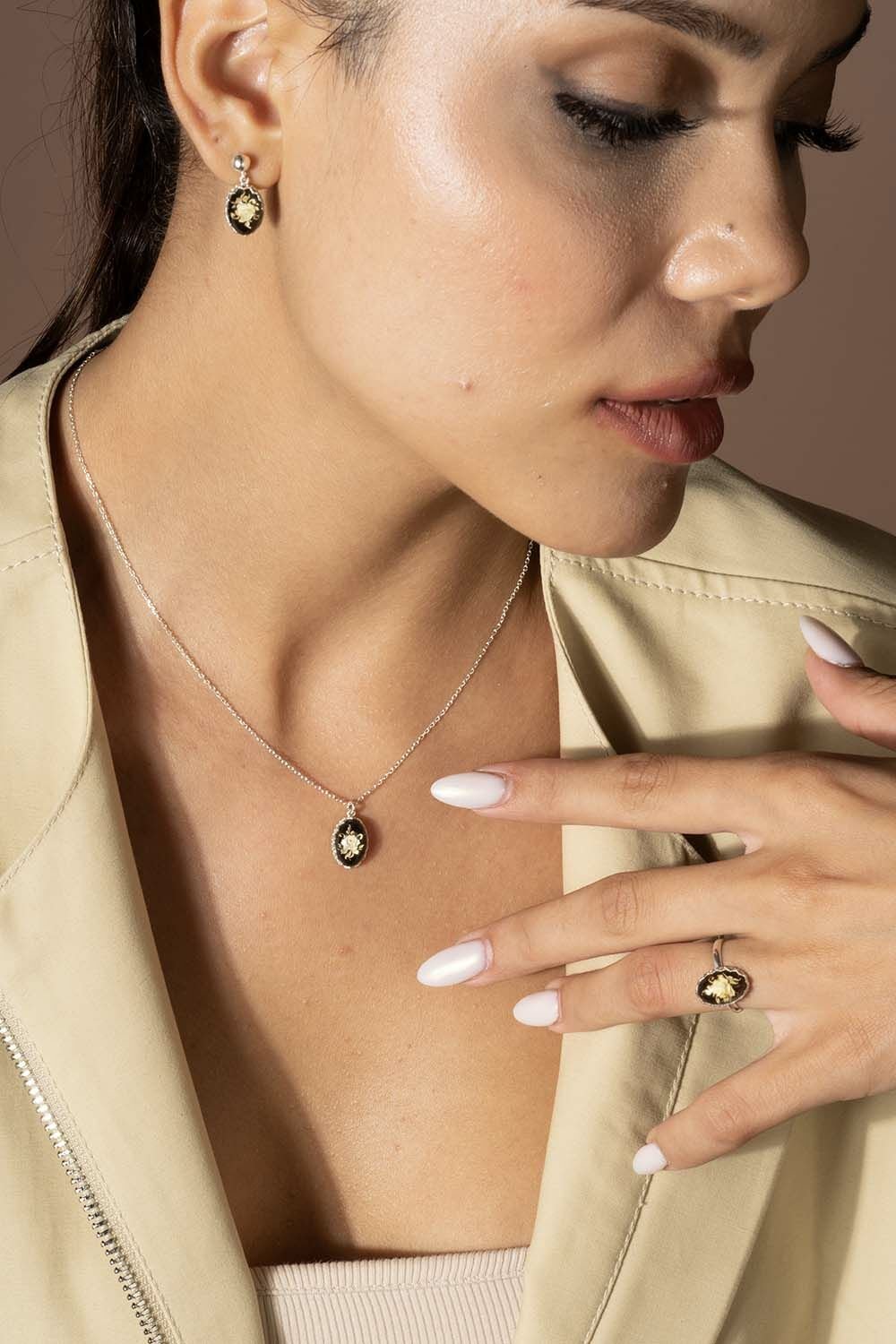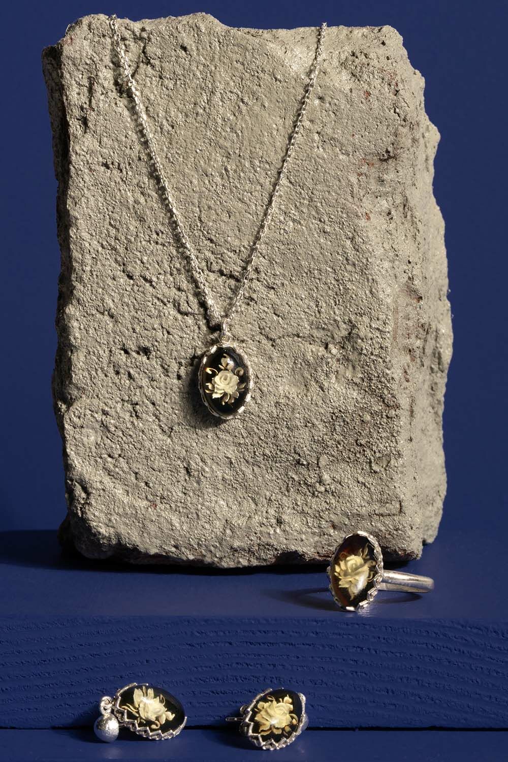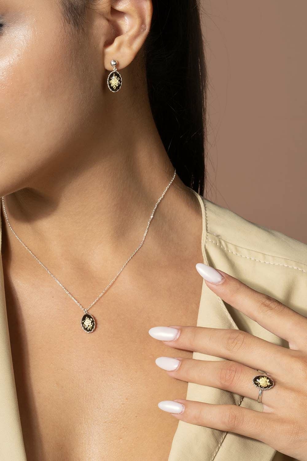 Damla Kehribar İçine Gül Desenli Minimal Gümüş Takı Seti