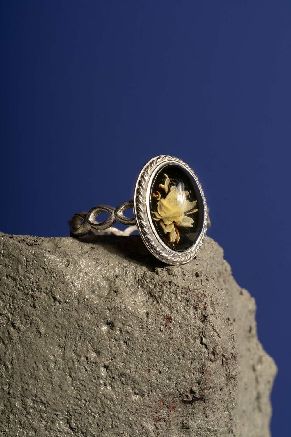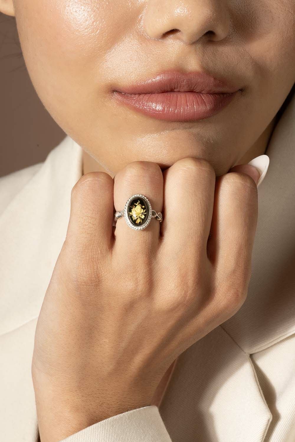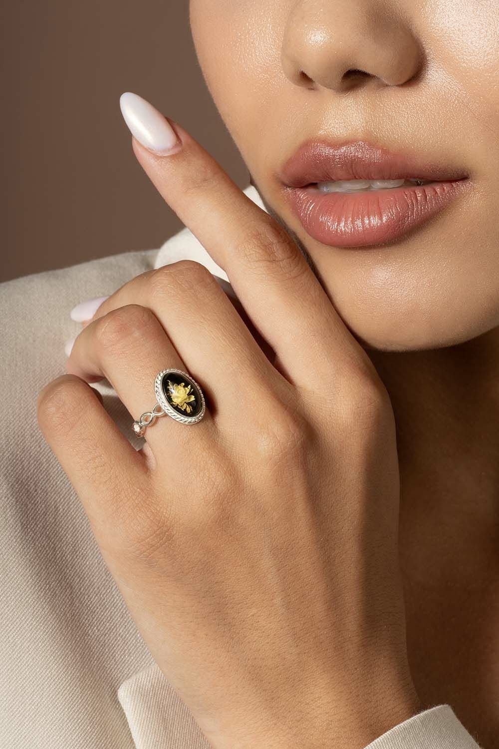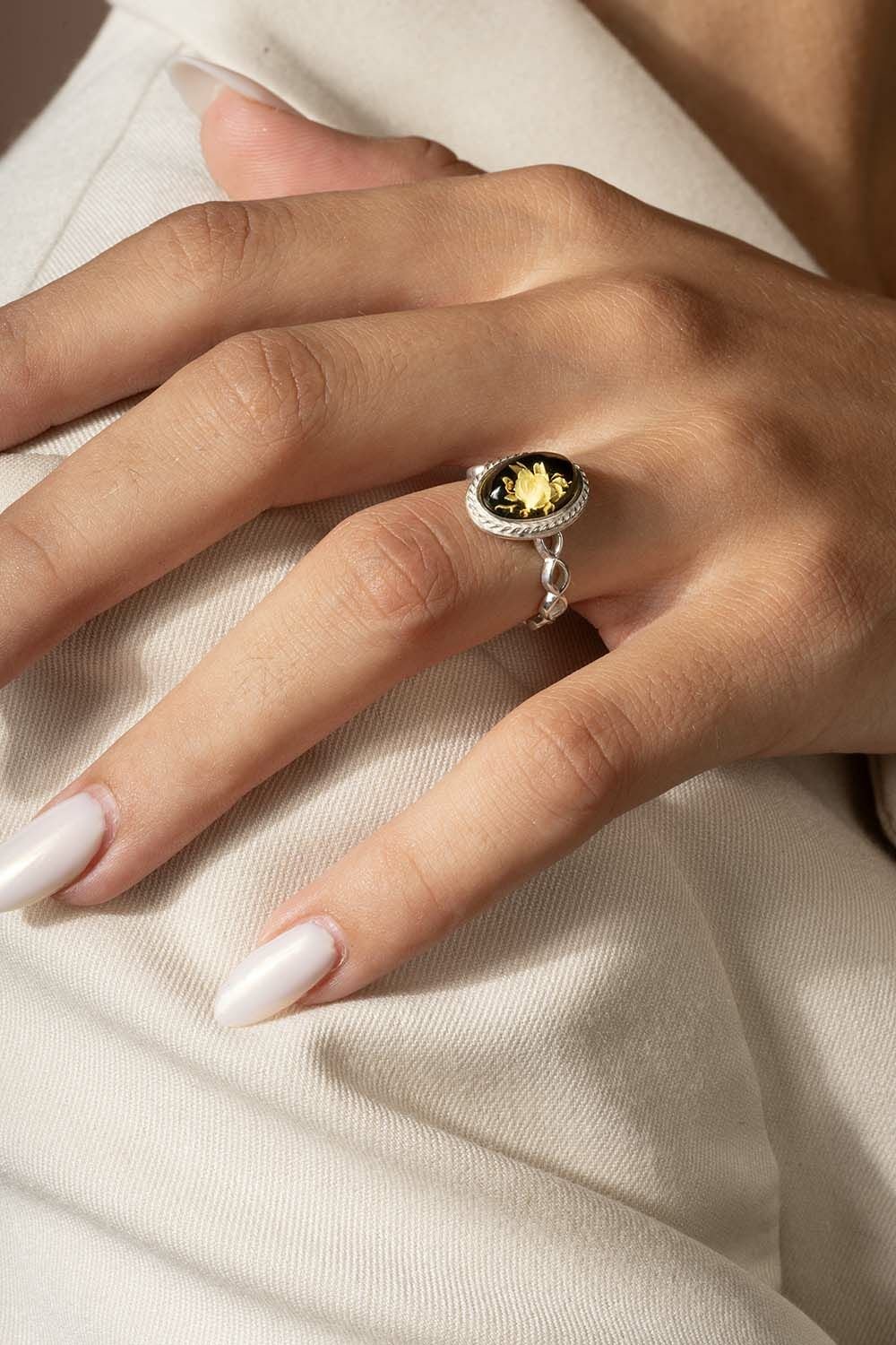Damla Kehribar İçine Gül Desenli Minimal Gümüş Yüzük |